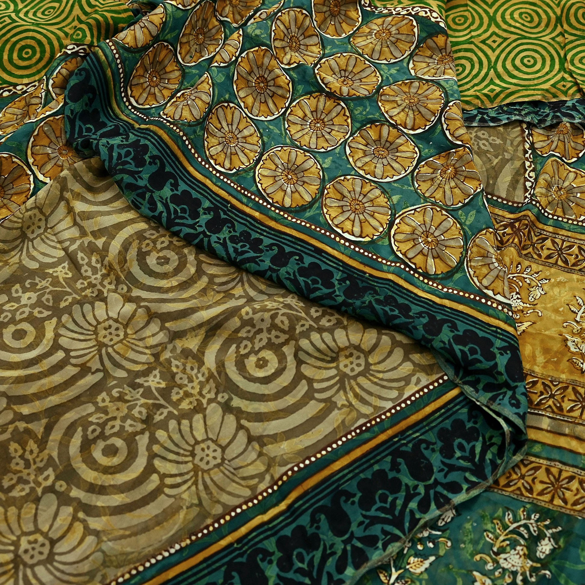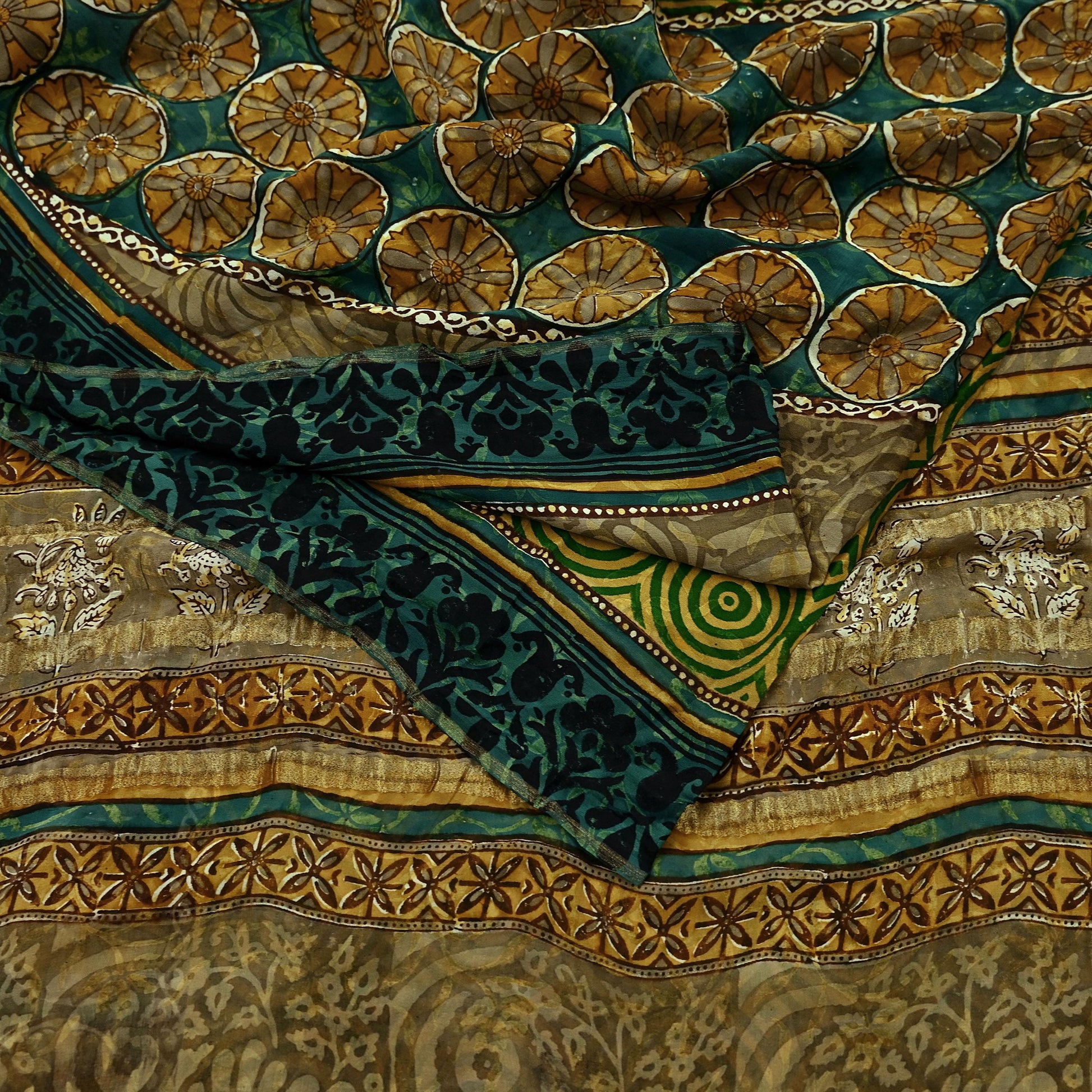 Indian Vintage Sari Green Pure Georgette Silk Block Printed Sarees Craft Fabric Sewing 5Yd Soft Zari Dress Making Crafting Quilting Upcycle
