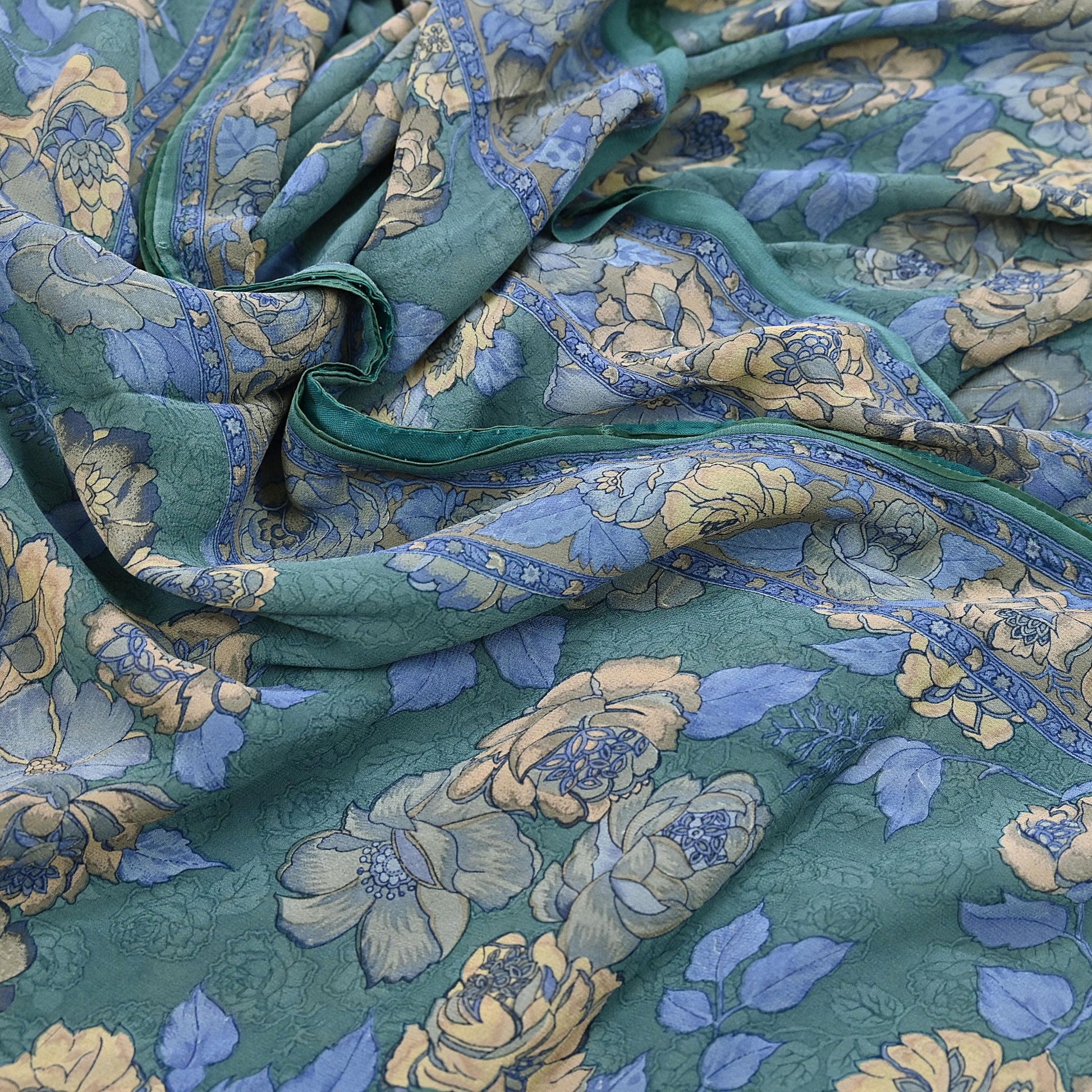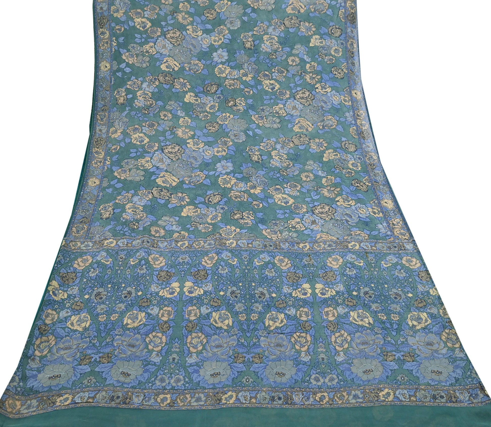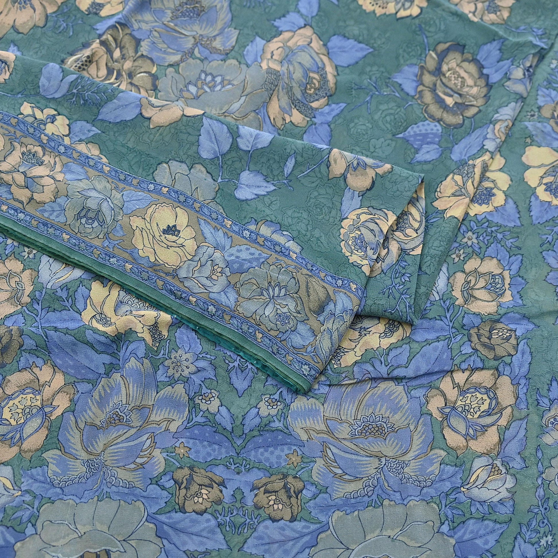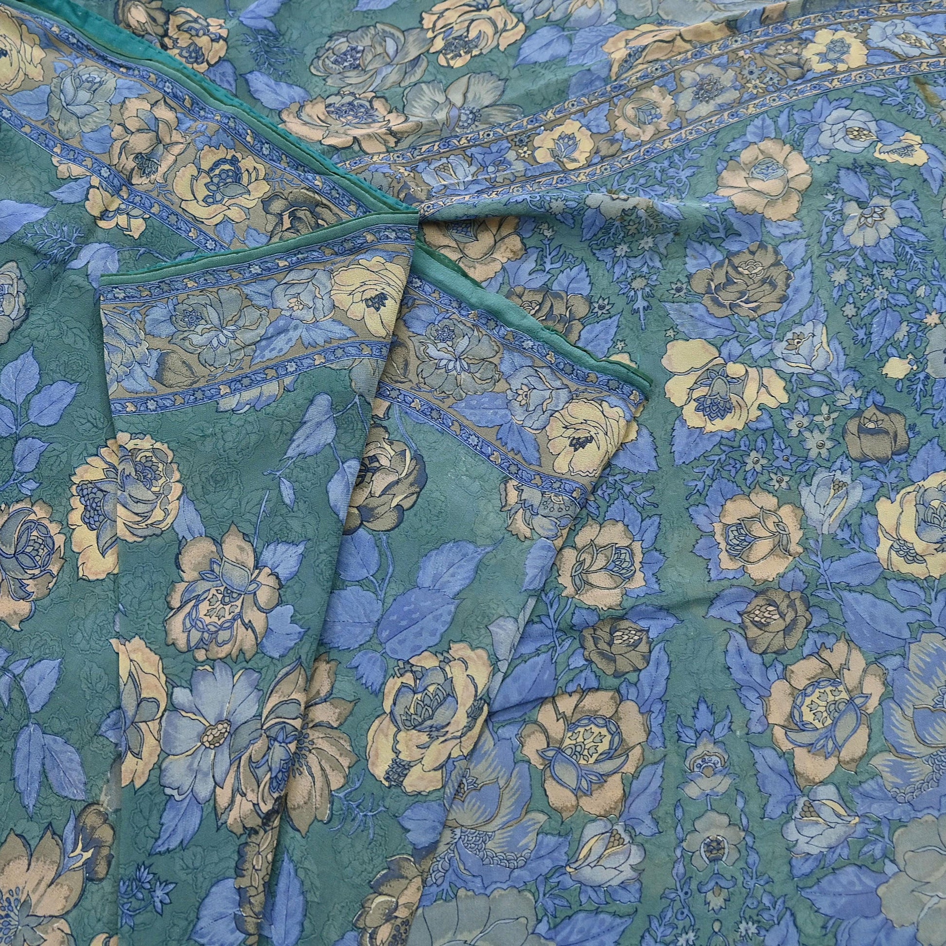 Indian Vintage Sari Green Pure Georgette Silk Printed Saree Craft Fabric Sewing 5Yd Soft Light Dress Making Crafting Quilting Upcycle