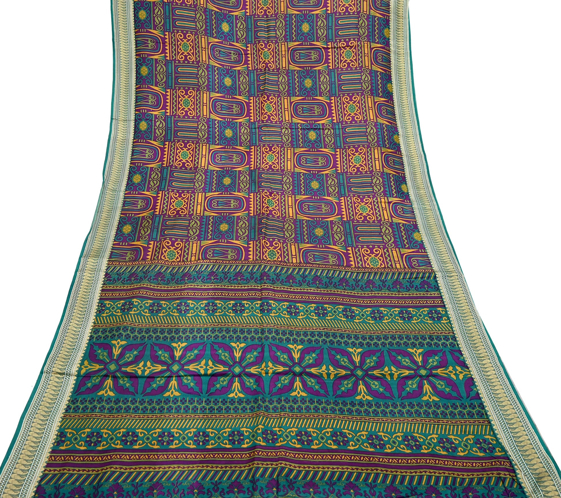 Indian Vintage Sari Green & Purple 100% Pure Silk Printed Sarees 5yd Sewing Craft Fabric Dress Making Soft Woven Border Upcycle Quilting
