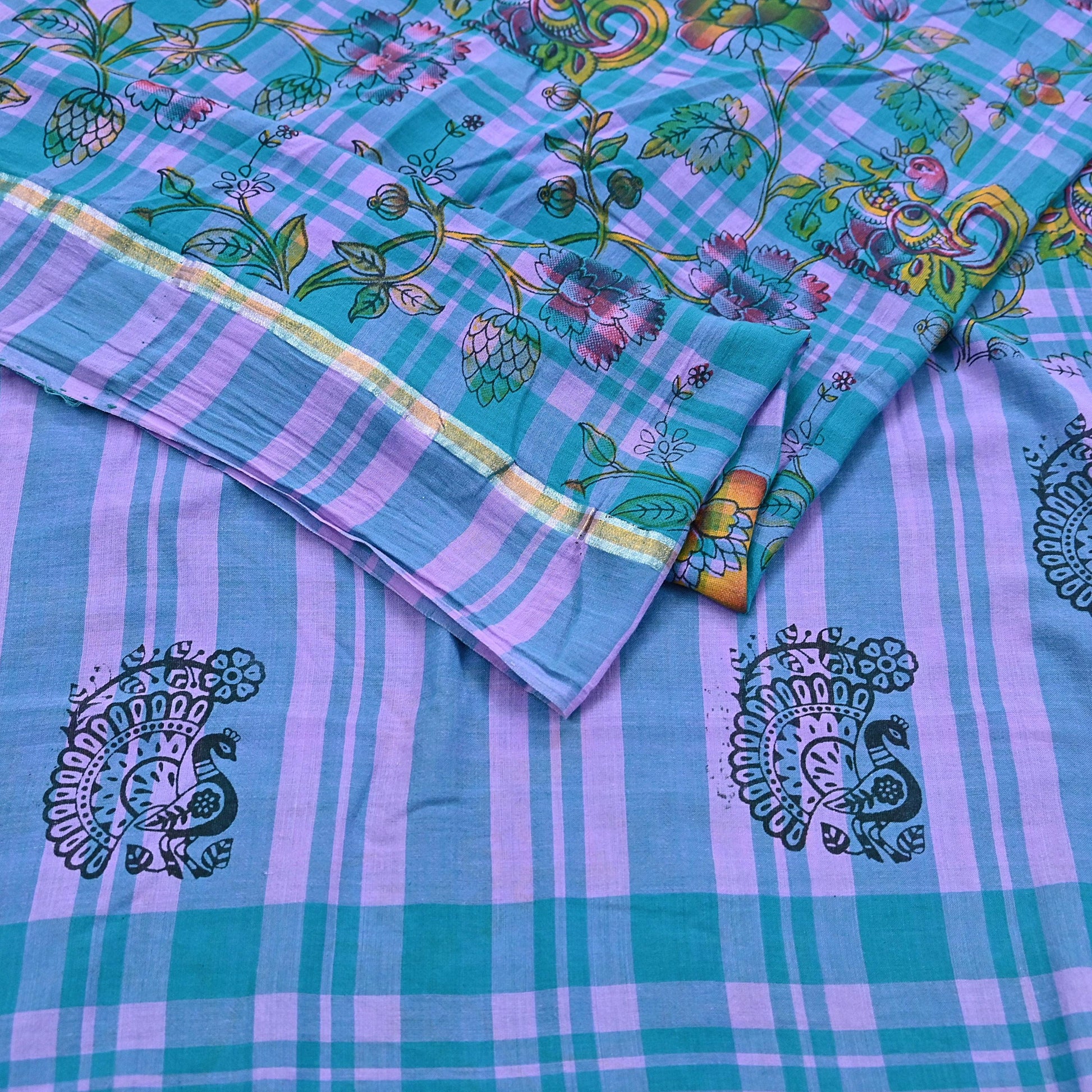 Indian Vintage Sari Green & Purple Printed 100% Pure Cotton Sarees Craft Fabric 5Yd Sewing Sarong Wrap Boho Quilting Crafting zari border