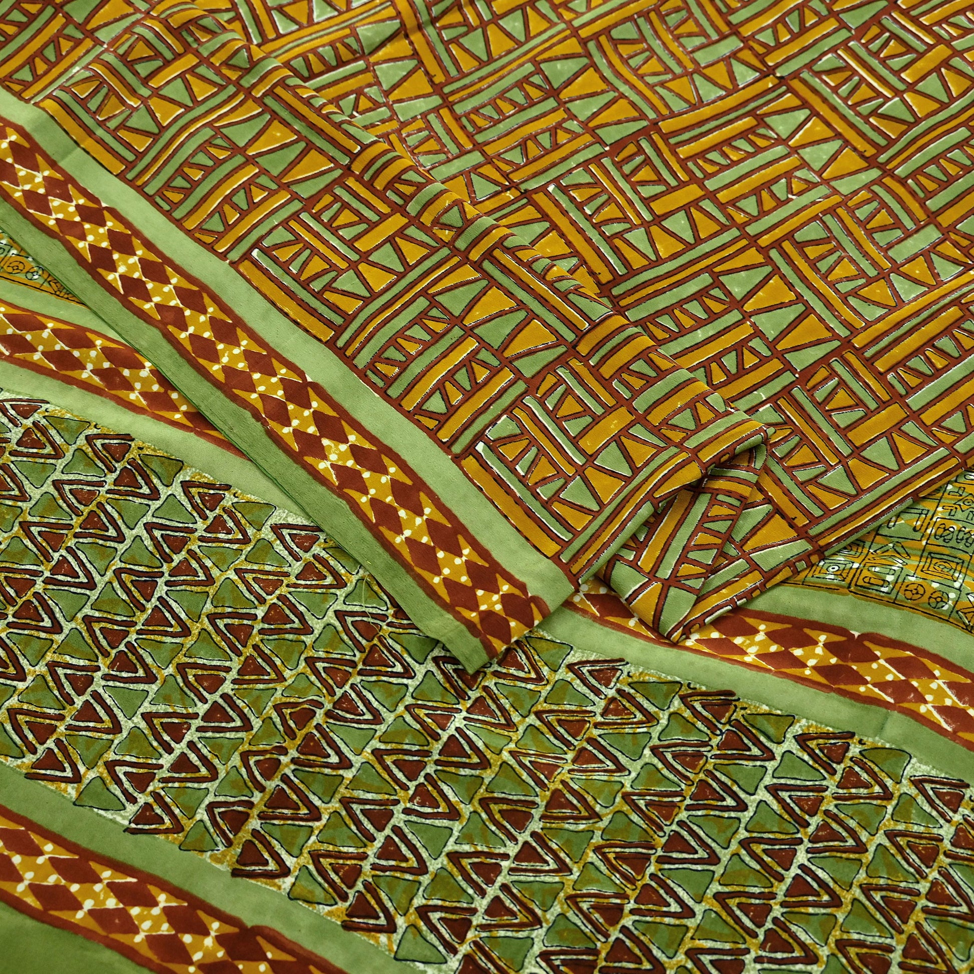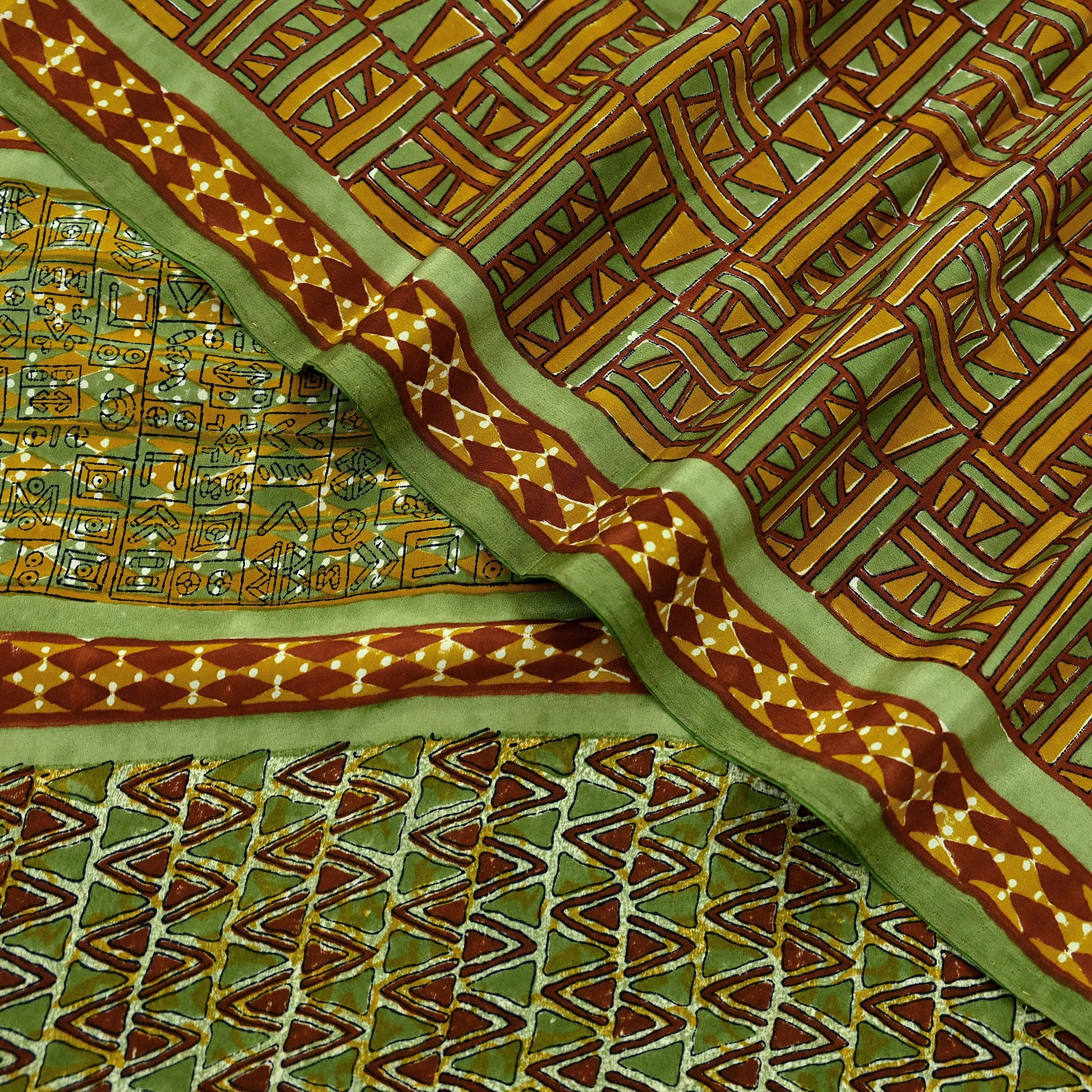 Nice Geometric Design With Printed Work On Green & Saffron Color Base Fabric Is Really Enhancing The Beauty Of The Saree.