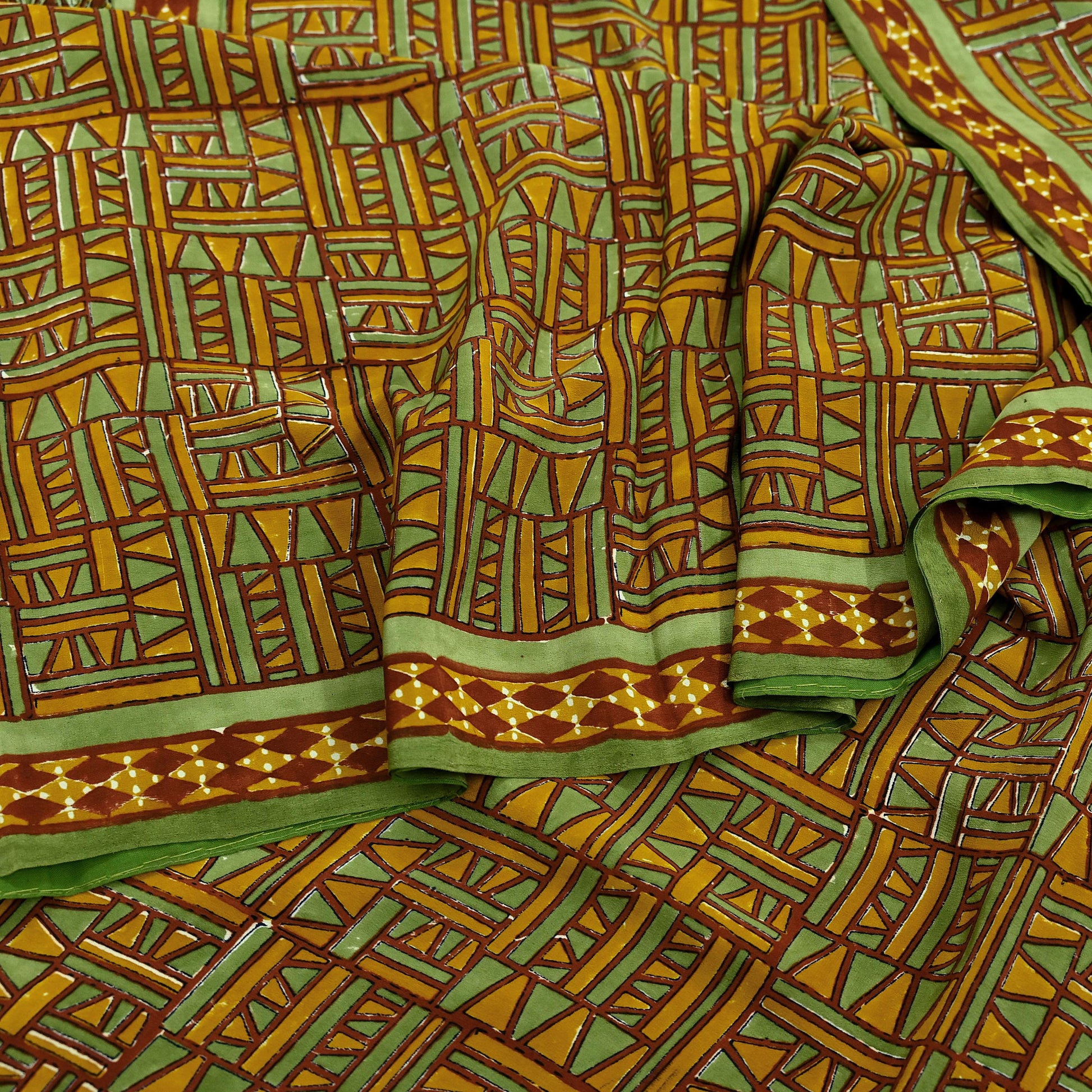 Indian Vintage Sari Green & Saffron Pure Crepe Silk Printed Sarees 5yd Sewing Floral Soft Craft Fabric Wrap Dress Making Crafting Quilting
