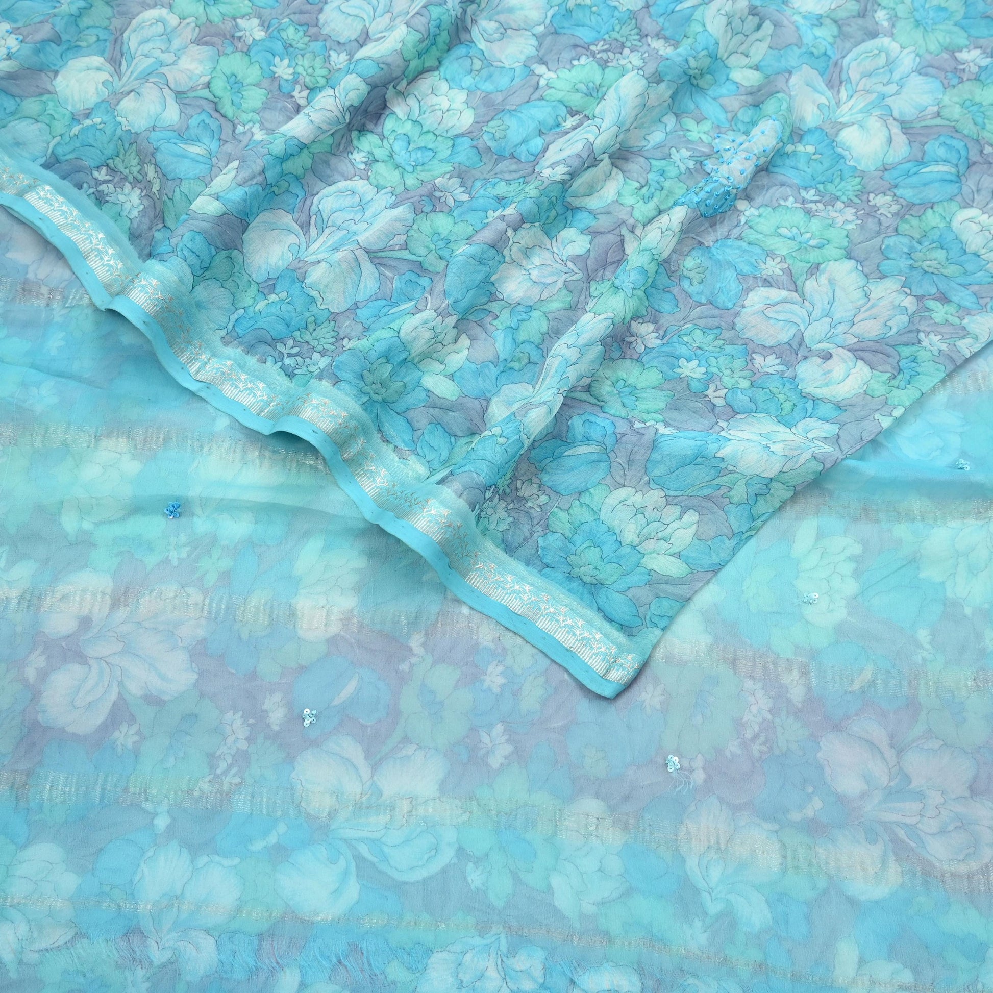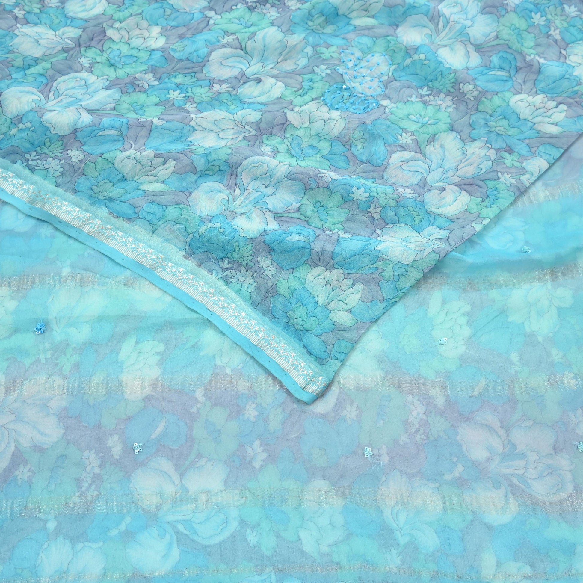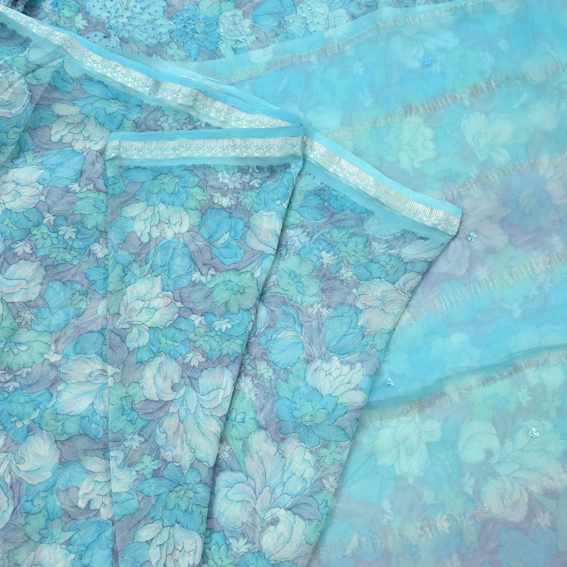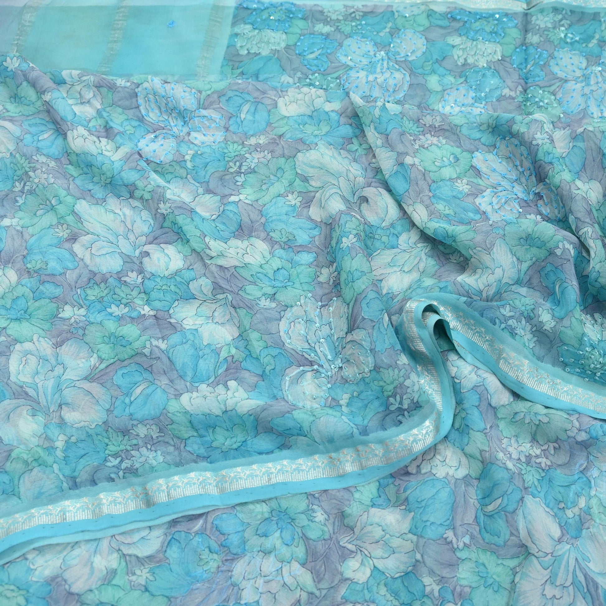 *Sari Has Floral Design In Center Part Of Sari. With Blue Thread, Blue Sequins Work.