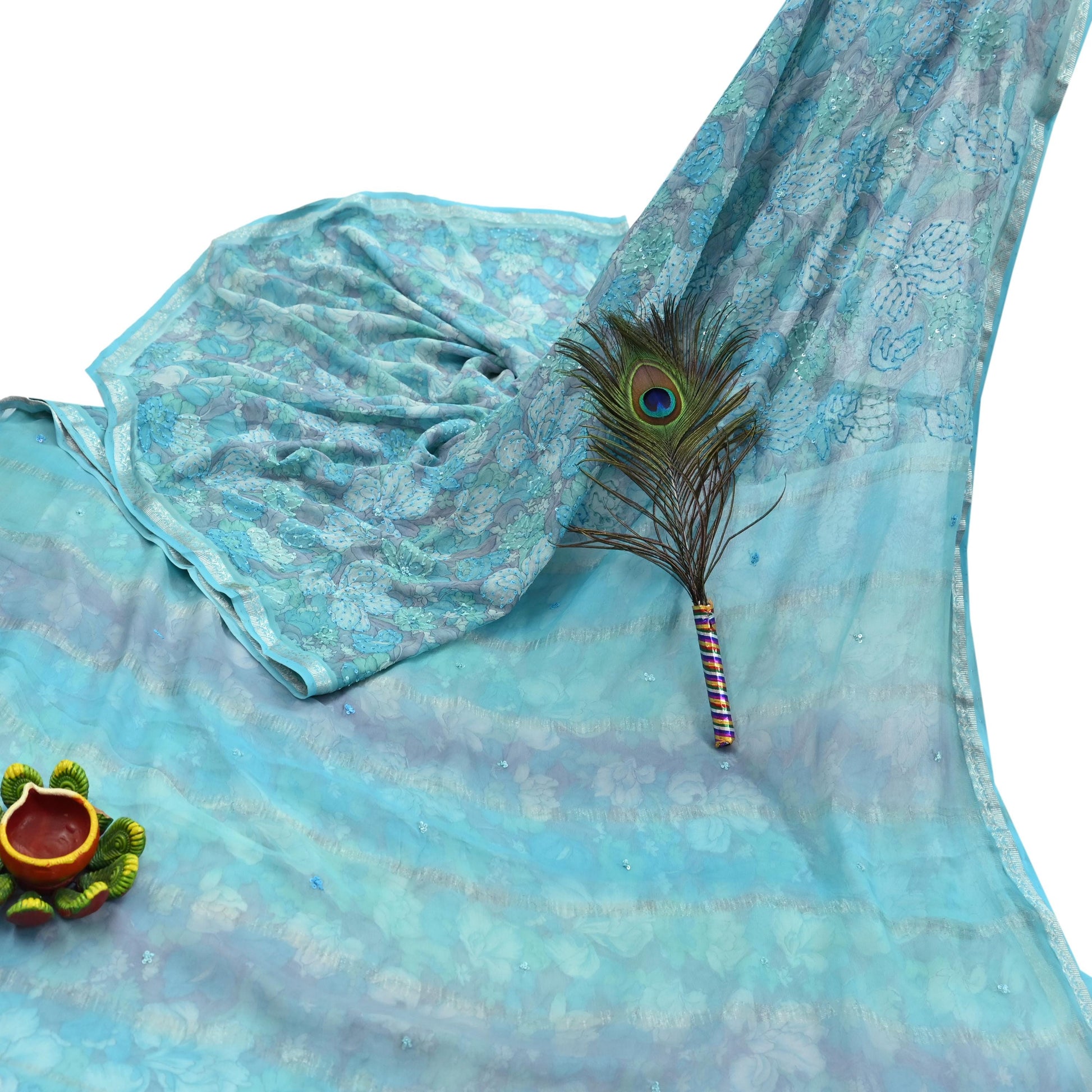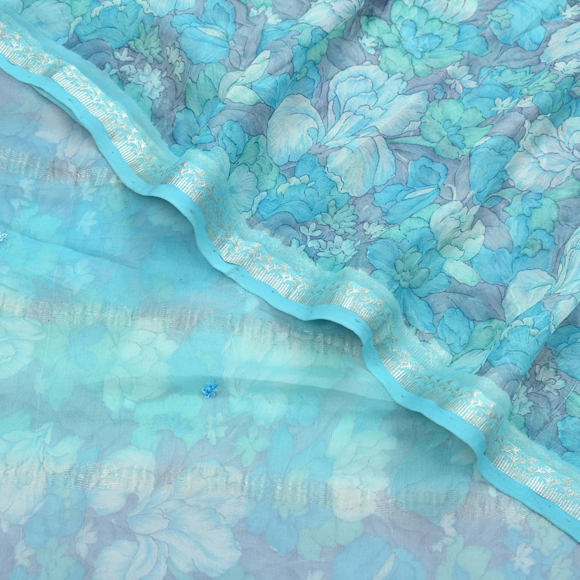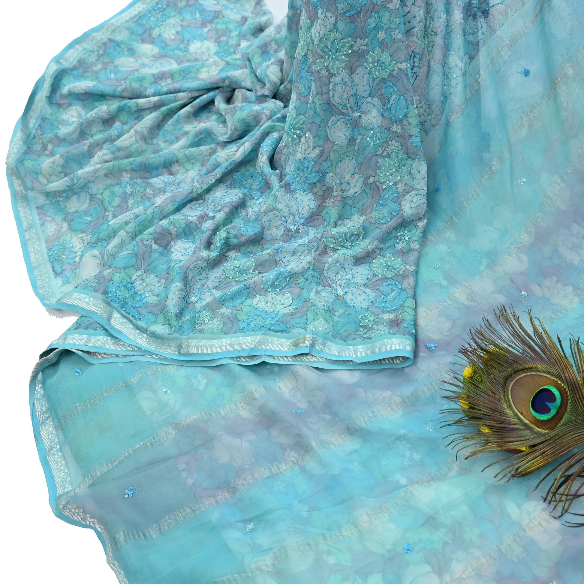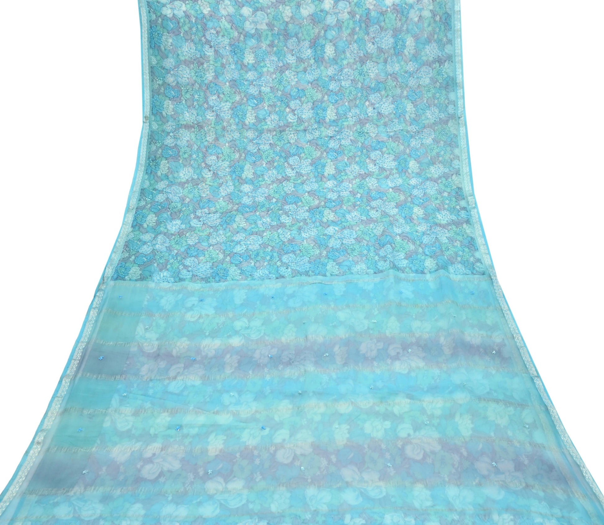 *Sari Has Floral Design In Center Part Of Sari. With Blue Thread, Blue Sequins Work.