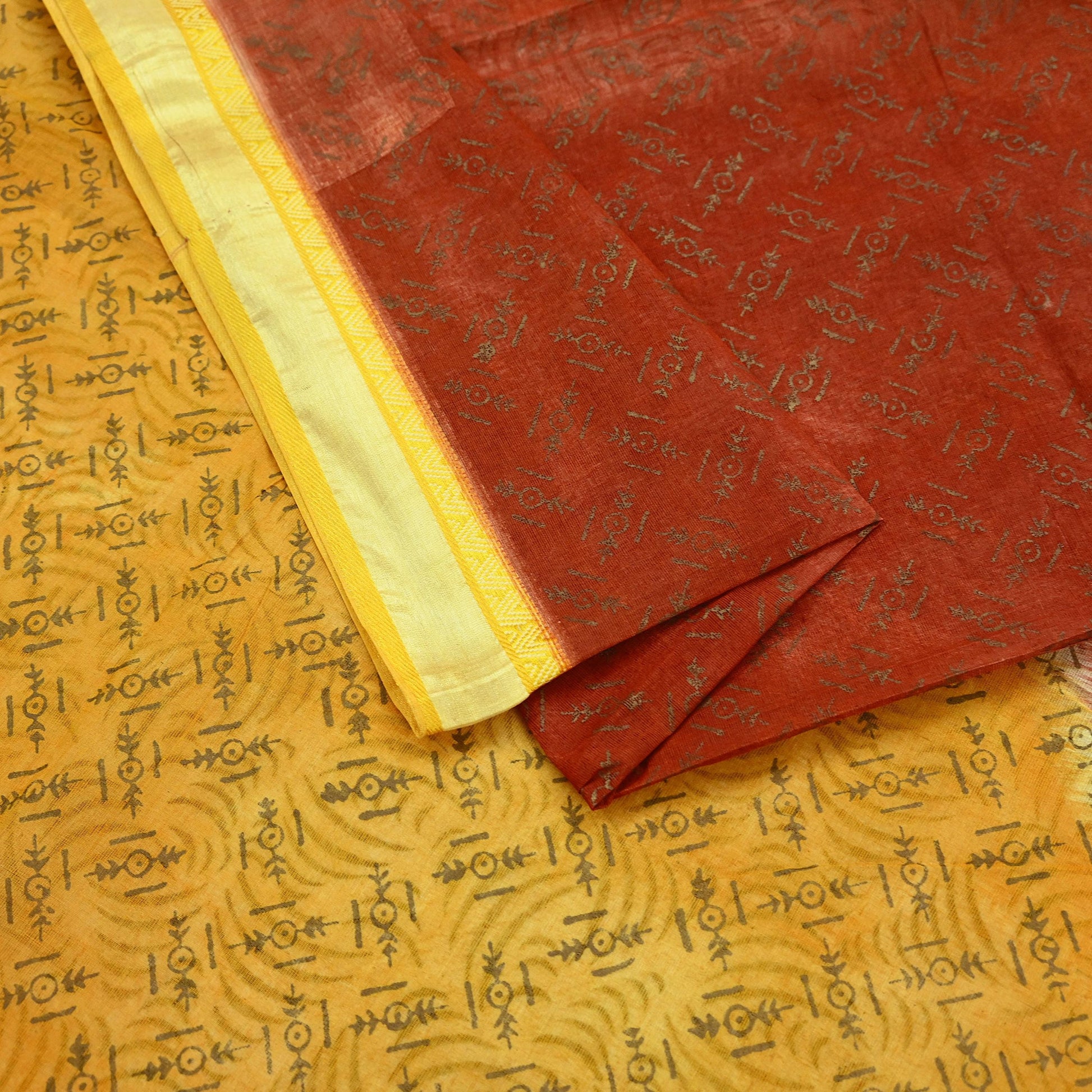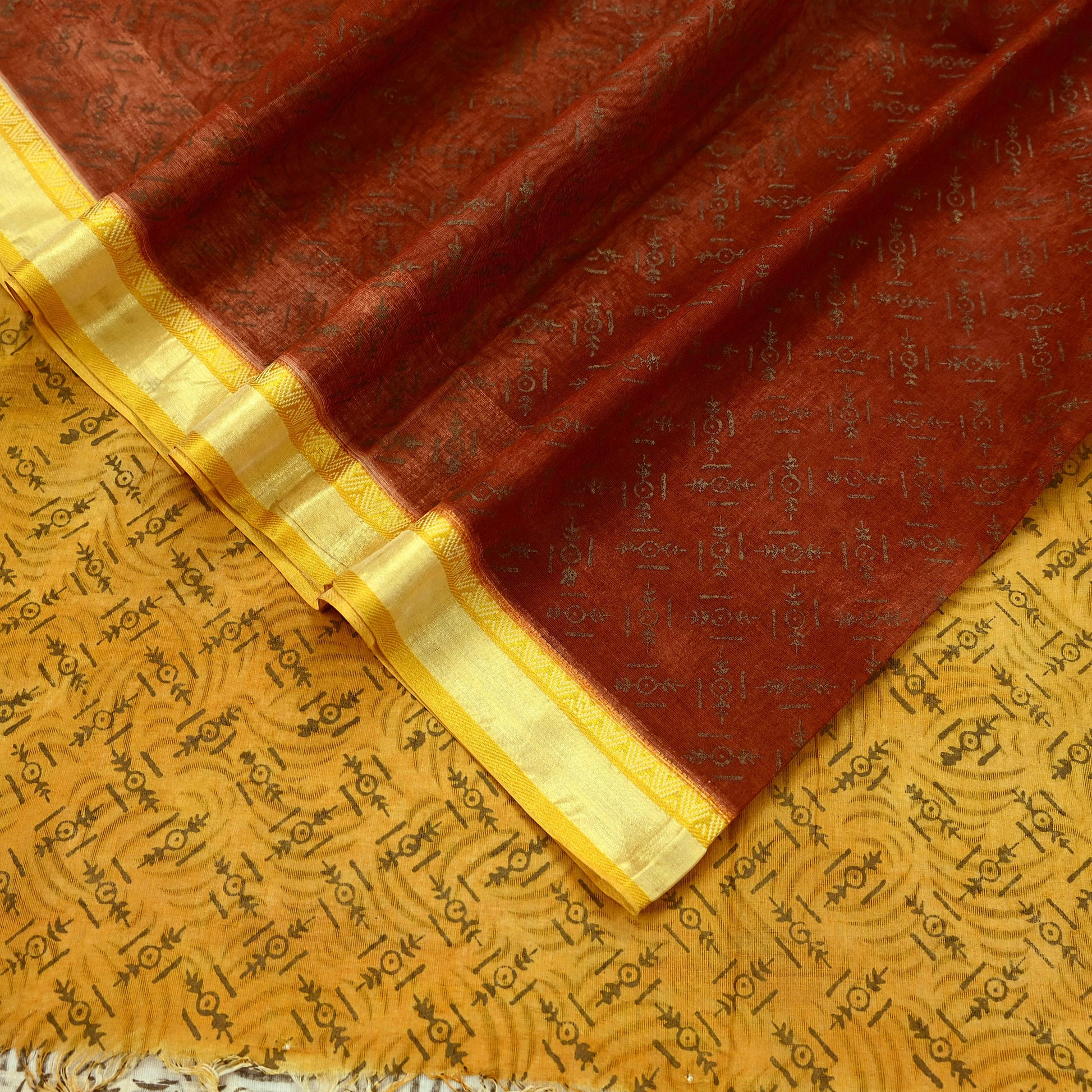 *Saree Has Beautiful Pallu & Border Has Hand Painted Geometric Design. With Yellow Border Work.