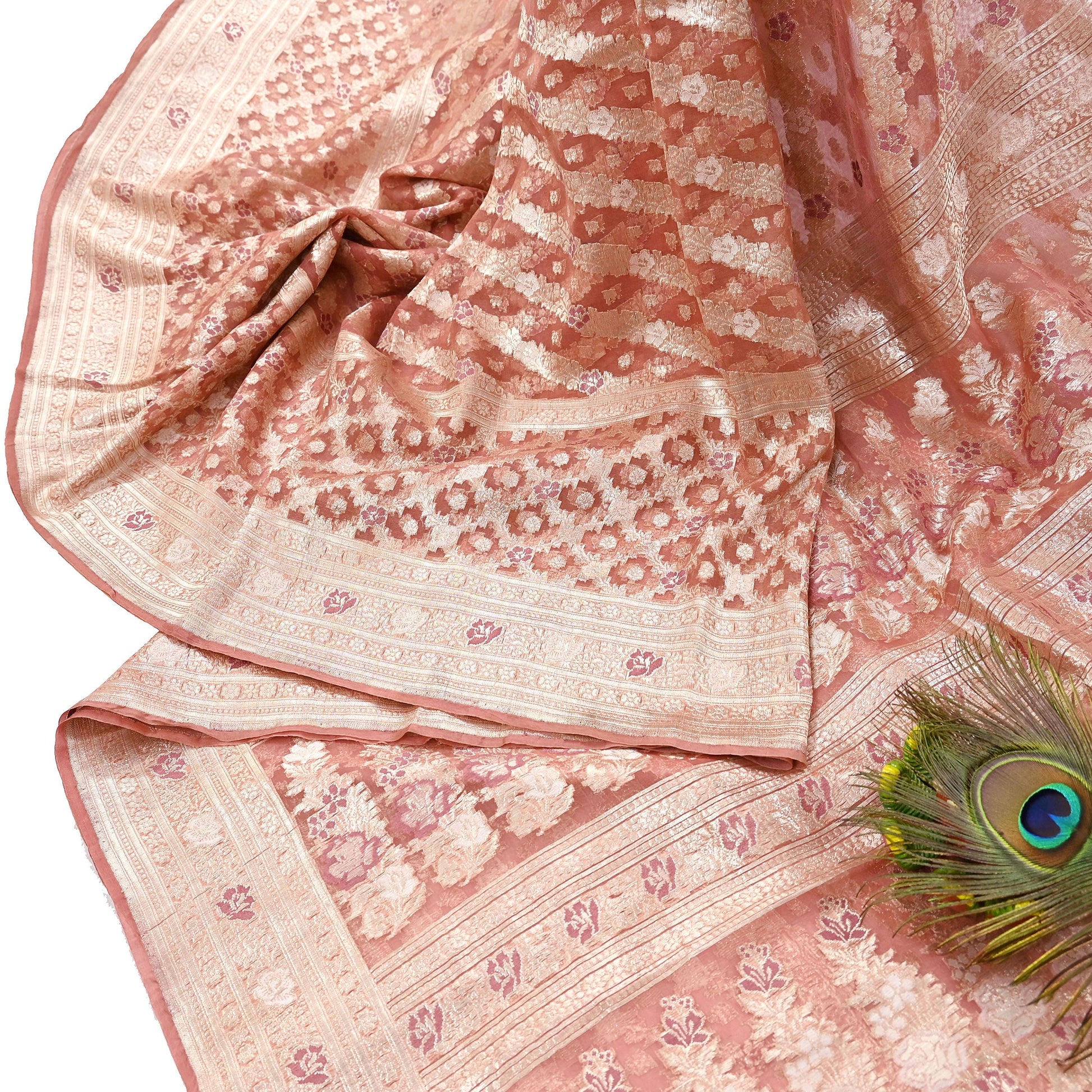 Indian Vintage Sari Heavy Peach Pure Organza Silk Woven Brocade Banarasi Sarees Zari 5Yd Ethnic Fabric Dress Making Wedding Sarees