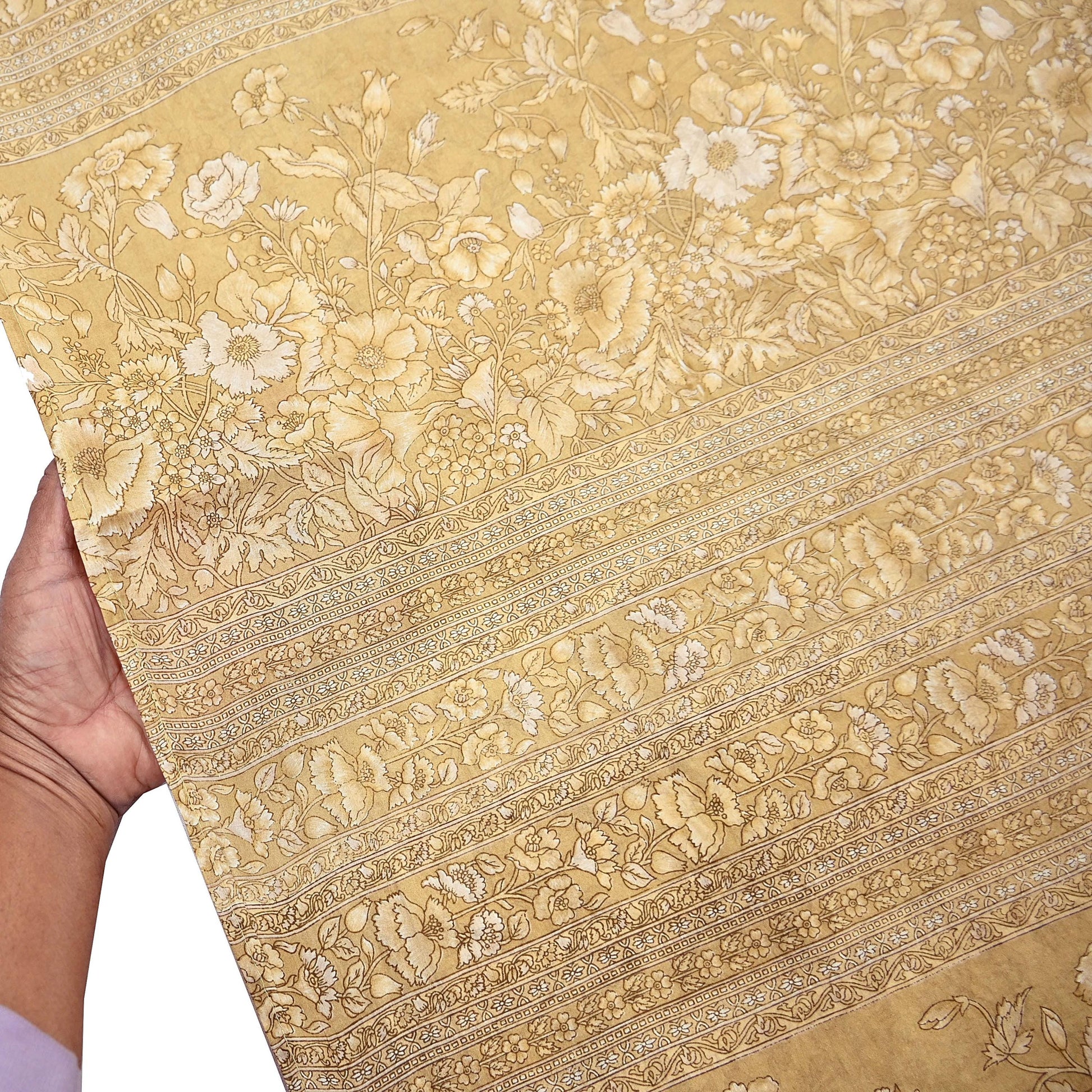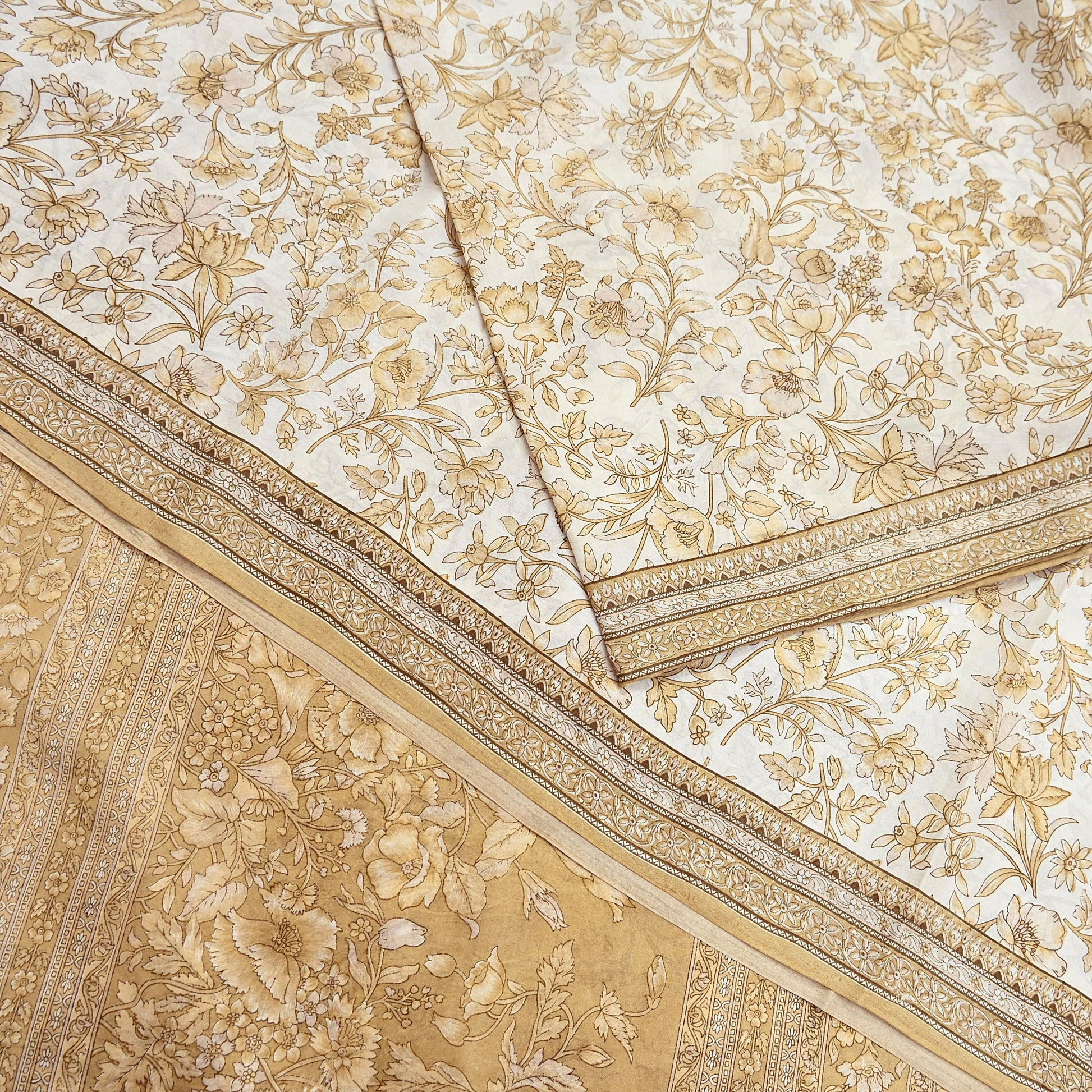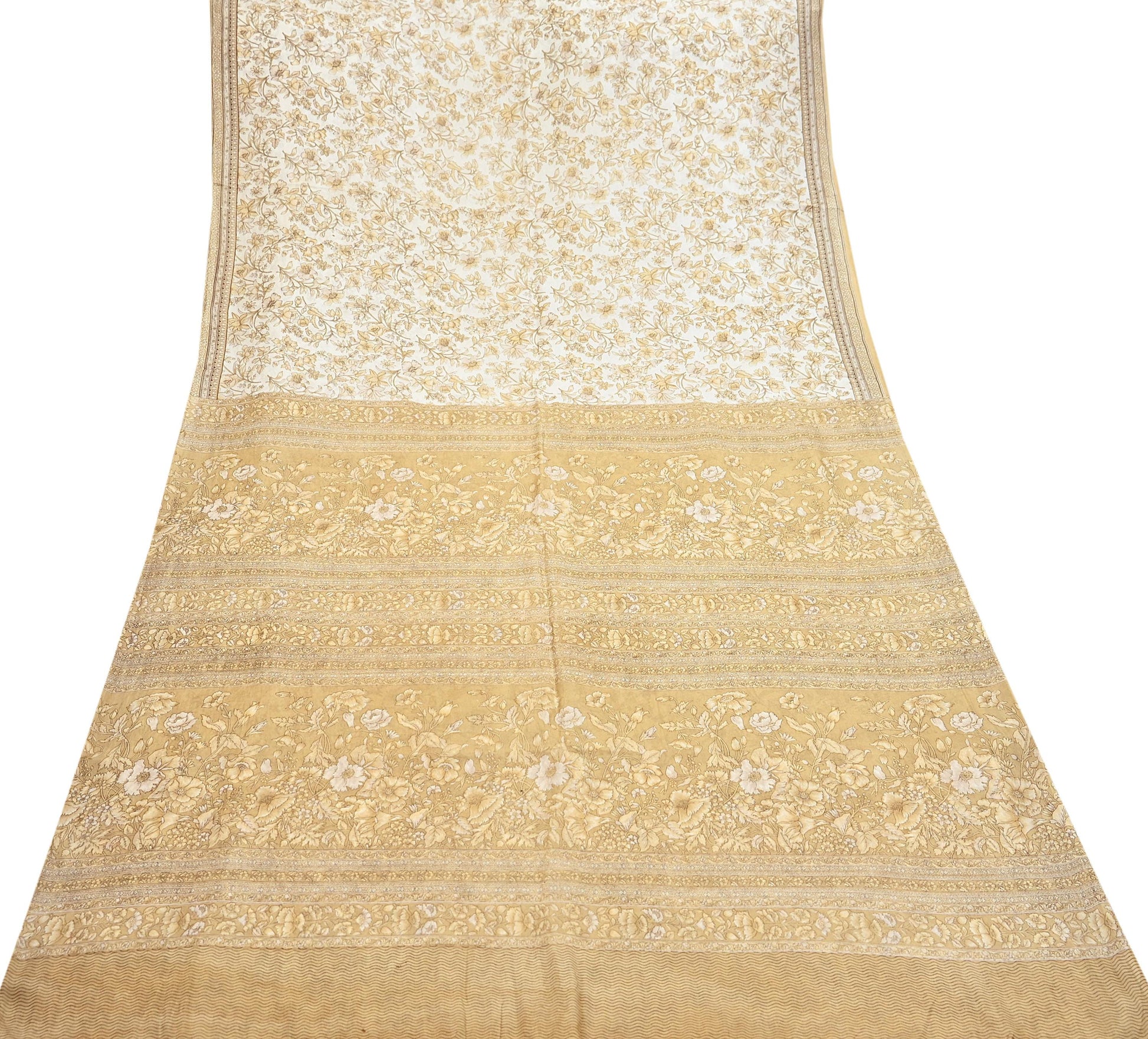 Indian Vintage Sari Ivory & Beige Pure Silk Printed Saree 6yd Sewing Paisley Craft Fabric DressMaking Soft Used Upcycled