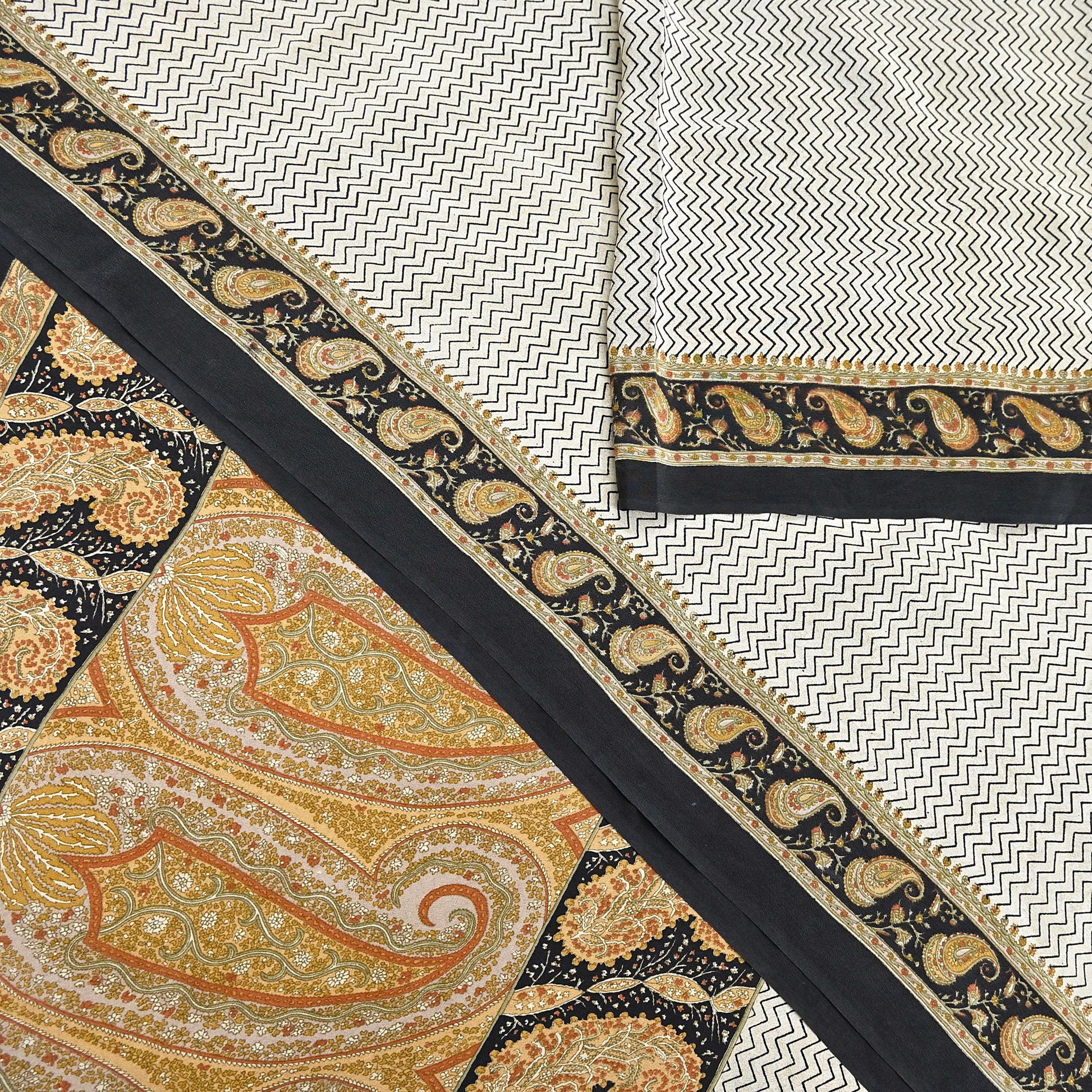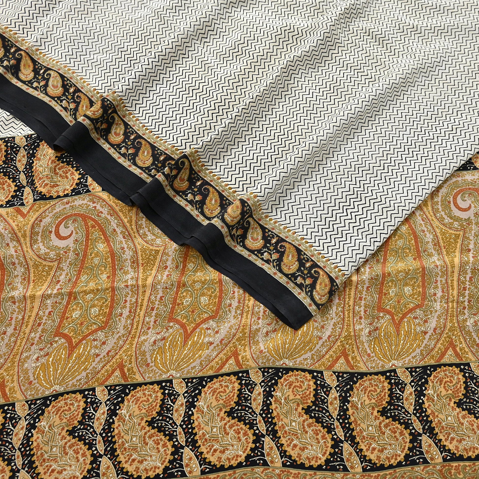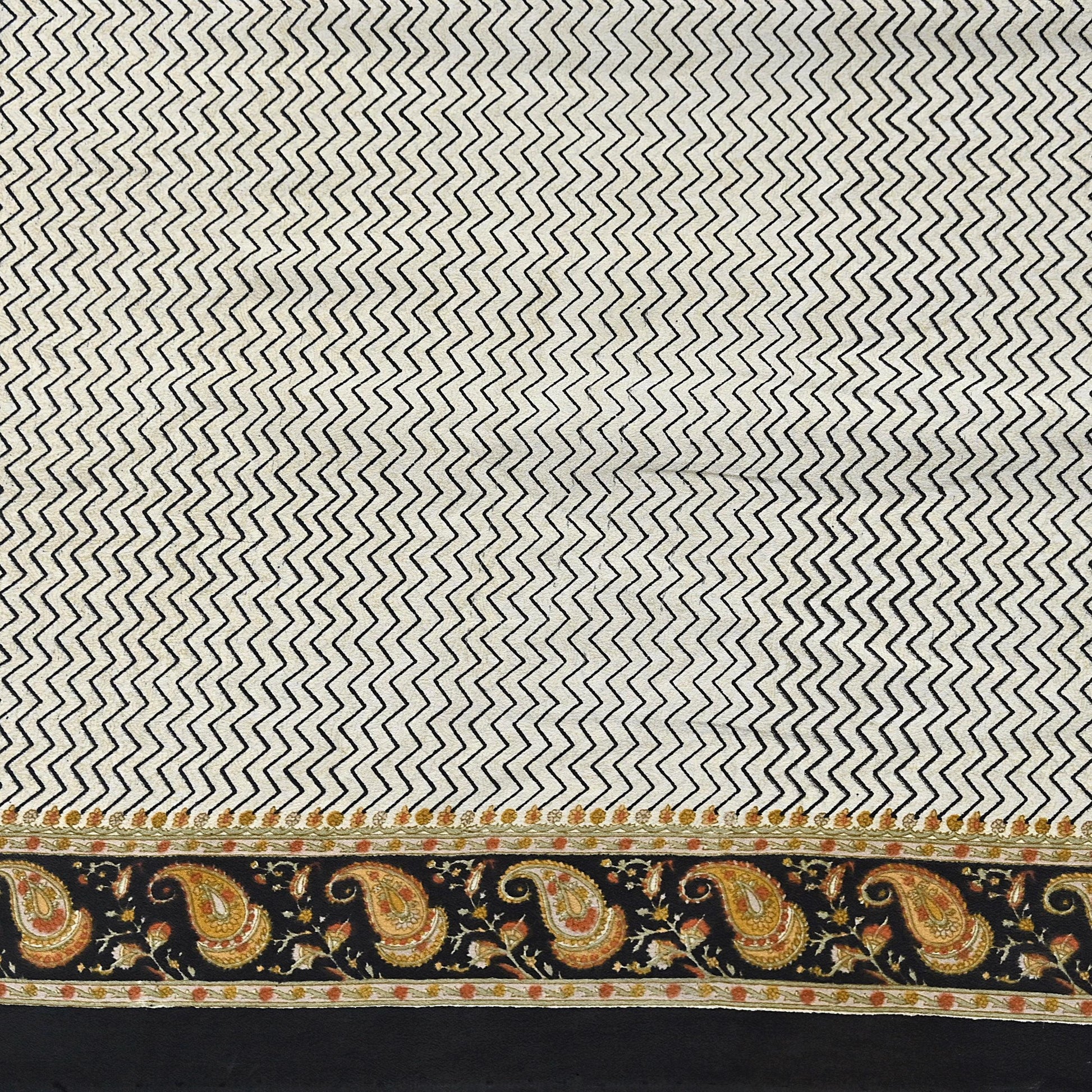 Nice zigzag Design With Printed Work On Ivory & black Base color Is Really Enhancing The Beauty Of The Saree.