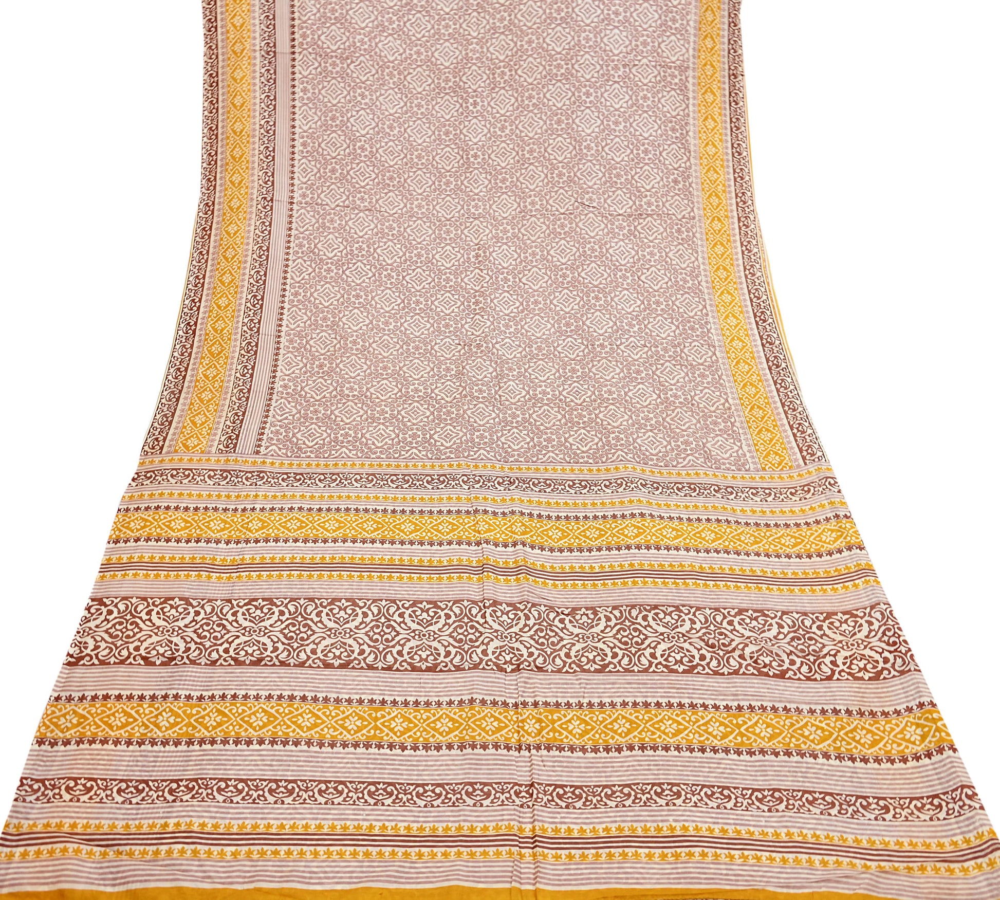 Indian Vintage Sari Ivory & Brown 100% Pure Silk Printed Sarees 5yd Craft Fabric Sewing Soft Dress Making Floral Quilting Crafting Upcycle
