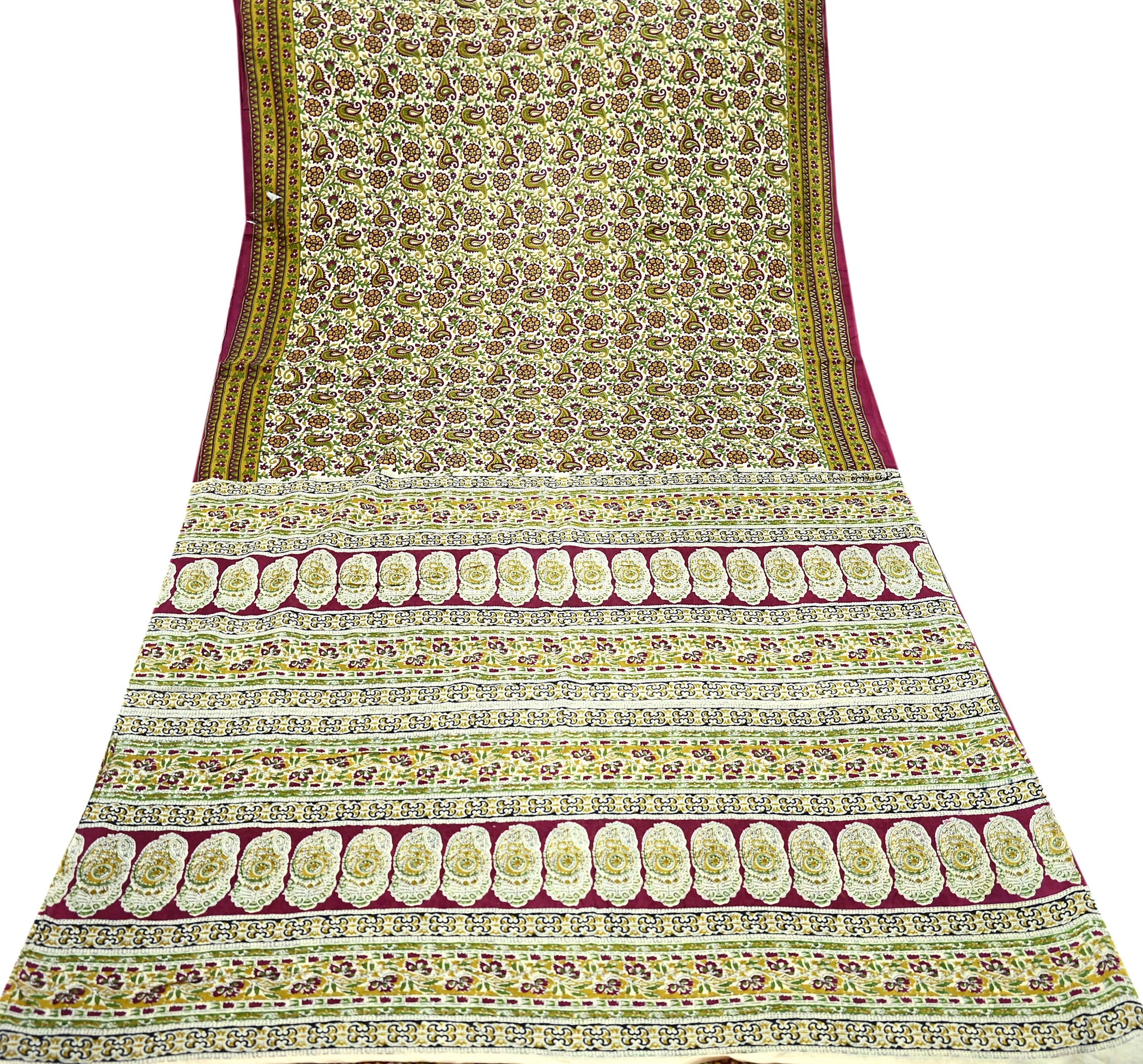 Indian Vintage Sari Ivory & Maroon Block Printed Pure Cotton Saree Fabric Soft Floral 5Yd Sarong Wrap Boho Fabric Kimono Soft