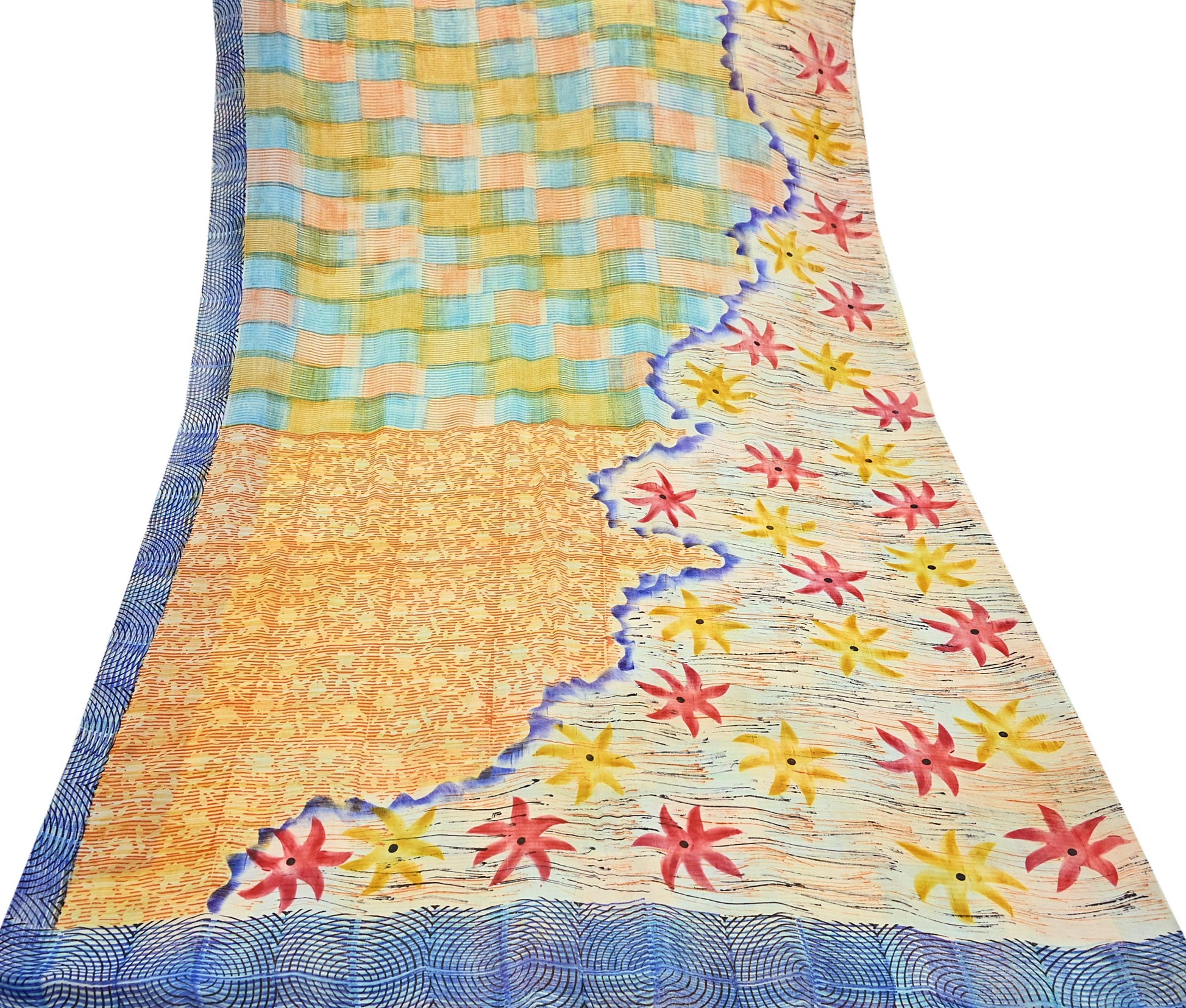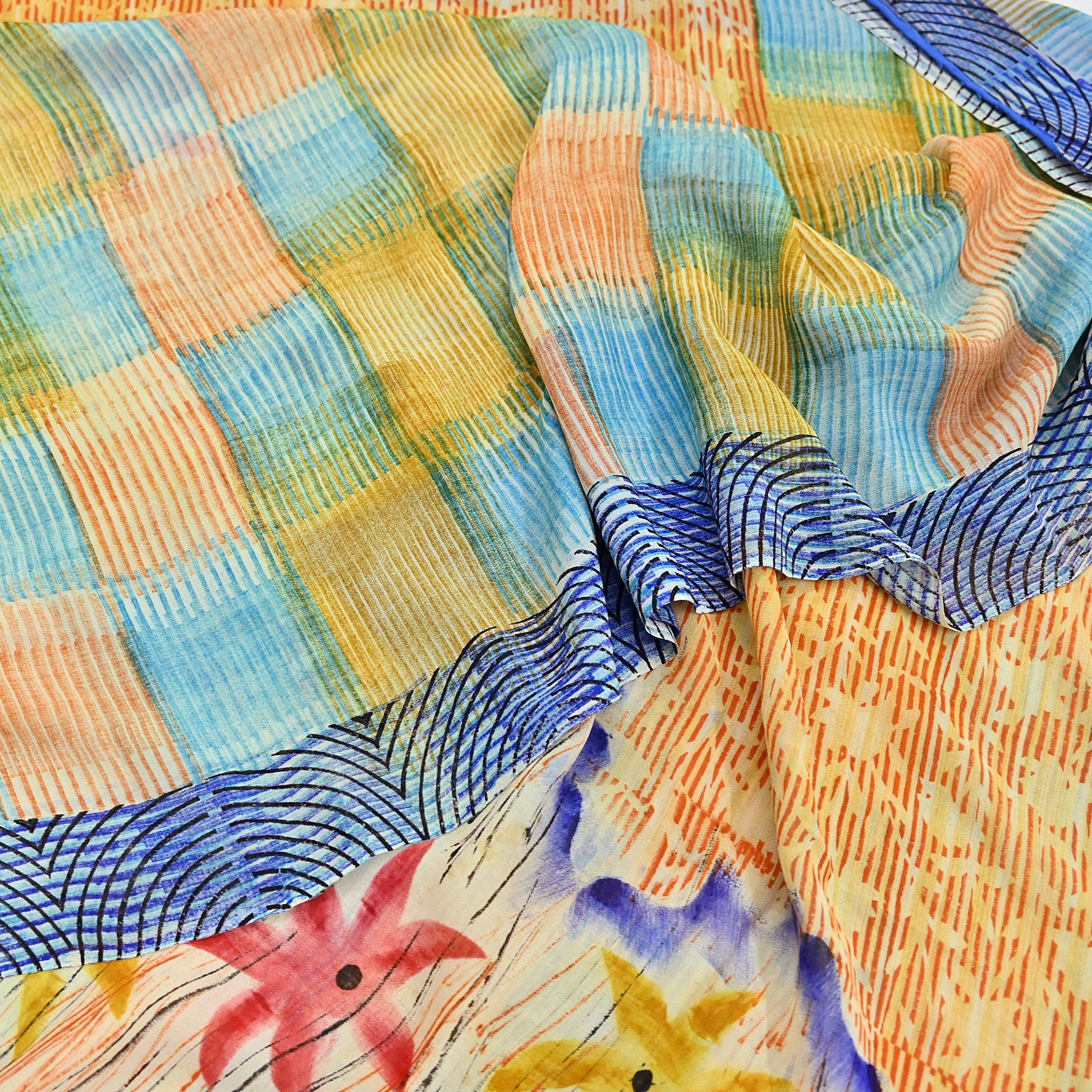 Indian Vintage Sari Ivory & Multi Pure Georgette Silk Printed Sarees 6Yd Craft Fabric Sewing Quilting Dress making Crafting Quilting Upcycle