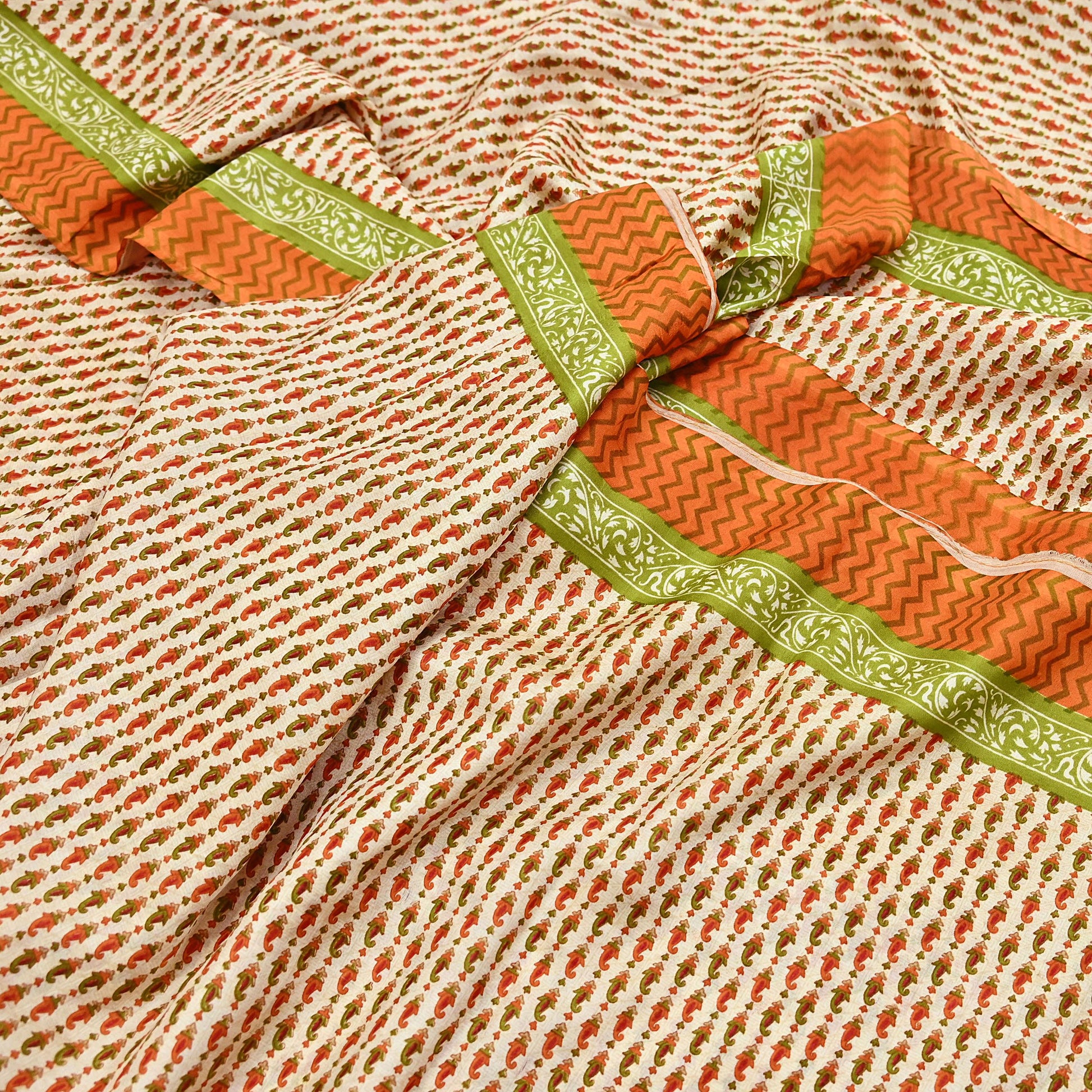 Indian Vintage Sari ivory & Orange 100% Pure Silk Printed Sarees 6yd Craft Fabric Sewing Soft Dress Making zigzag Quilting Crafting Upcycle