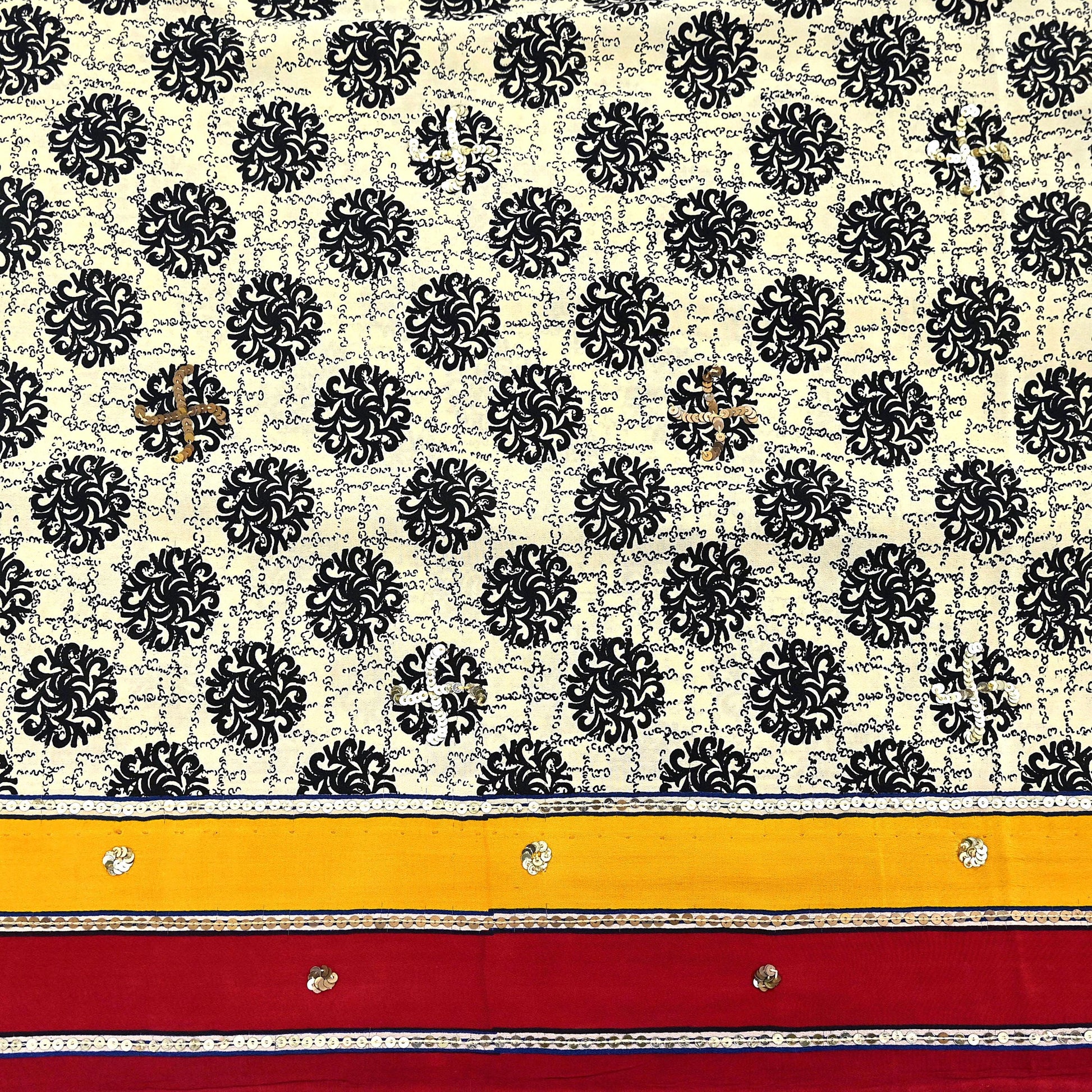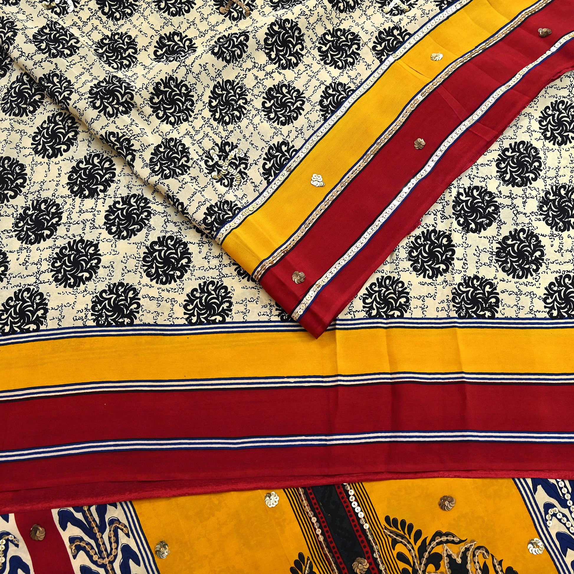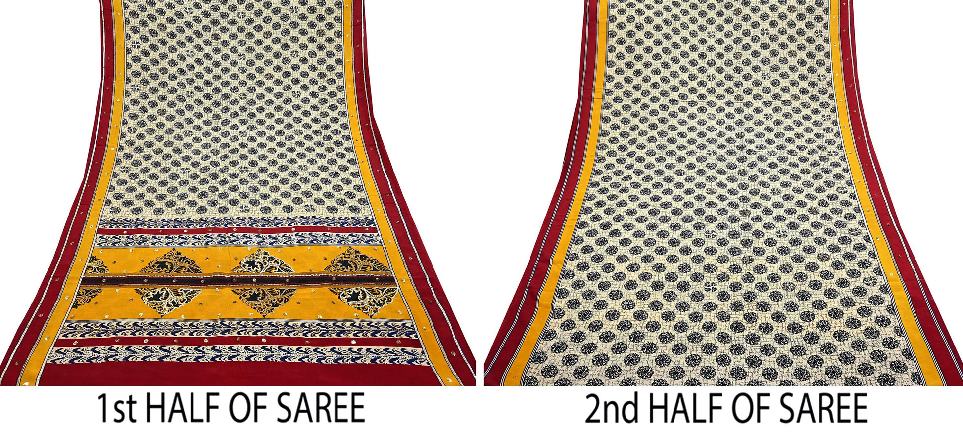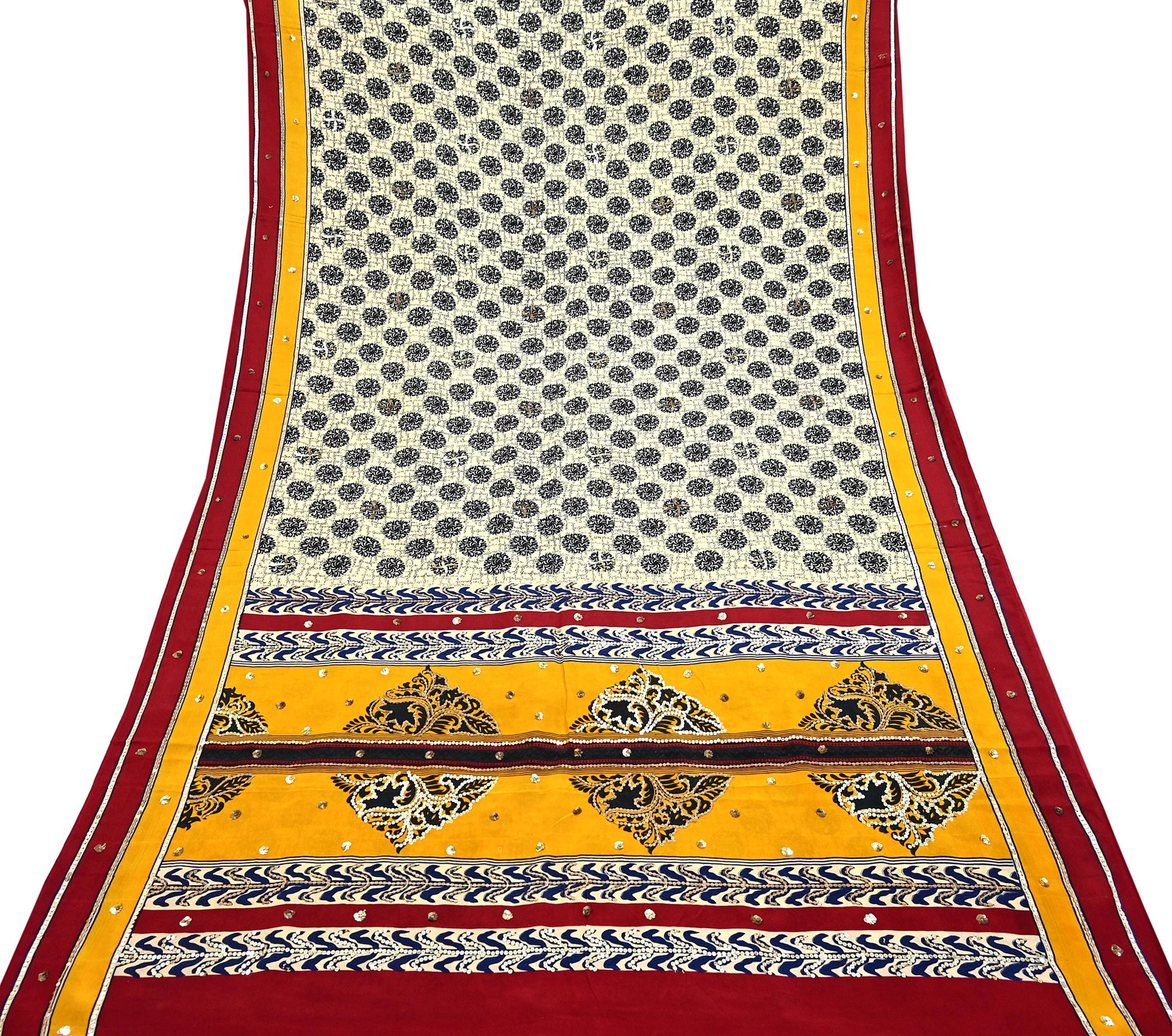 Indian Vintage Sari Ivory & Saffron Pure Crepe Silk Hand Embroidered Saree 5yd Sewing Floral Craft Sequins Dress making Crafting Quilting