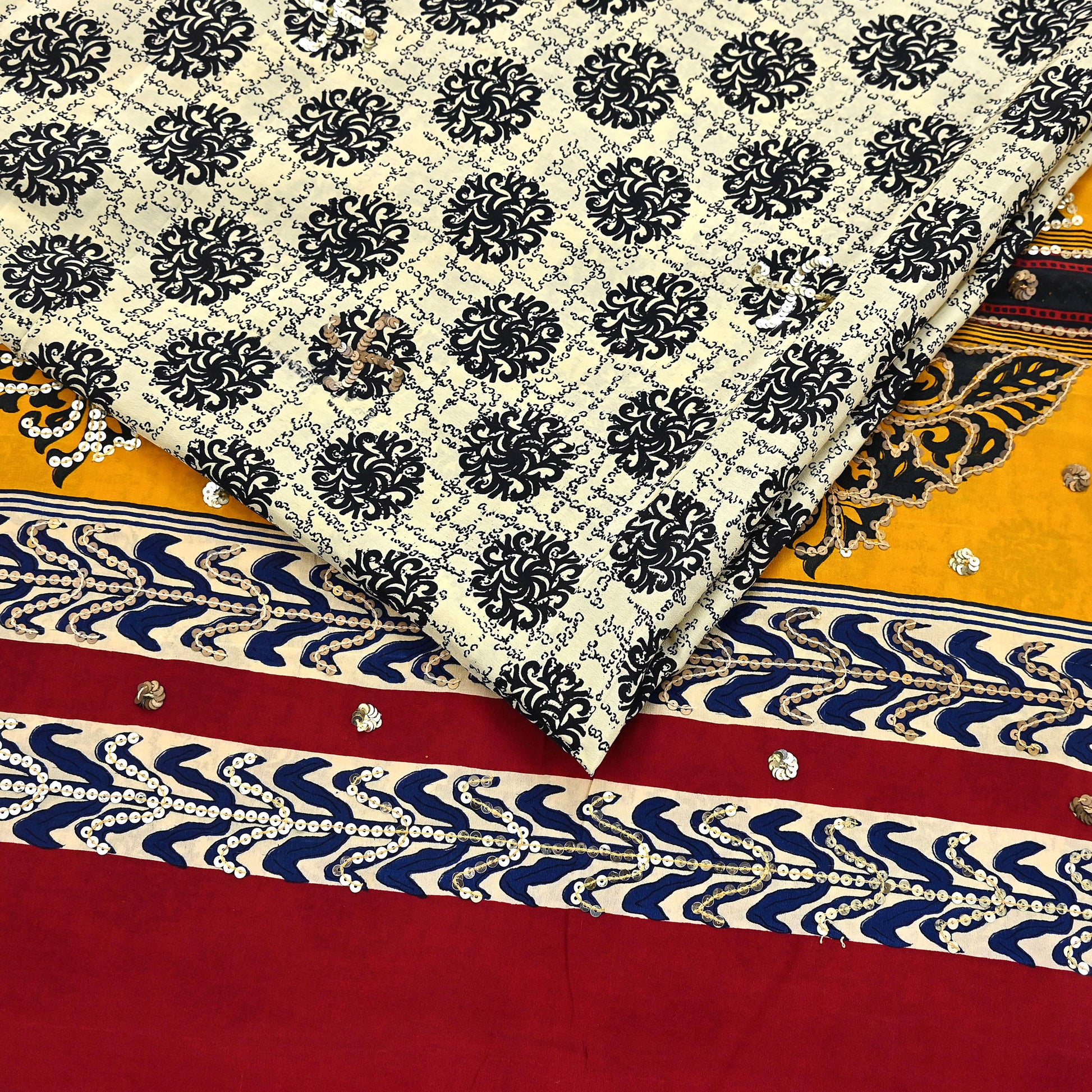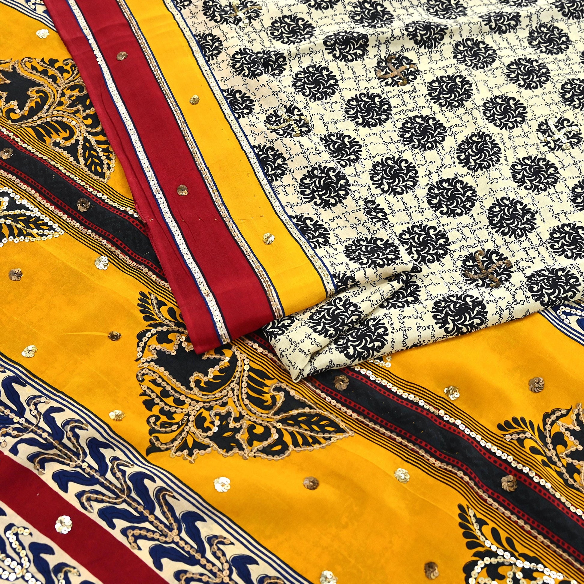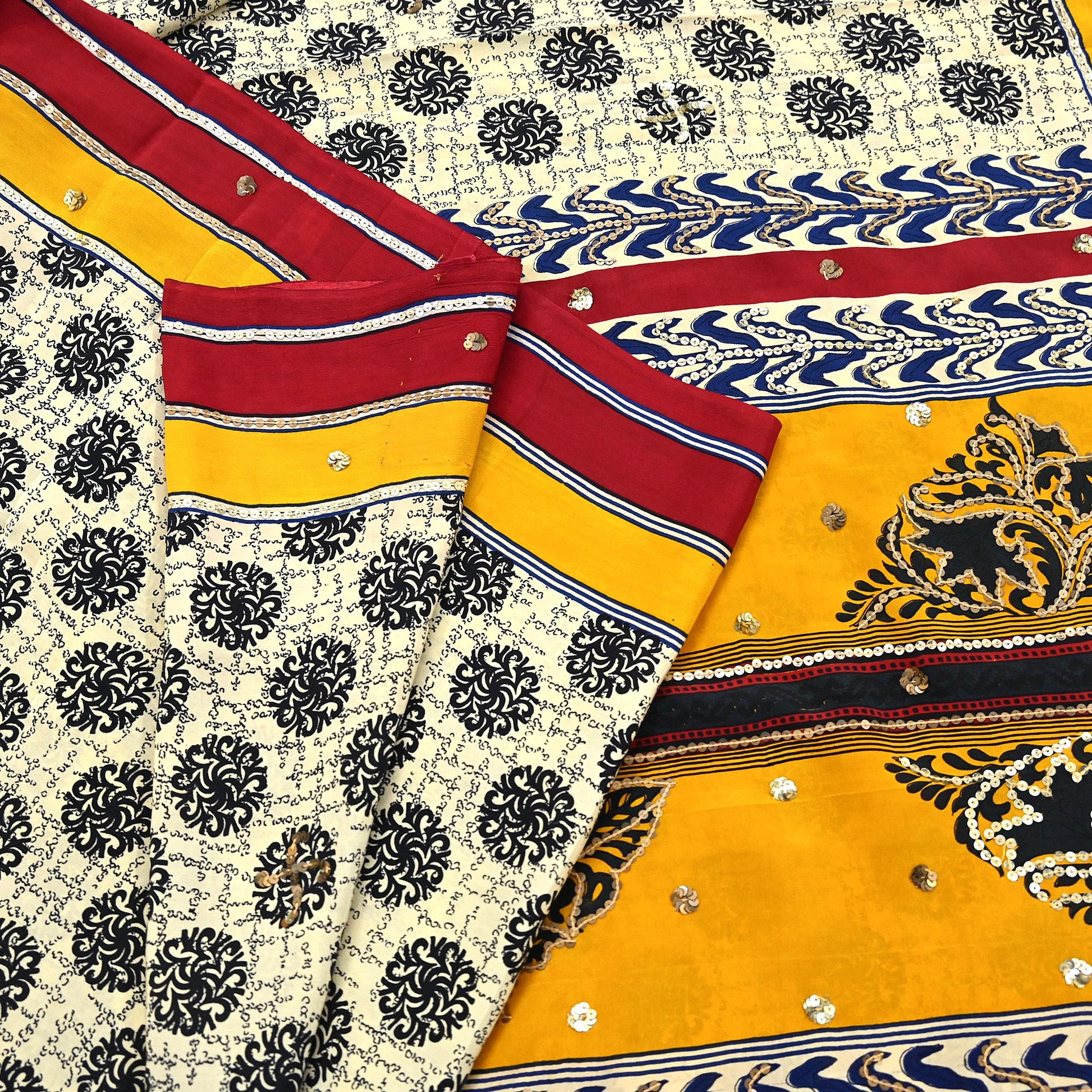 Nice Sequins Work With Printed Saree On Ivory & Saffron Color Base Fabric Is Really Enhancing The Beauty Of The Saree.
