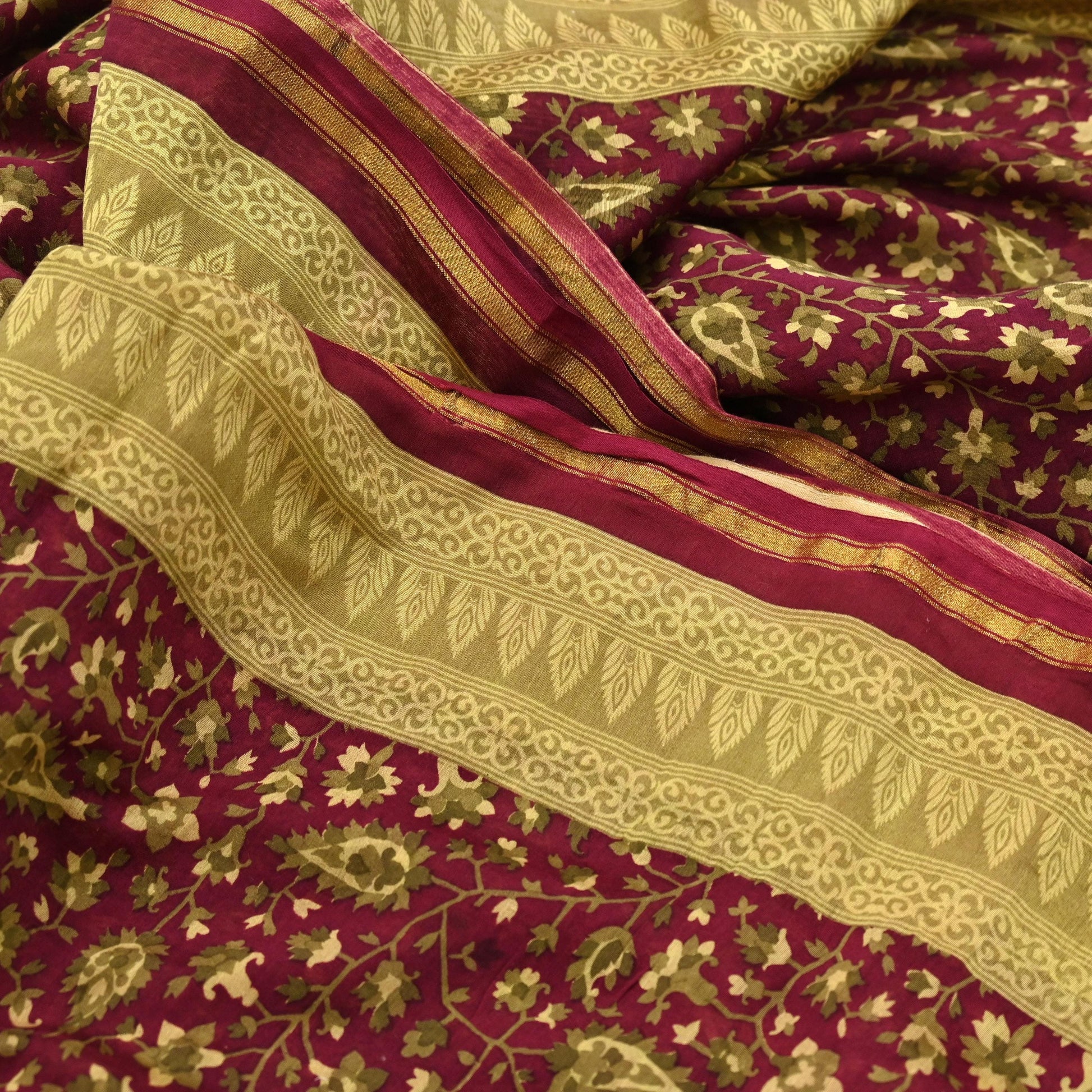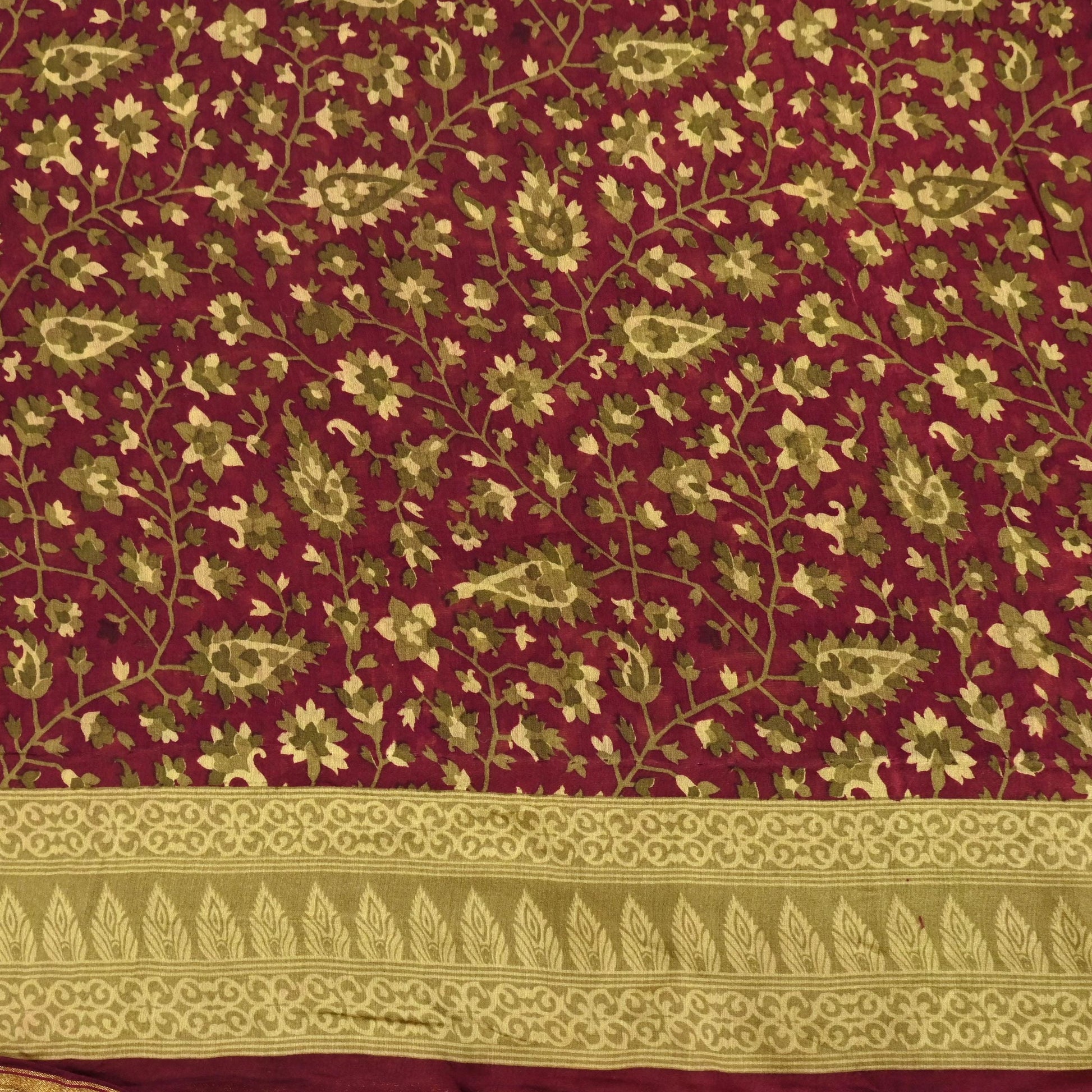 Indian Vintage Sari Maroon Green chanderi Silk Bagru Printed Saree 5Yd Fabric Floral Soft Zari Border Ethnic Upcycle Crafting Dress making