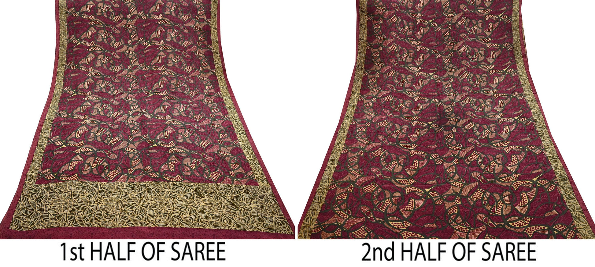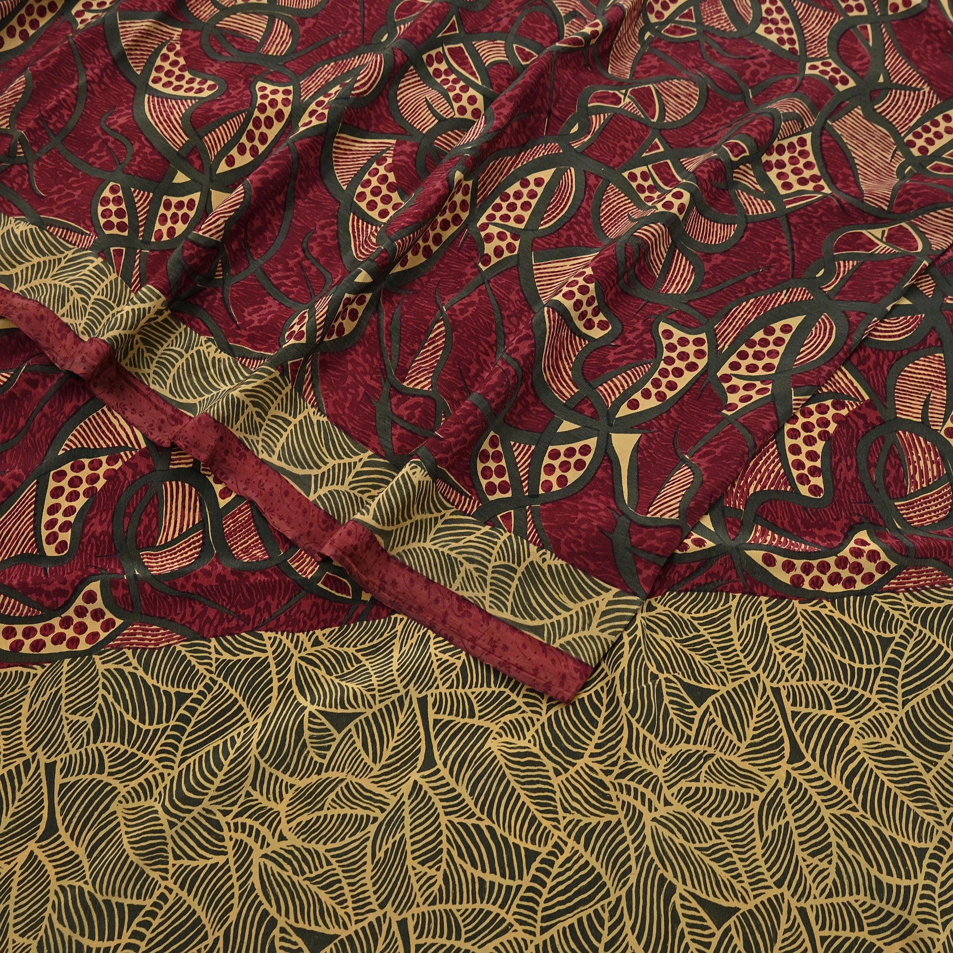 Indian Vintage Sari Maroon & Green Pure Crepe Silk Block Printed Saree 5yard Sewing Quilting Floral Soft Craft Fabric Wrap