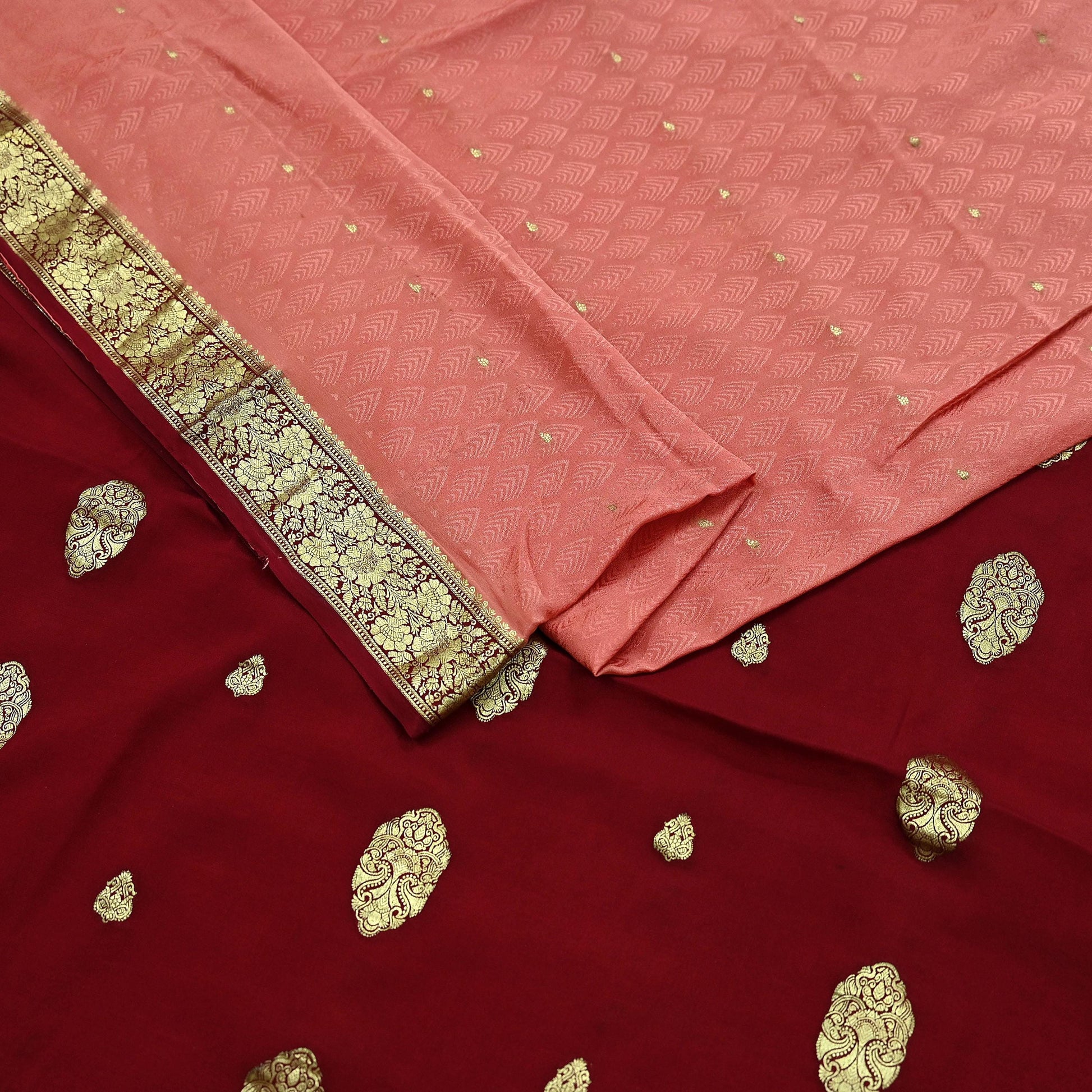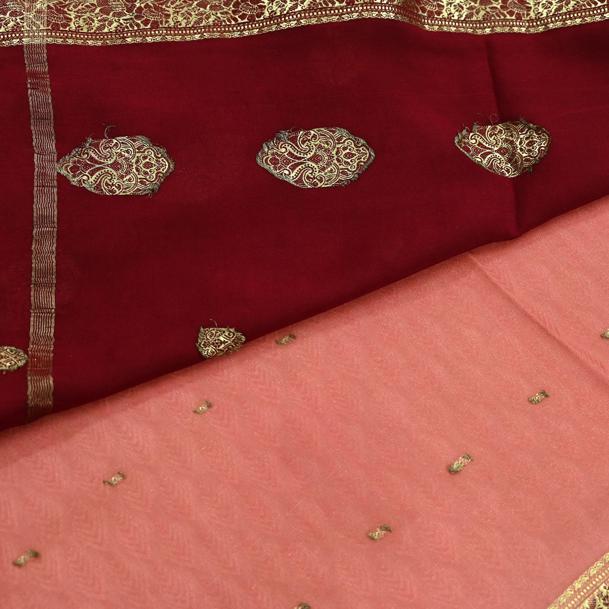 Indian Vintage Sari Maroon & Peach Mysore Silk Woven Saree with Zari Border | 5 Yards | Soft Craft Fabric | Upcycle, Quilting, Dressmaking