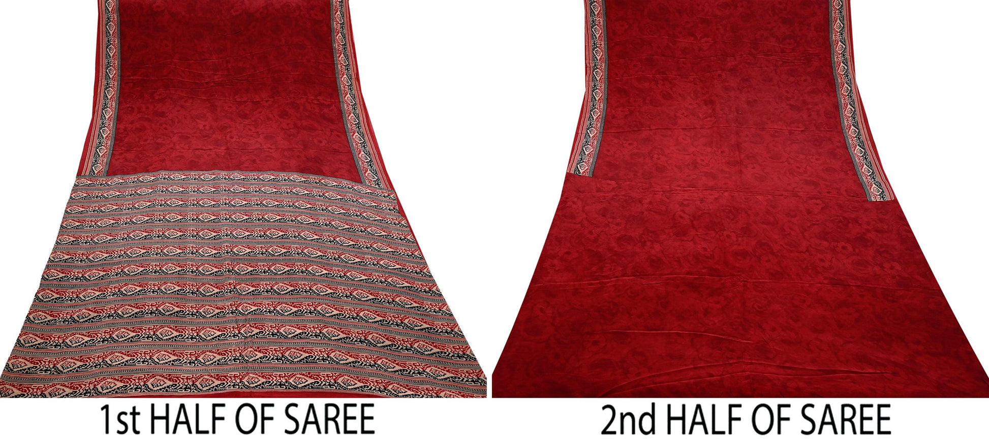 Indian Vintage Sari Maroon Pure Crepe Silk Block Printed Saree 5yard Sewing Quilting Floral Soft Craft Fabric Wrap