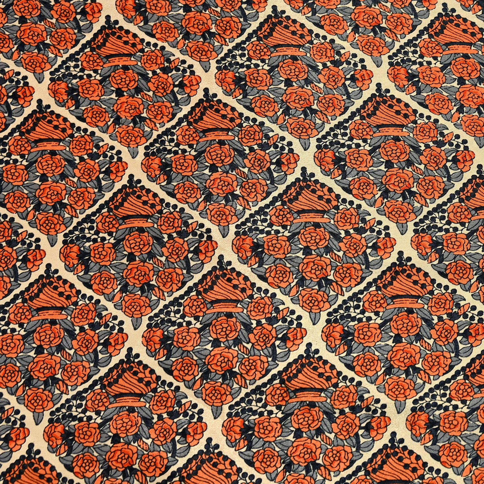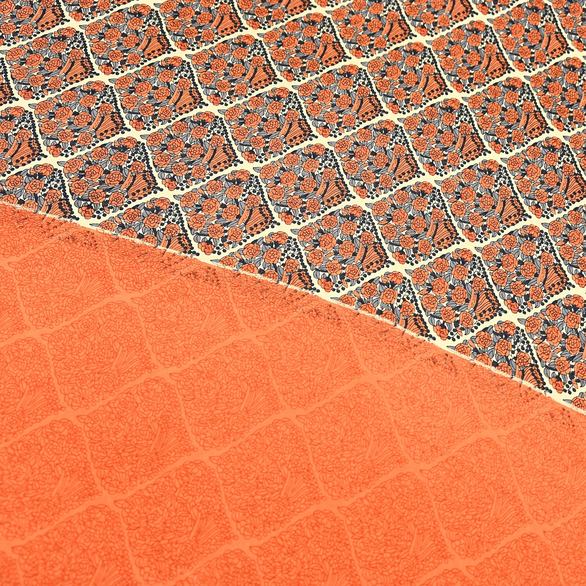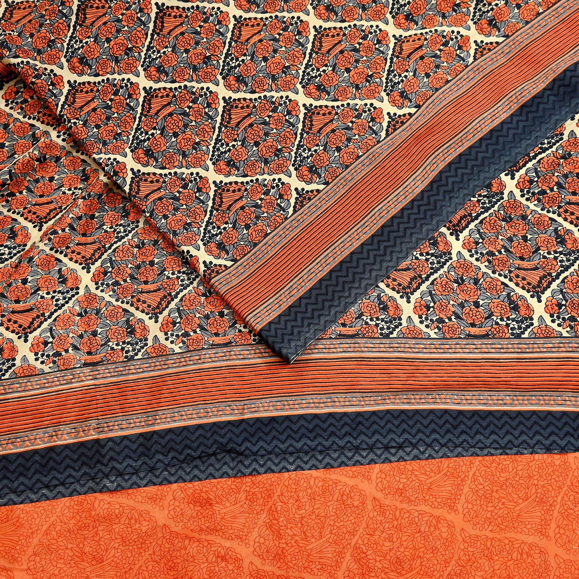 Indian Vintage Sari Orange & Beige Moss Crepe Printed Sarees 6yd Craft Fabric Sewing Floral Soft Dressmaking Quilting Crafting Upcycle Used