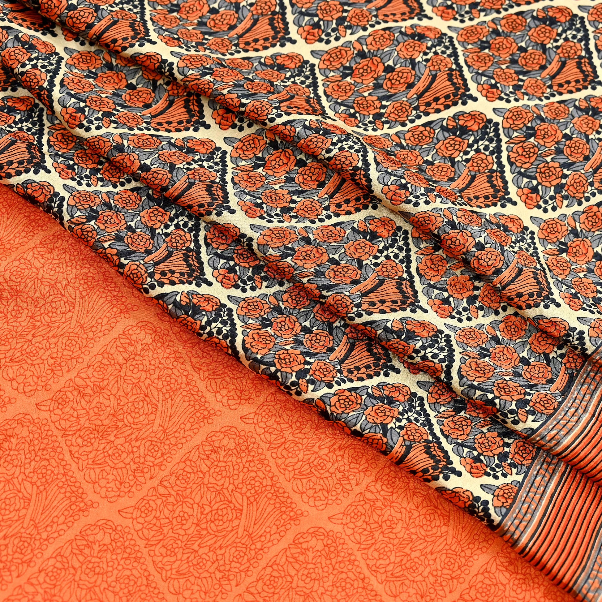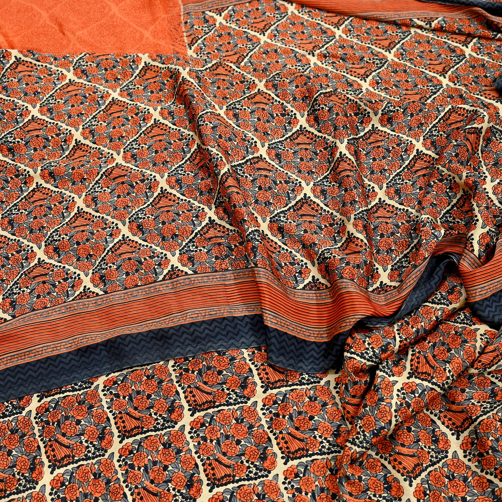 *Lovely Orange, Gry & Beige colored printed moss crepe saree.