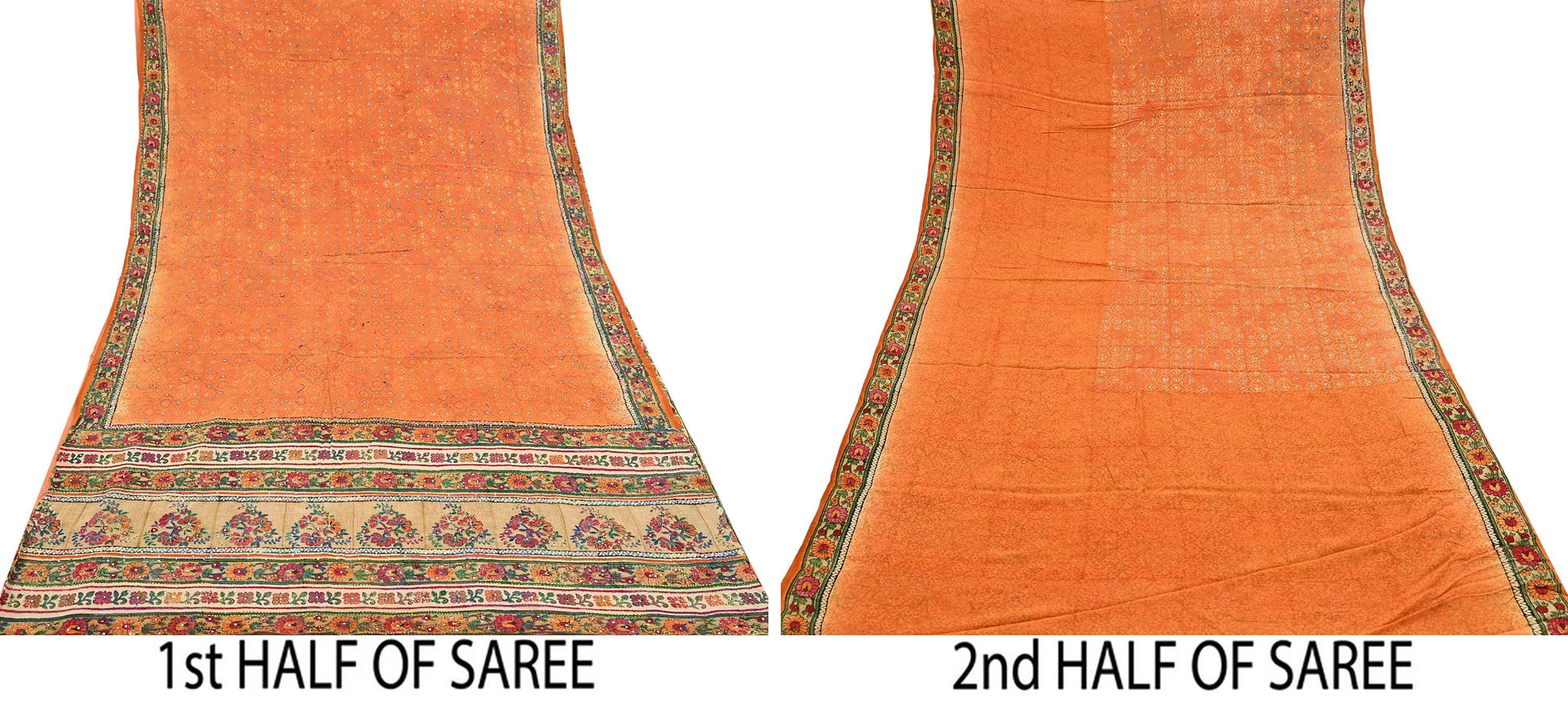 Indian Vintage Sari orange Pure Crepe Silk Hand Embroidered Kantha Saree 5yd Craft Fabric Sewing Floral Soft Dress making Crafting