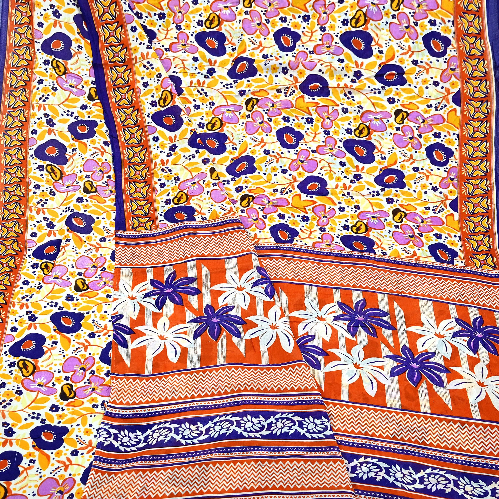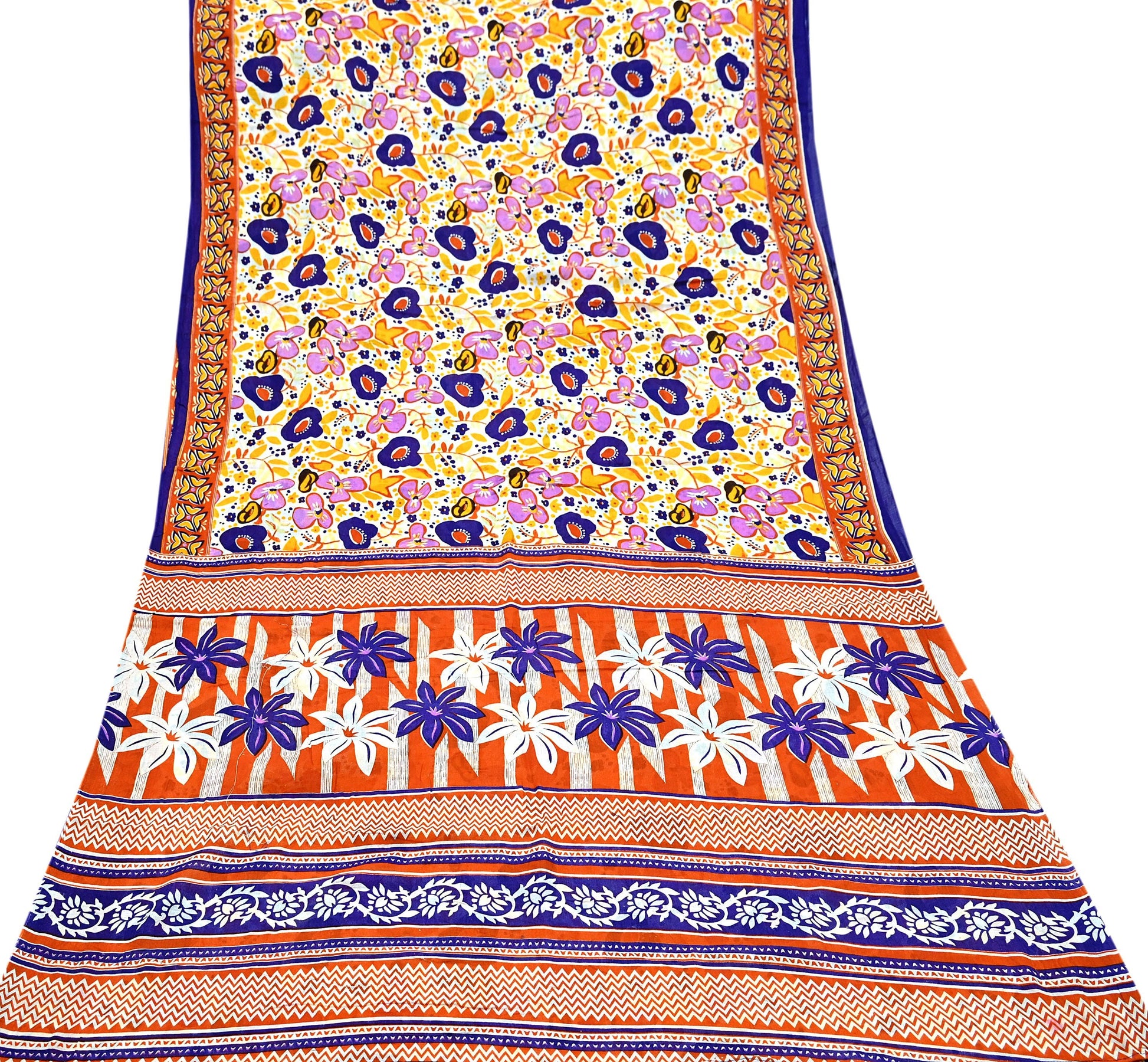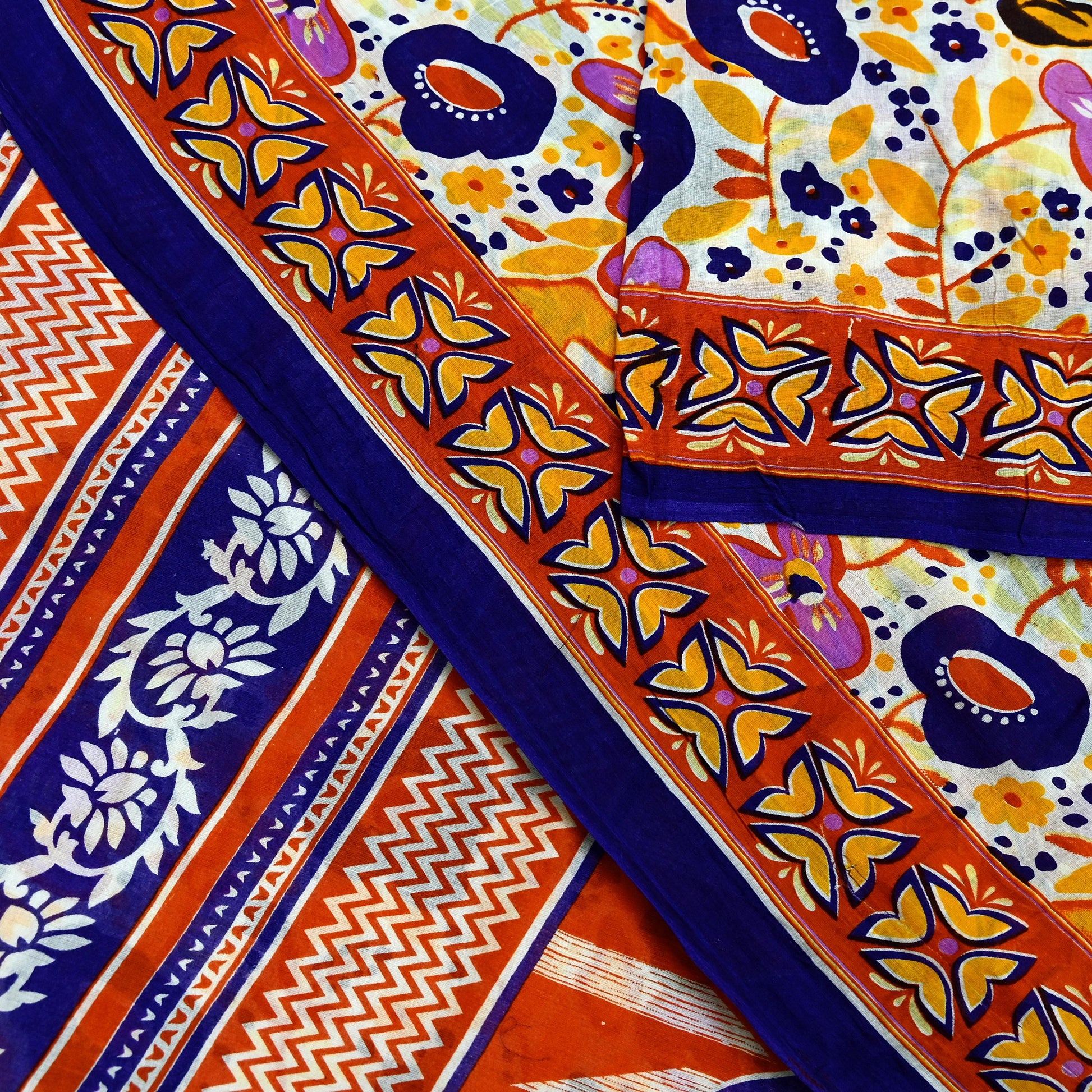 Indian Vintage Sari Orange & White Printed Pure Cotton Saree Craft Fabric 5Yd Soft Sewing Sarong Wrap Boho Dress making Crafting Quilting