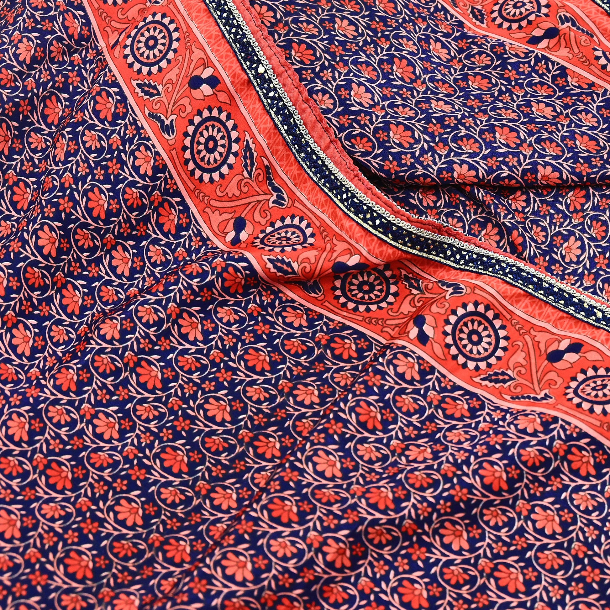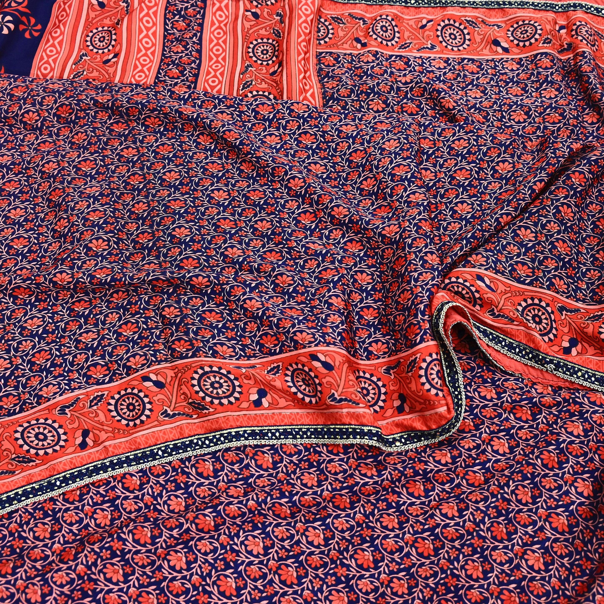 Indian Vintage Sari Peach & Blue Artificial silk Printed Sarees 5yd Craft Fabric Sewing Floral Soft Dress making Quilting Crafting Upcycle
