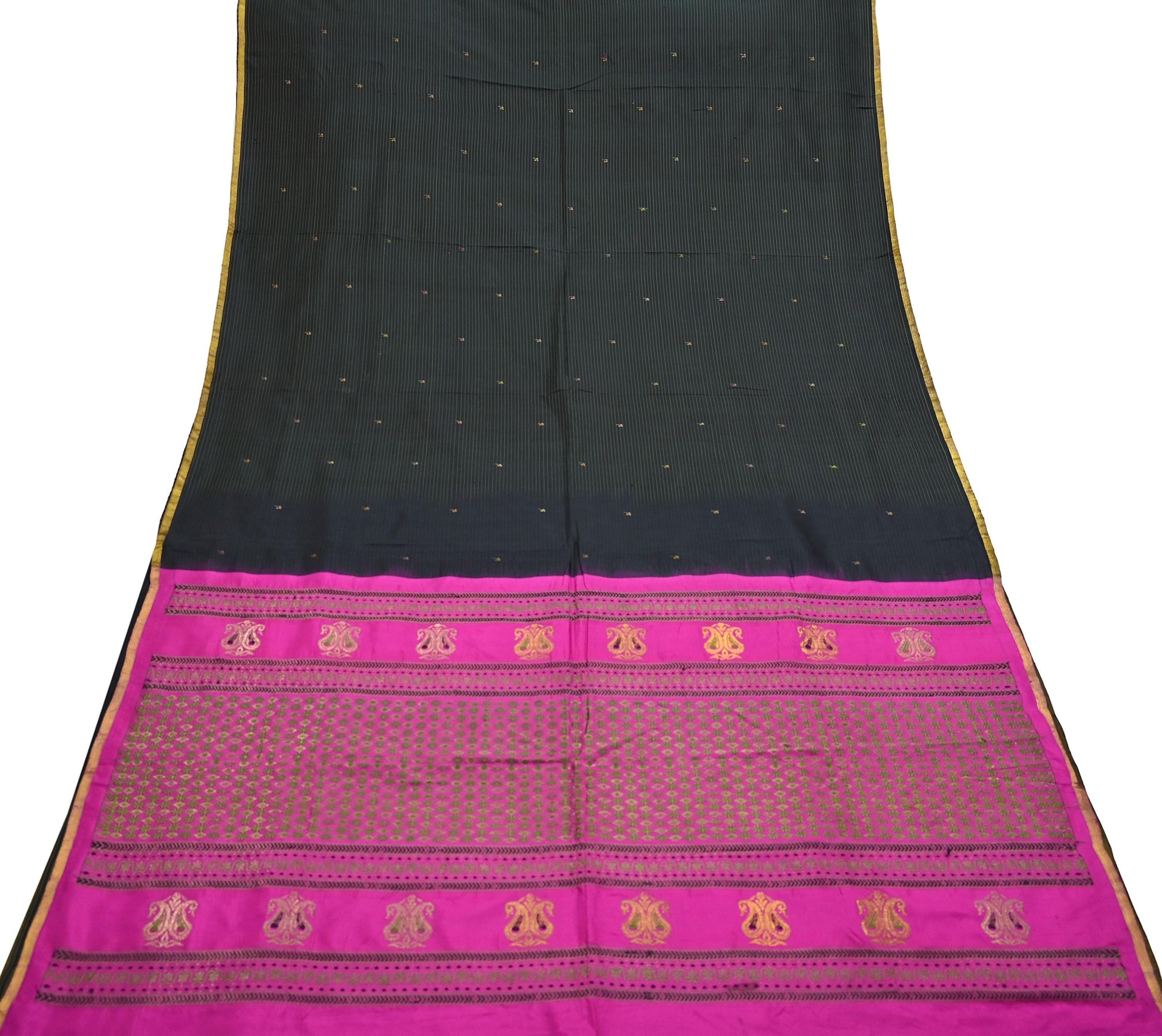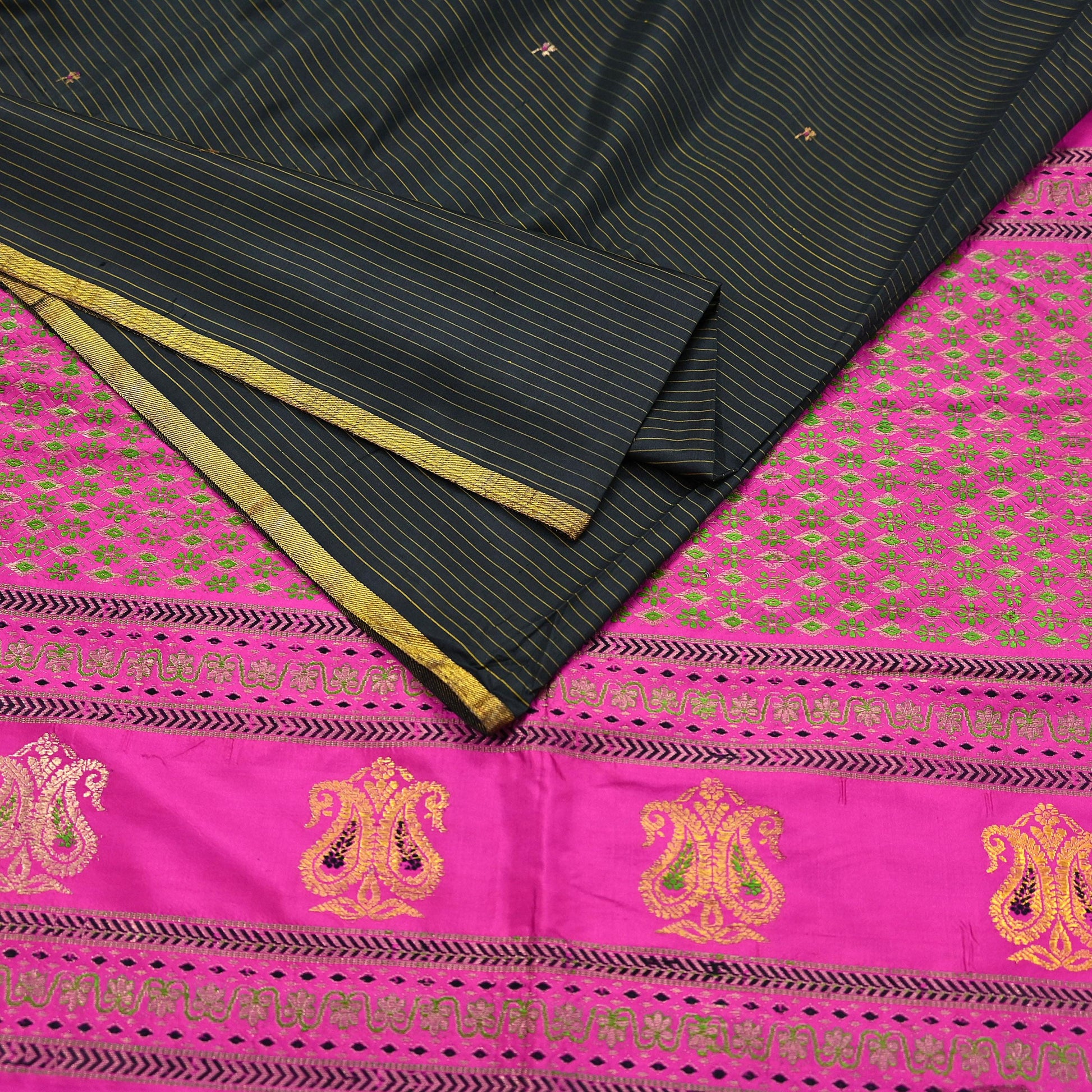Indian Vintage Sari Pink & Black Mysore Silk Hand Woven Saree with Zari Border 5 Yards Soft Craft Fabric Upcycle, Quilting, Dressmaking