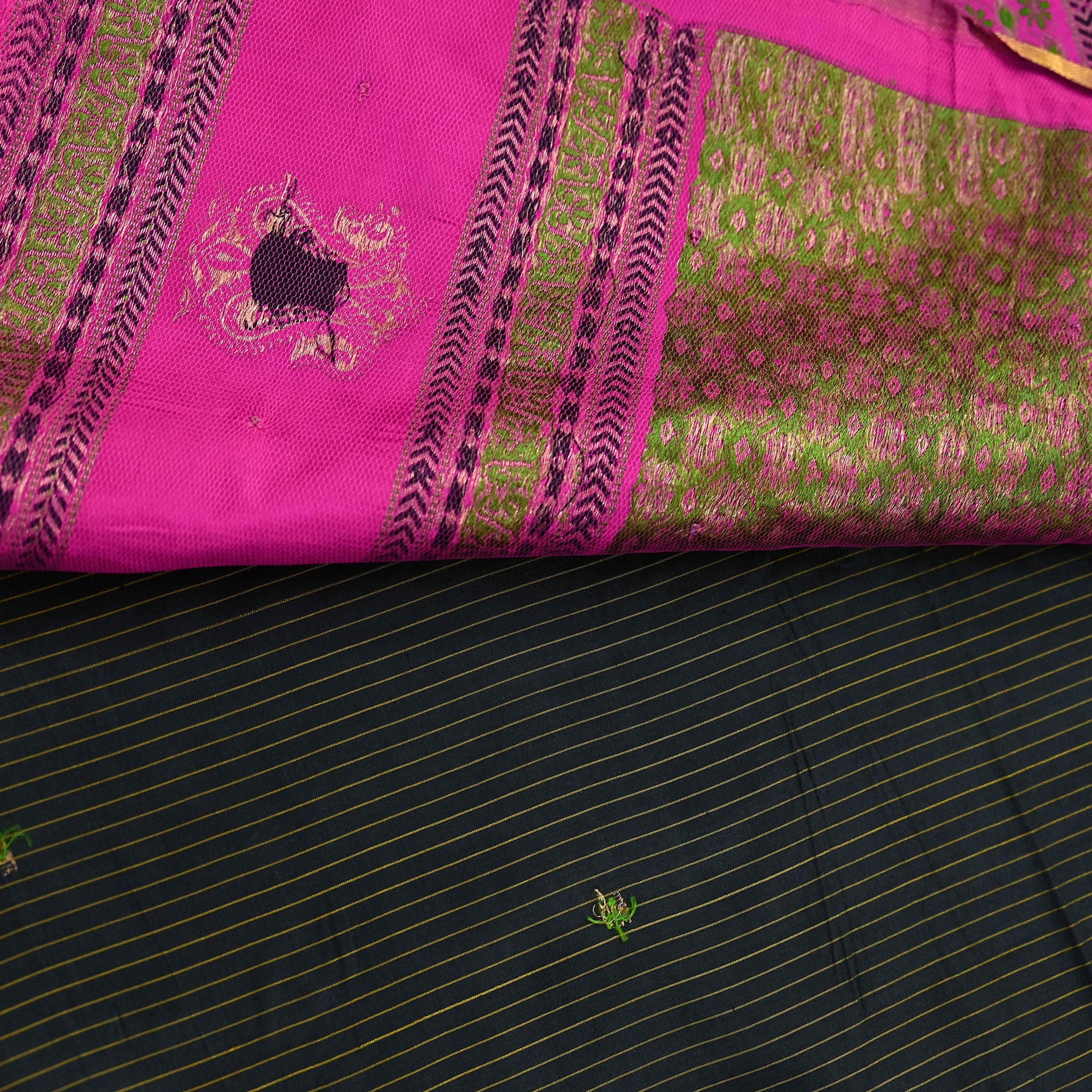 Add timeless elegance to your fabric collection with this vintage Pink & Black saree, skillfully woven from 100% pure Mysore silk. The soft texture, Paisley woven motifs, and shimmering gold zari border create a classic South Indian appeal that’s perfect for both traditional and contemporary creative uses.