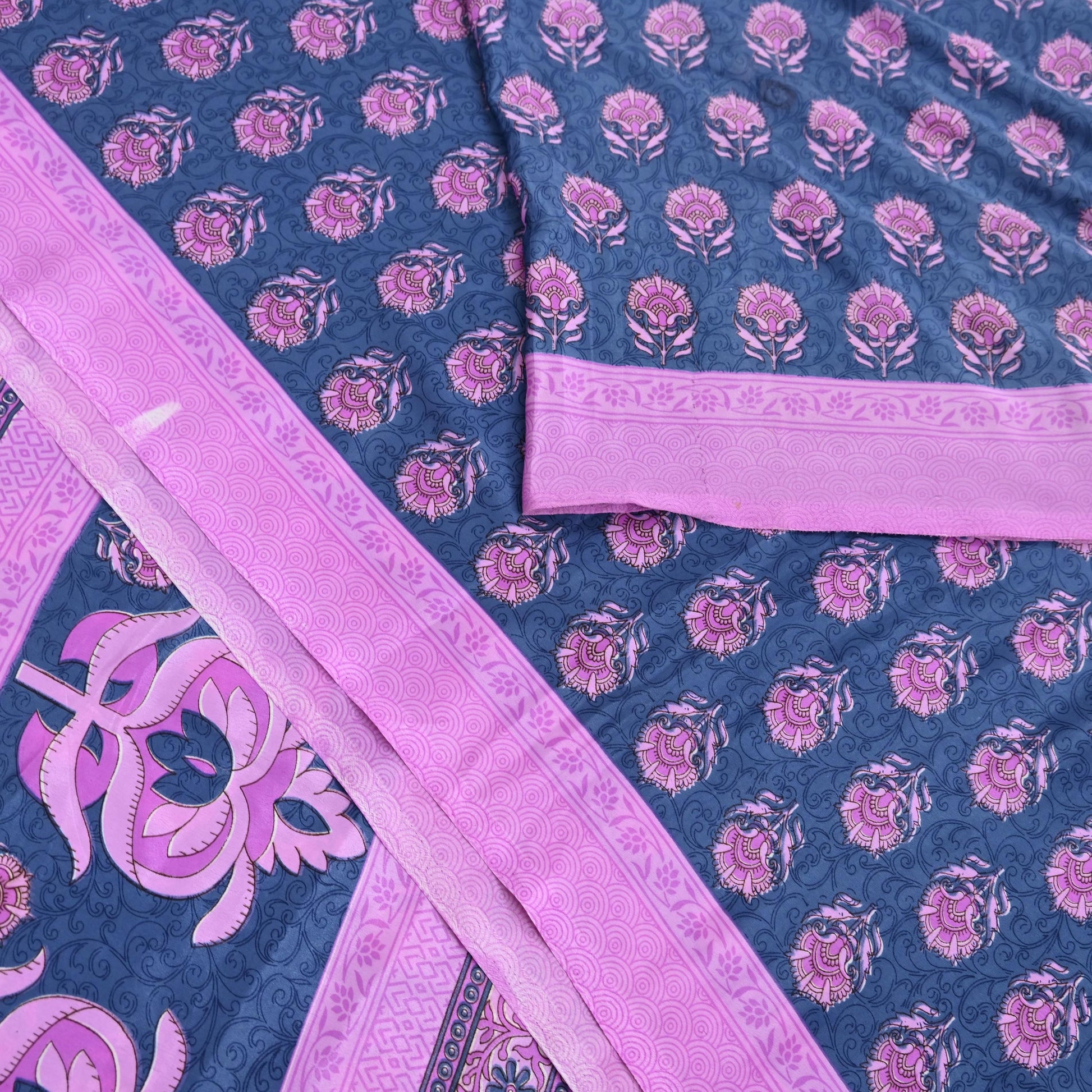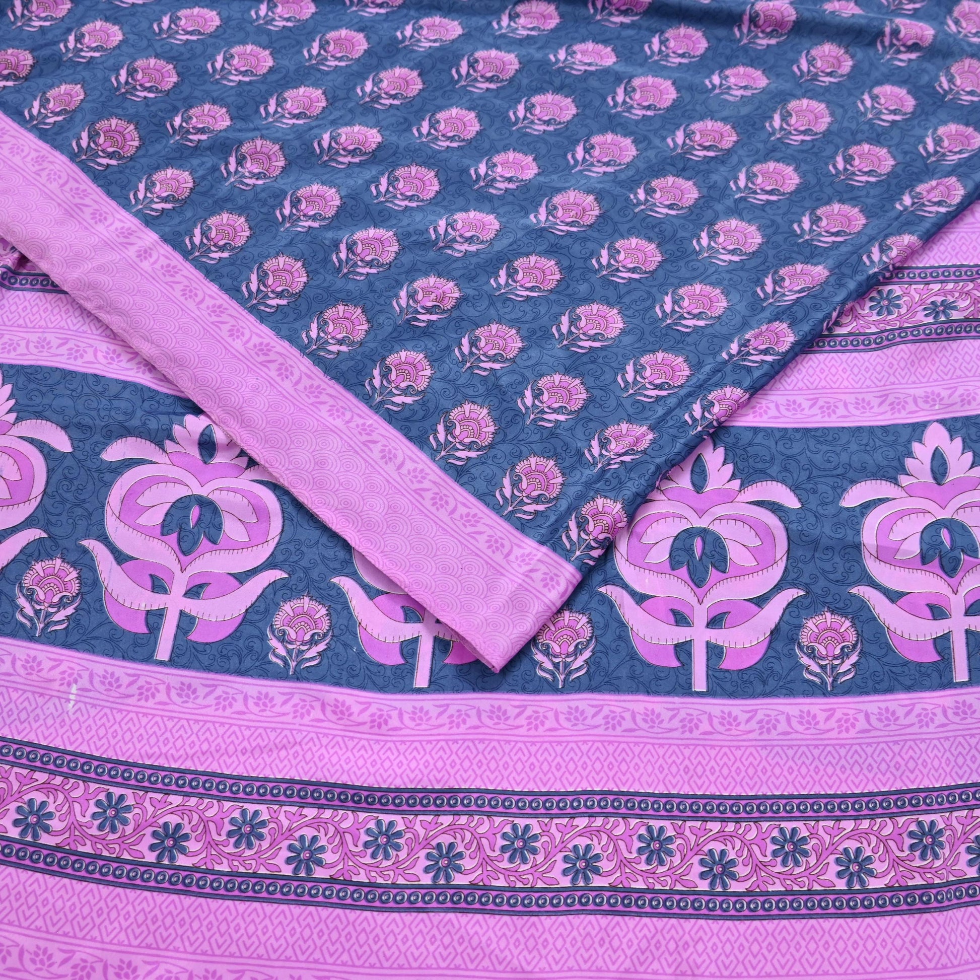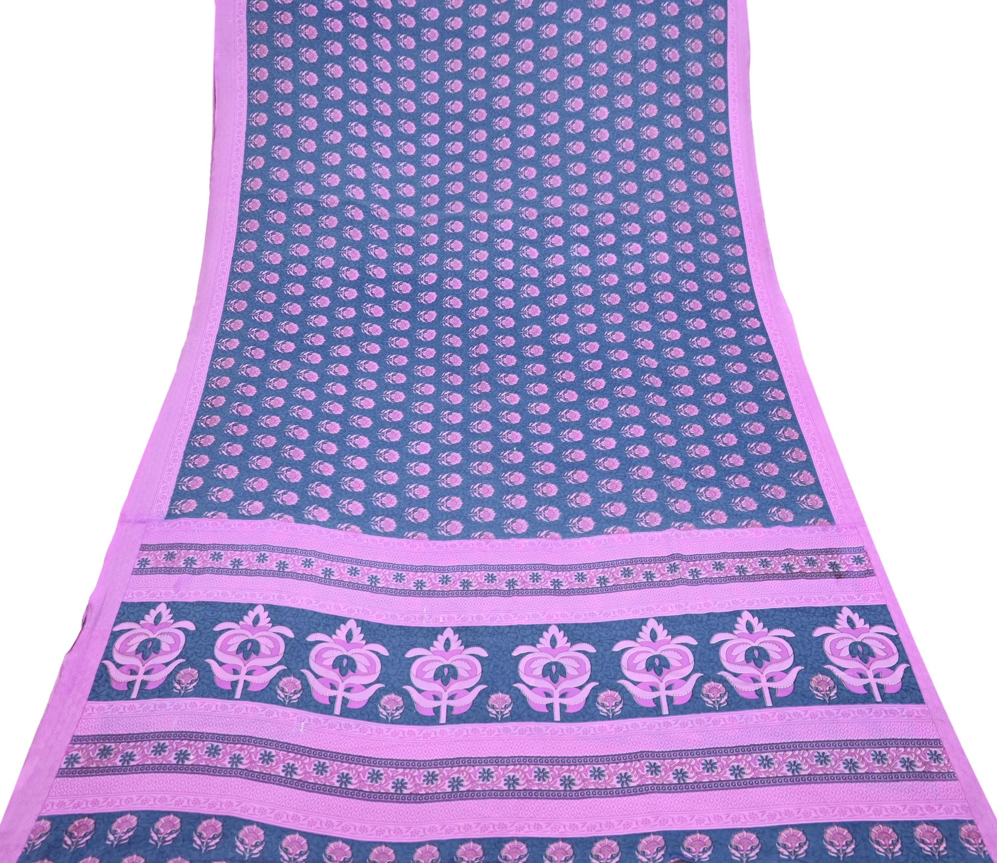 Indian Vintage Sari Pink & Gray Moss Crepe Printed Sarees 5yd Craft Fabric Sewing Floral Soft Dress making Quilting Crafting Upcycle Used