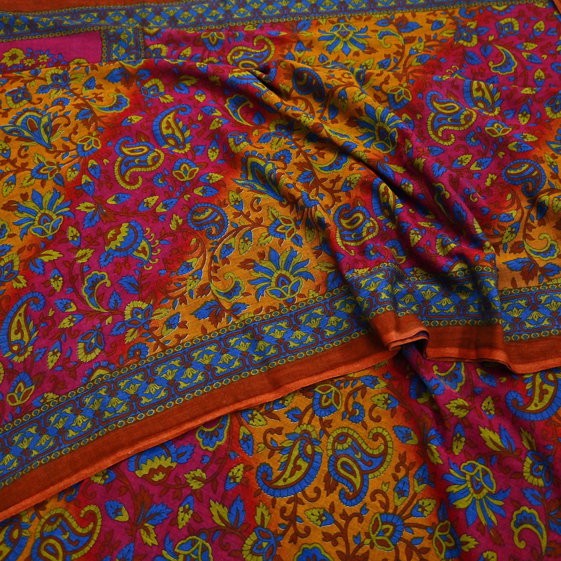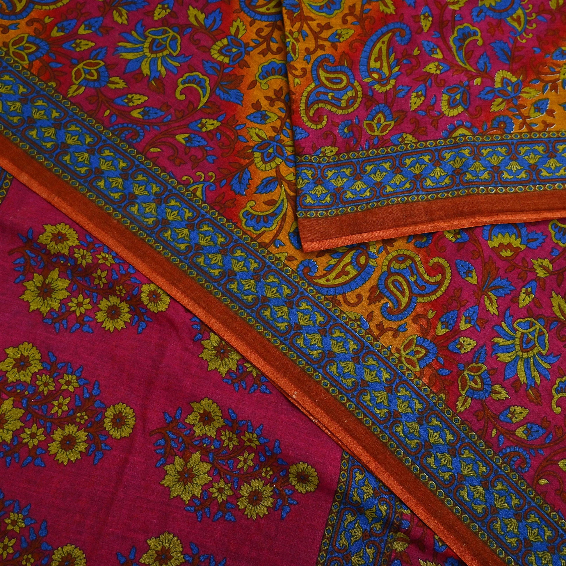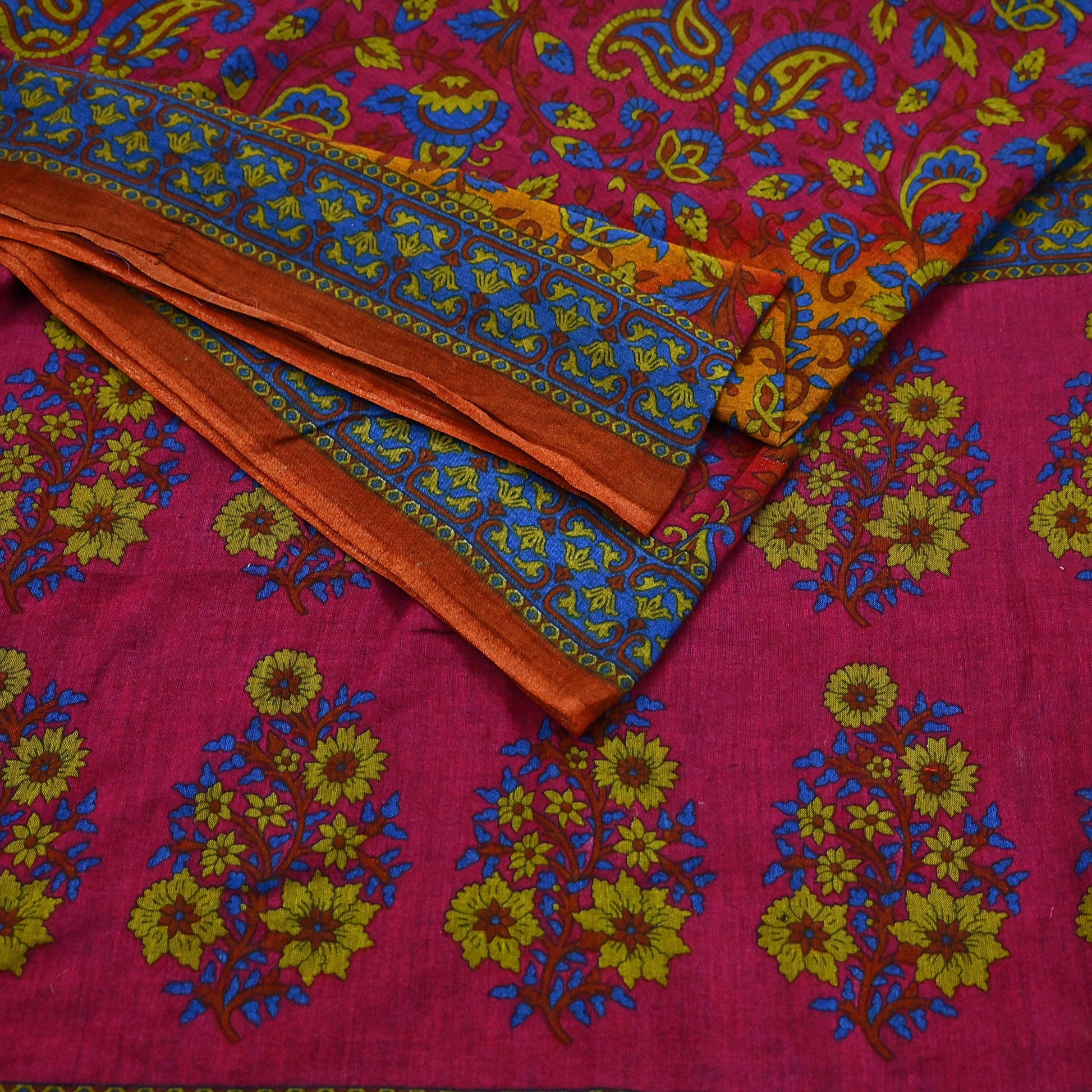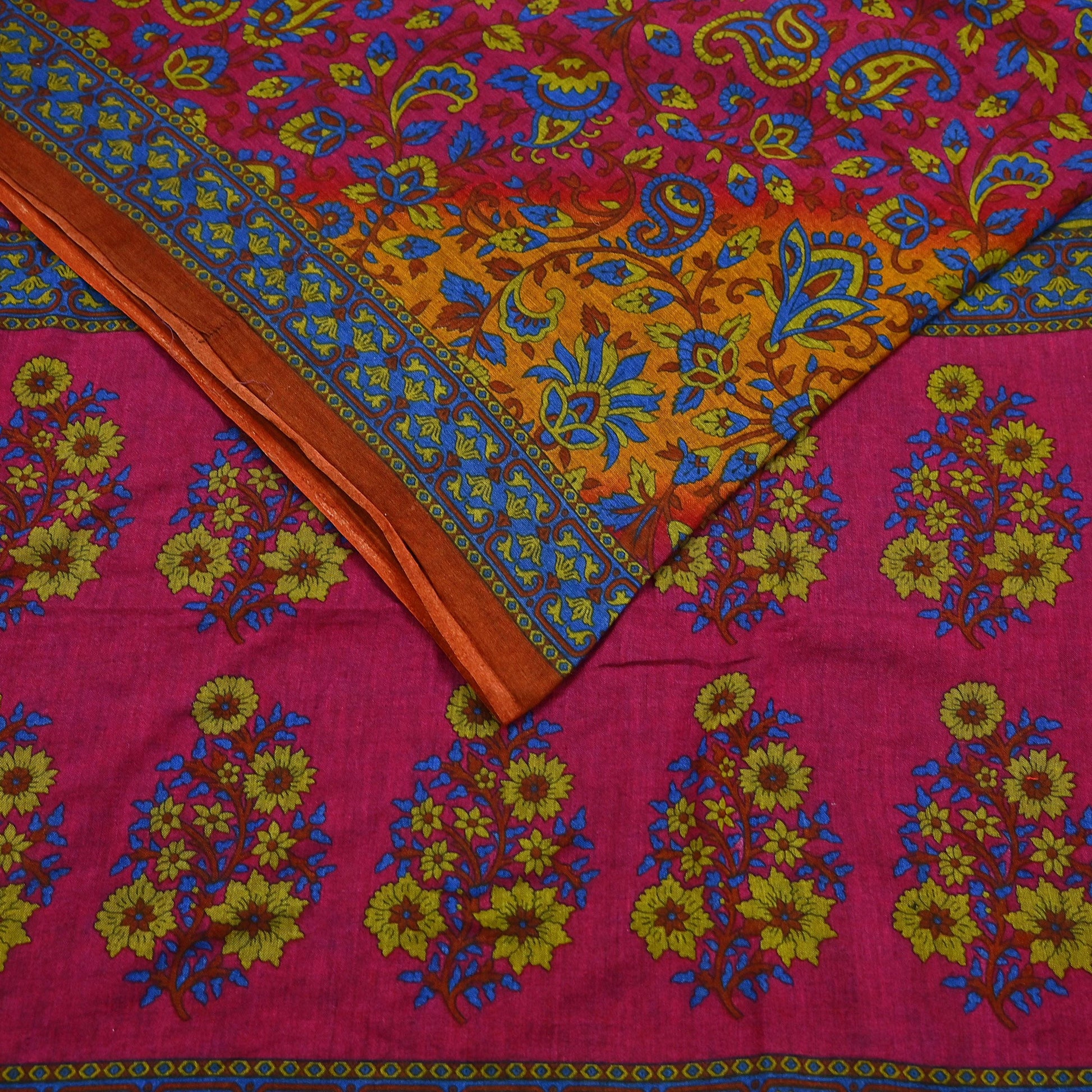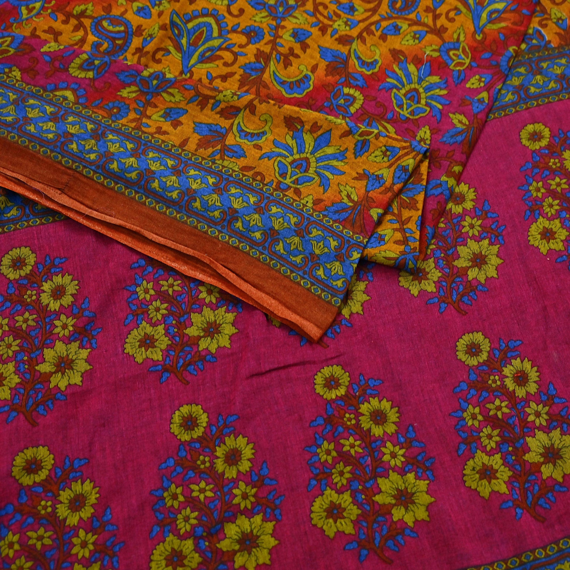 Indian Vintage Sari Pink & Mustard Pure Cotton Printed Sarees Craft Fabric Soft 5Yd Sarong Wrap Boho Fabric Kimono Quilting Crafting Upcycle