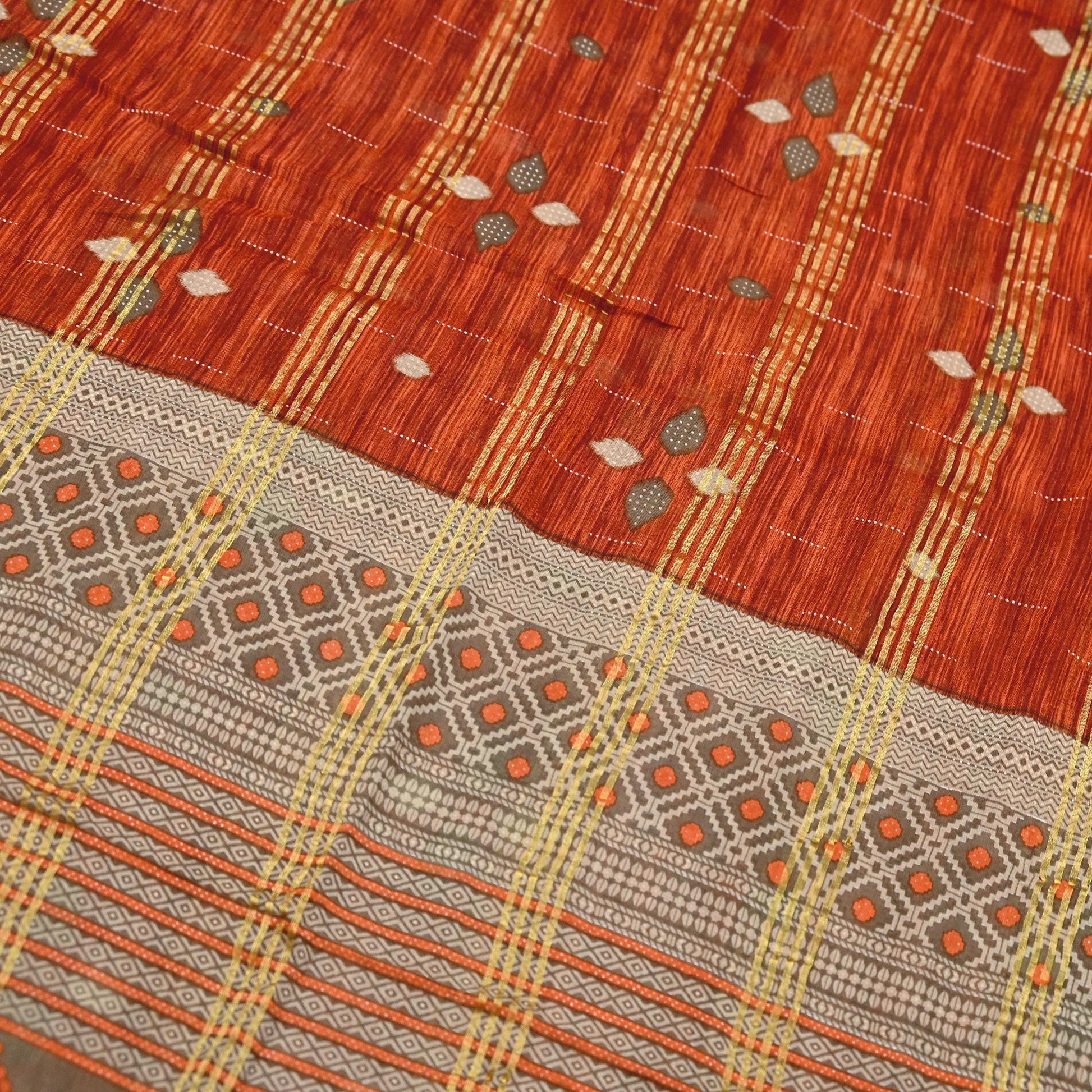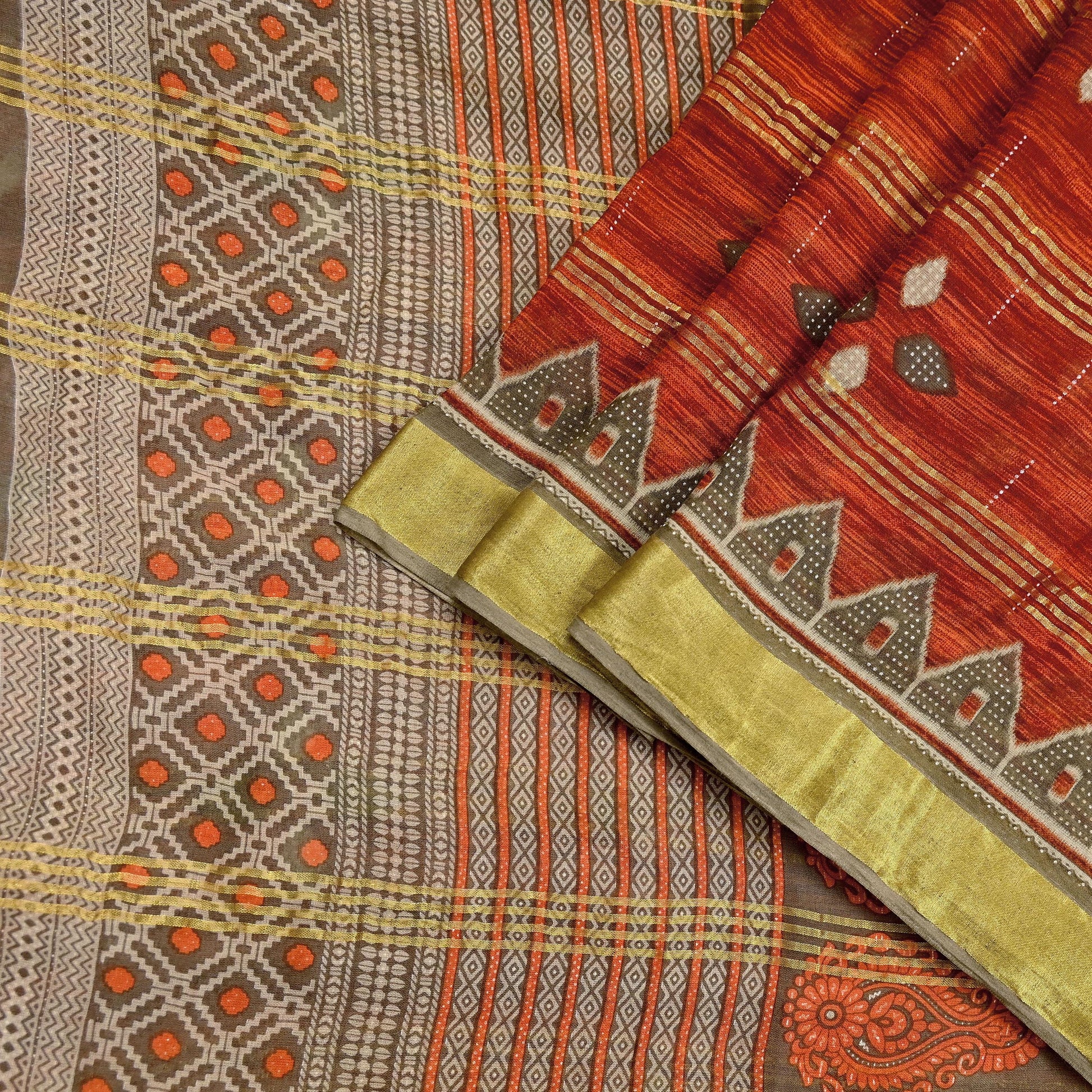Nice Floral Design With Batik Printed Work On Brown, Maroon & Orange Color Base Fabric Is Really Enhancing The Beauty Of The Saree.