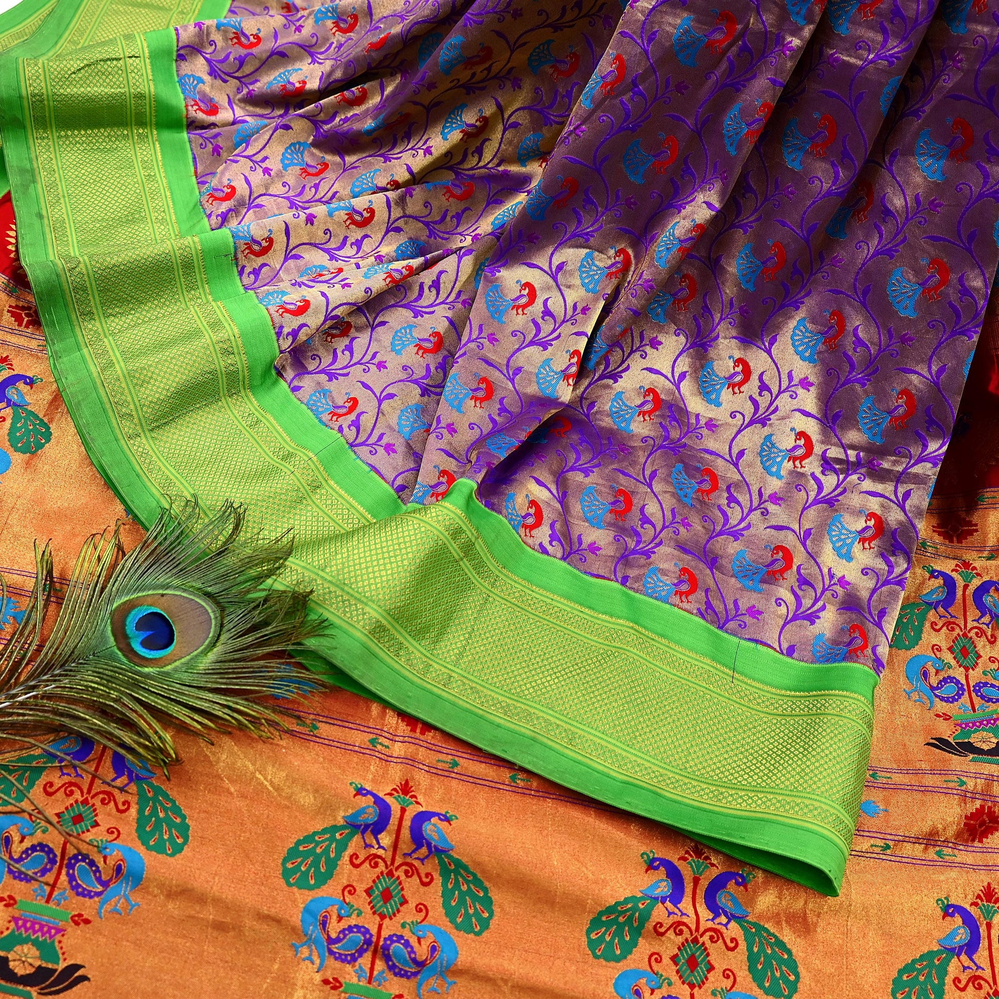 *Vintage Green, Red & Purple Pure Silk Paithani Saree 100% Real Golden Zari Hand Woven Paithani Saree.