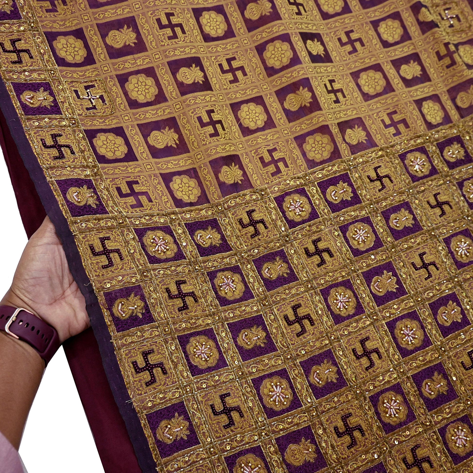 The meticulous beadwork paired with floral design on a rich maroon base fabric creates a luxurious and timeless appeal—perfect for special occasions or creative repurposing.