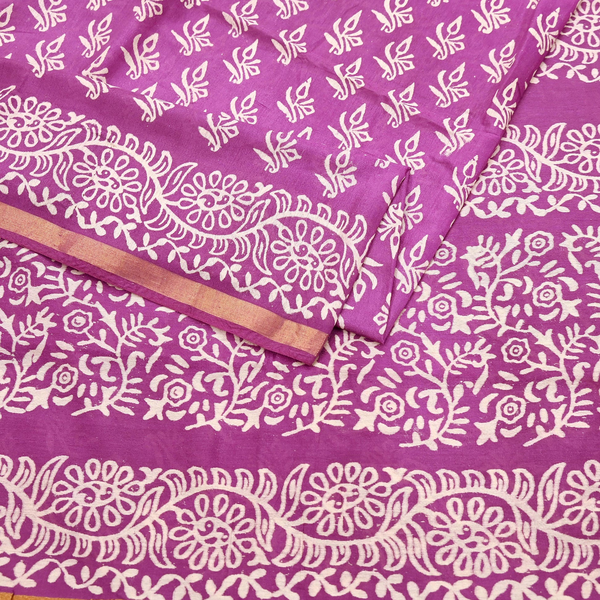 Vintage Purple Colored 100% Pure Chanderi Cotton Block Printed Sari.