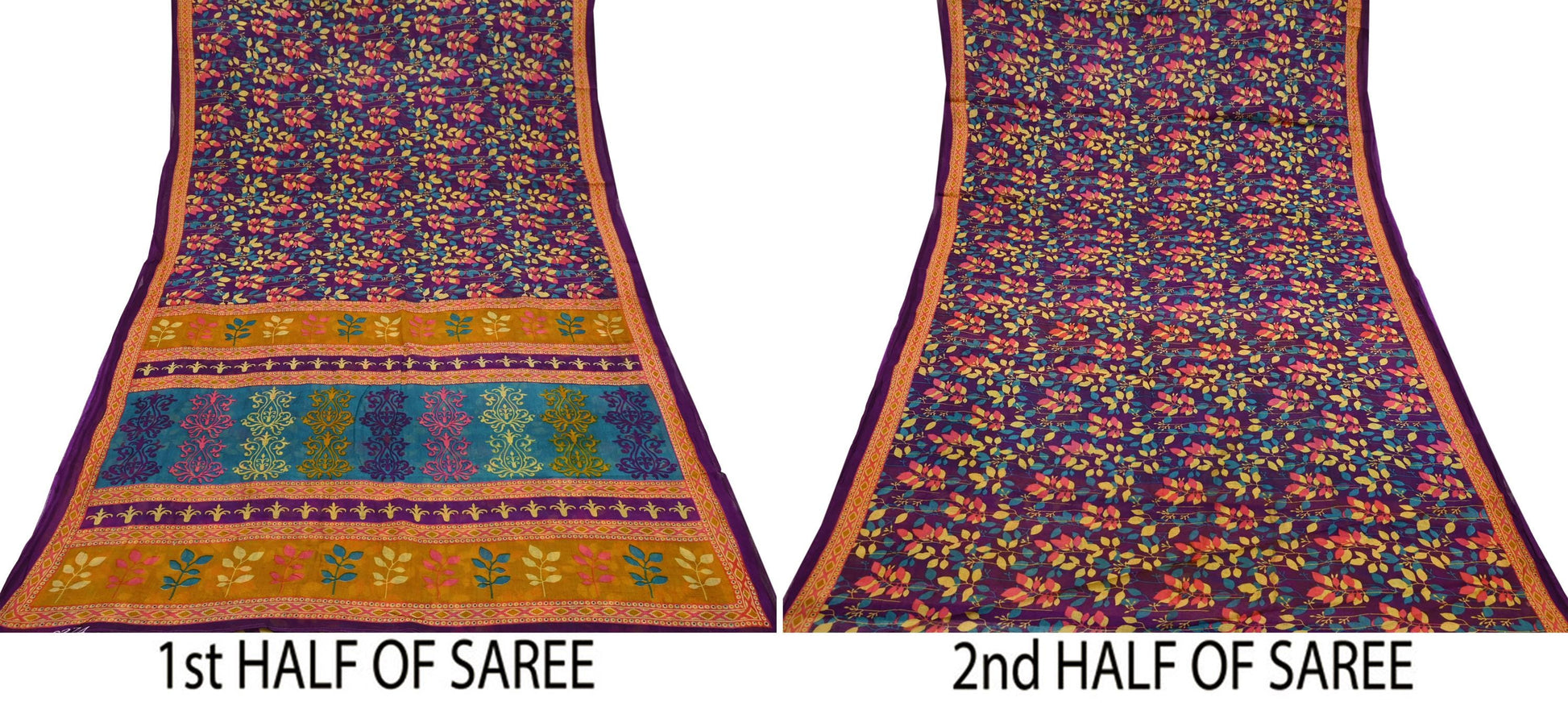 Indian Vintage Sari Purple Pure Cotton Printed Sarees Craft Fabric Soft 5Yd Sarong Wrap Boho Fabric Kimono Quilting Crafting Upcycle