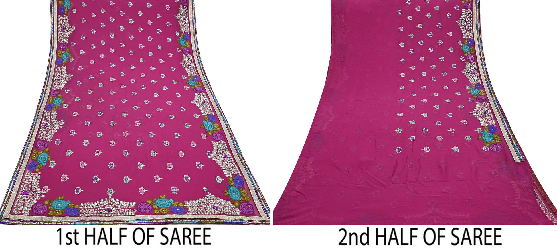 Indian Vintage Sari Rani Pink Pure Georgette Silk Hand Embroidered Sarees Ethnic Fabric 5Yd Sewing Soft Ethnic Glass Beaded Wedding Sarees