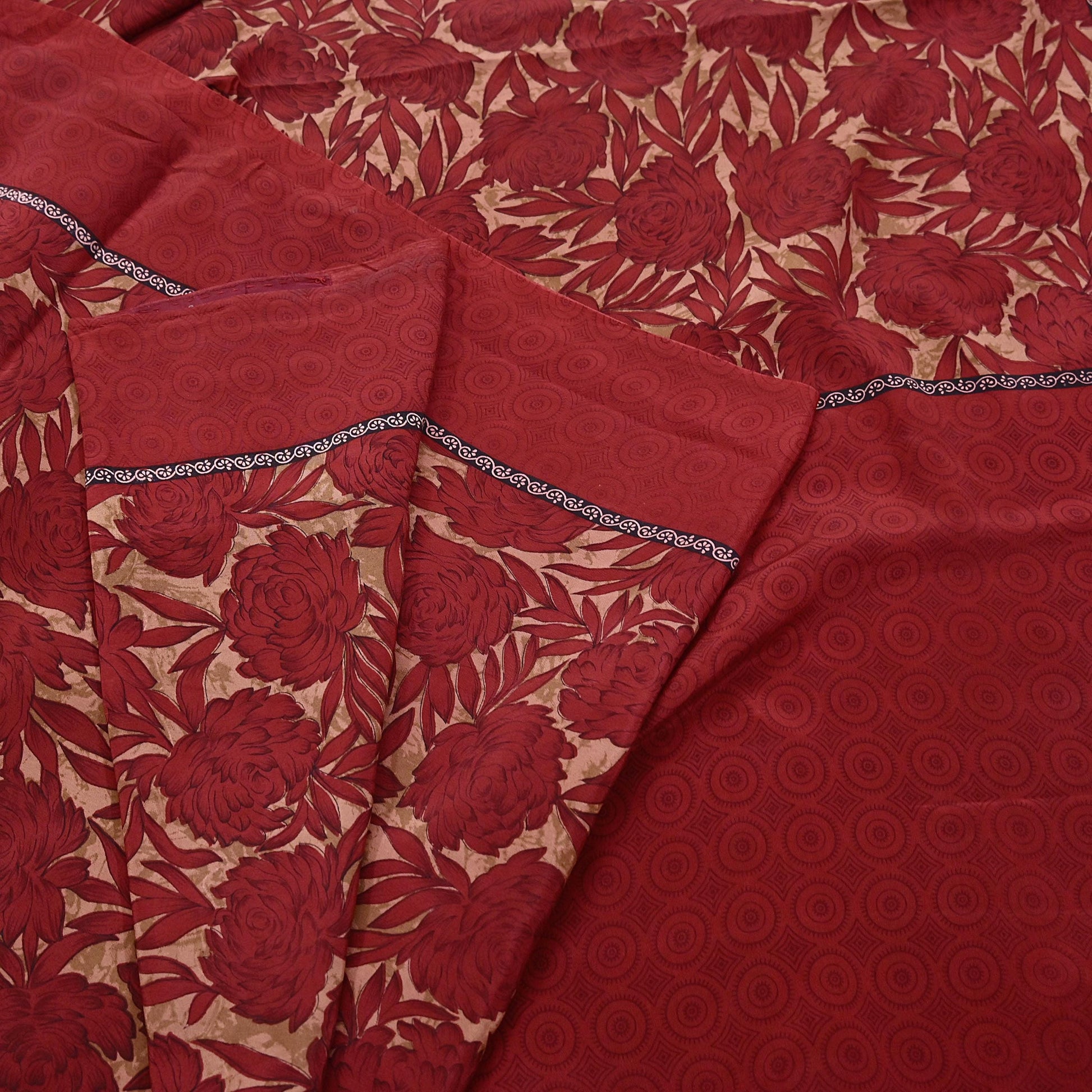 Indian Vintage Sari Red & Brown Pure Crepe Silk Printed Saree 5yard Sewing Quilting Floral Soft Craft Fabric Wrap