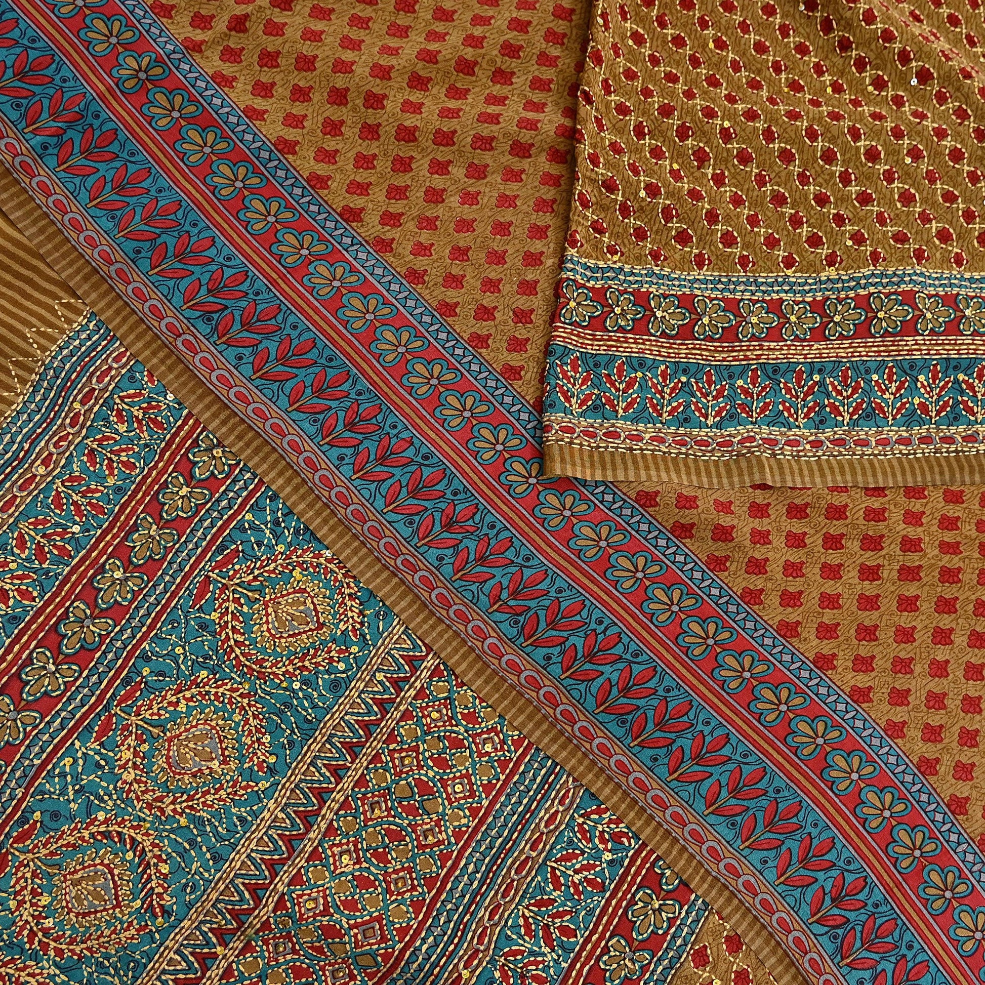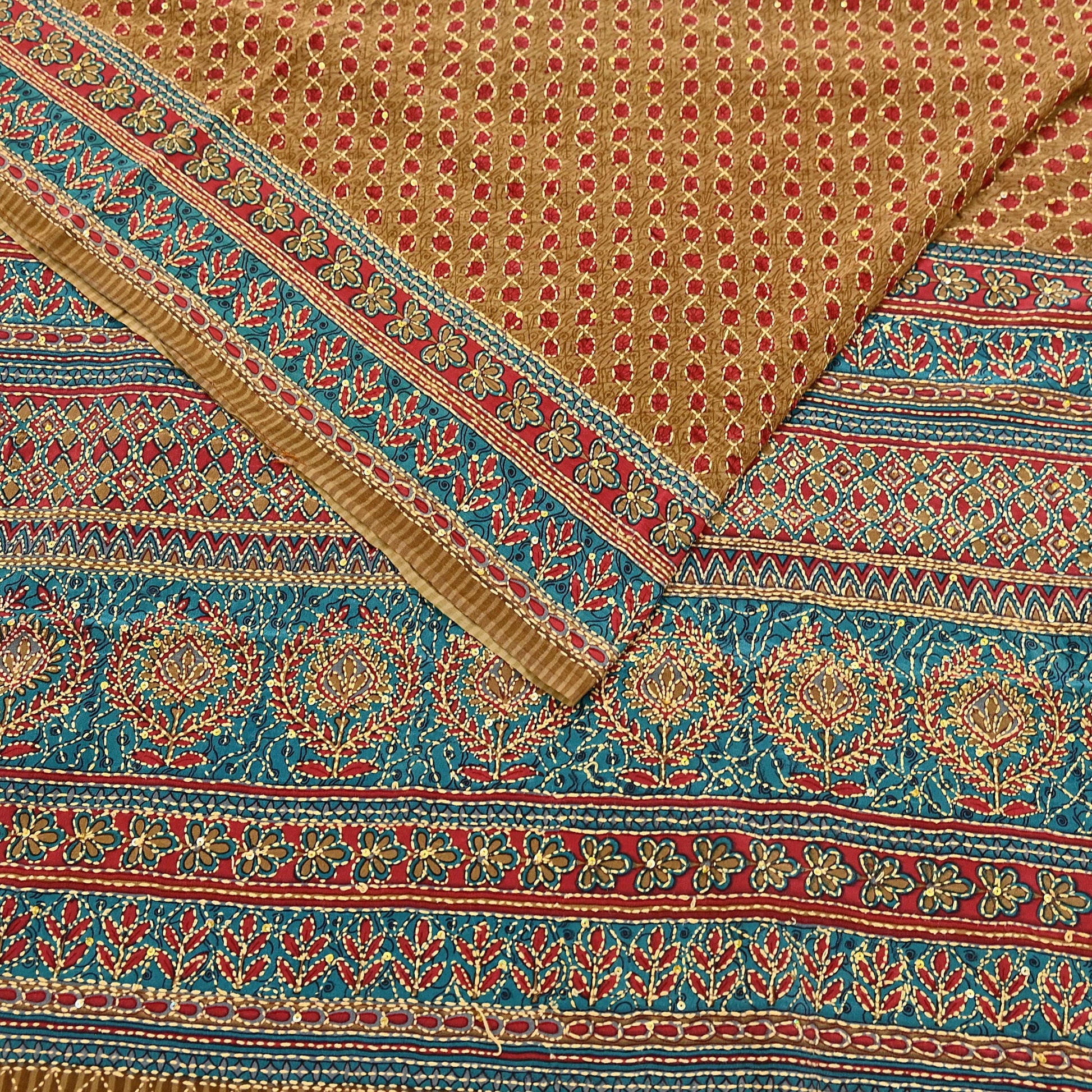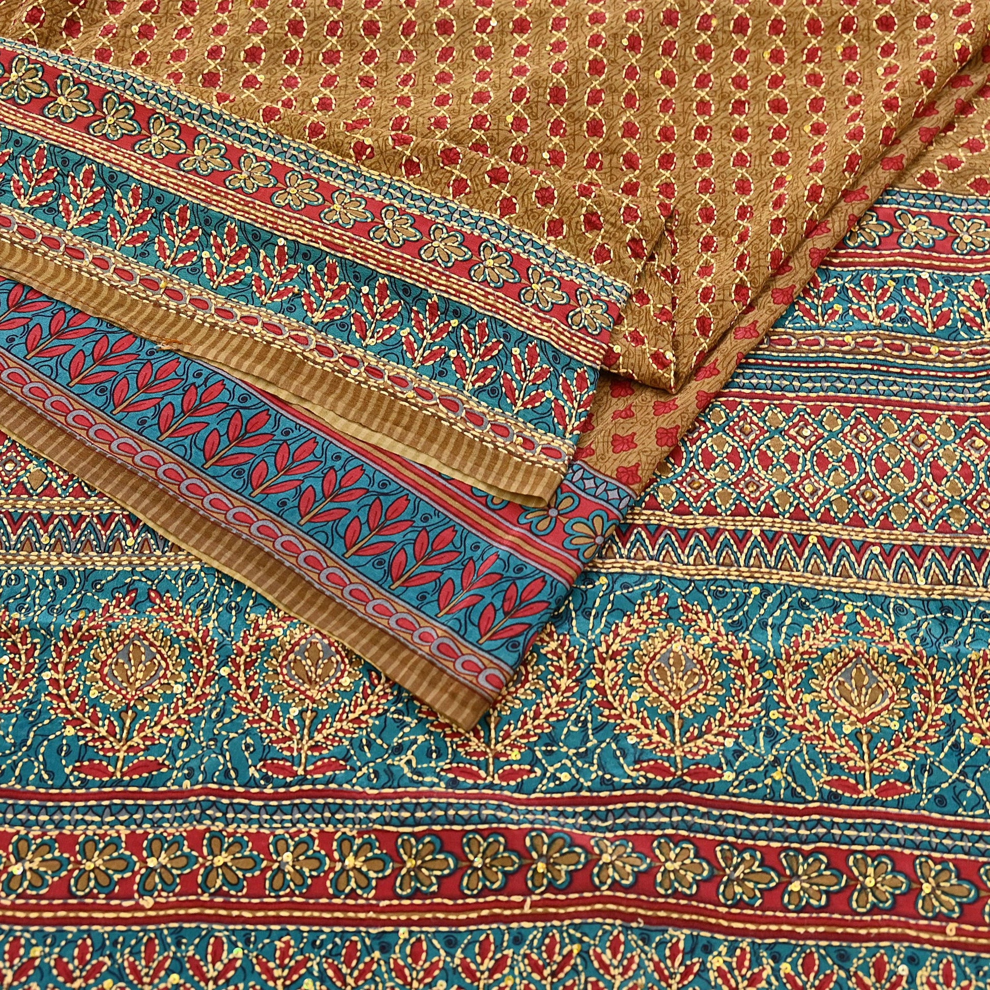 Indian Vintage Sari Red & Green Pure Crepe Silk Hand Embroidered Kantha Saree 5yd Craft Fabric Sewing Floral Soft Dress making Crafting