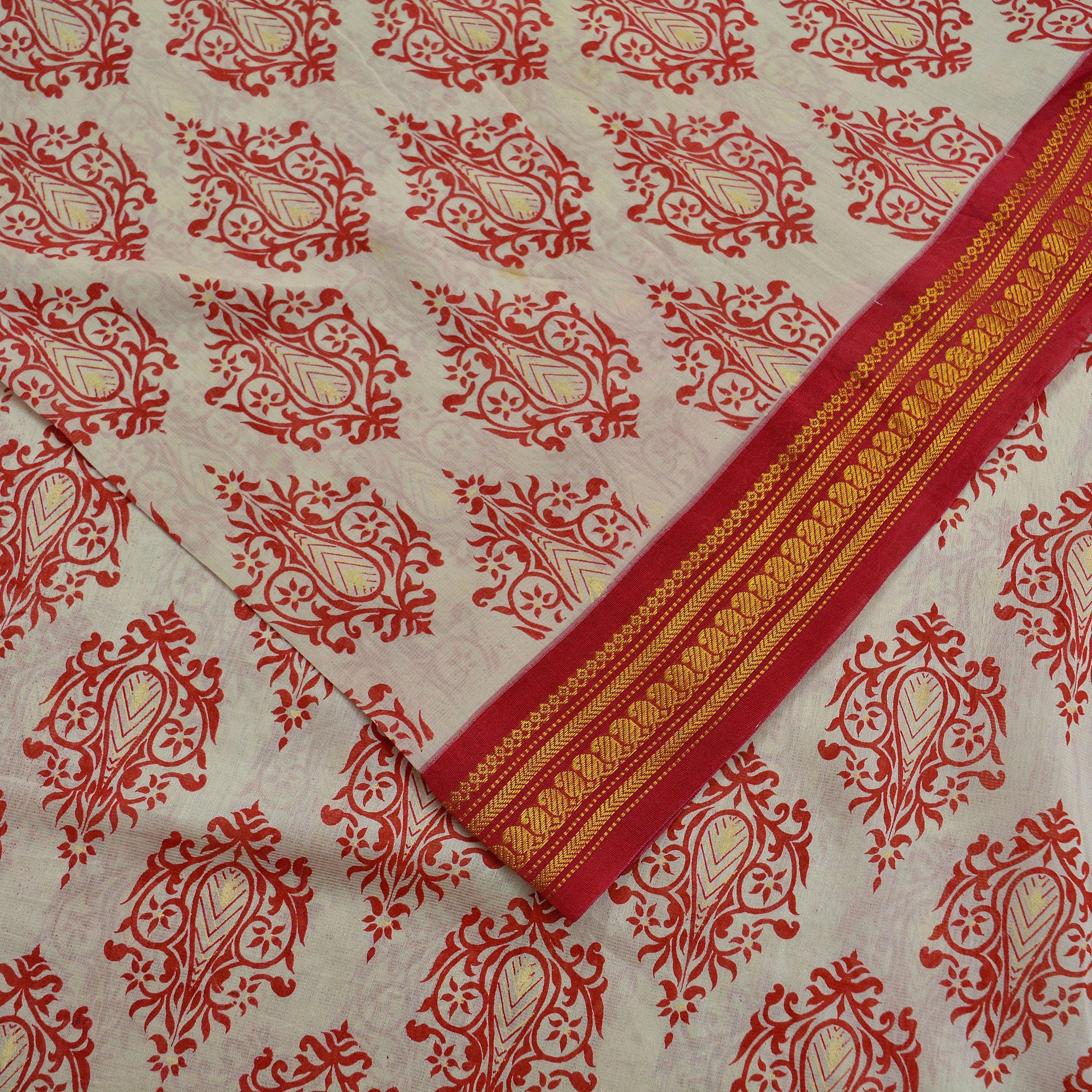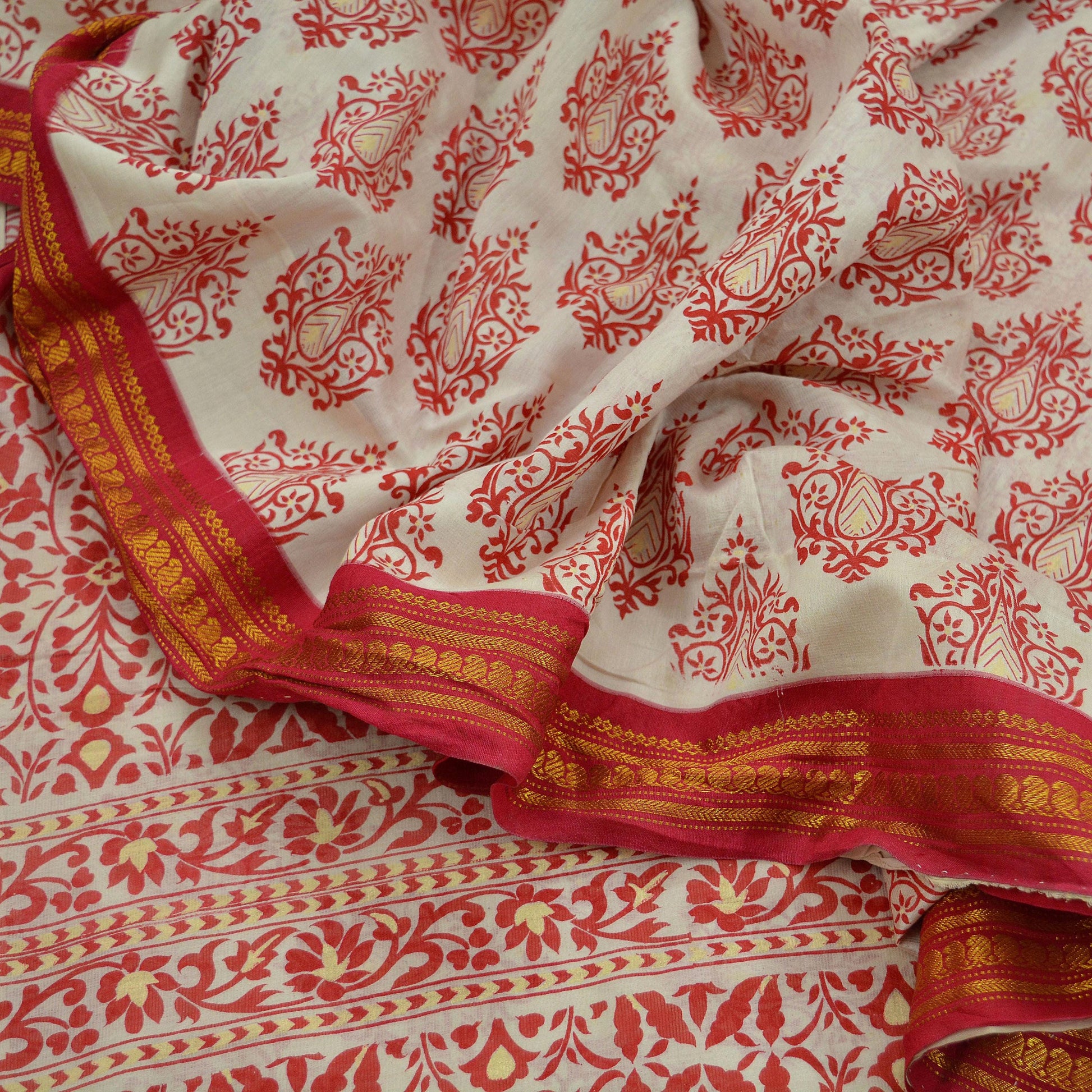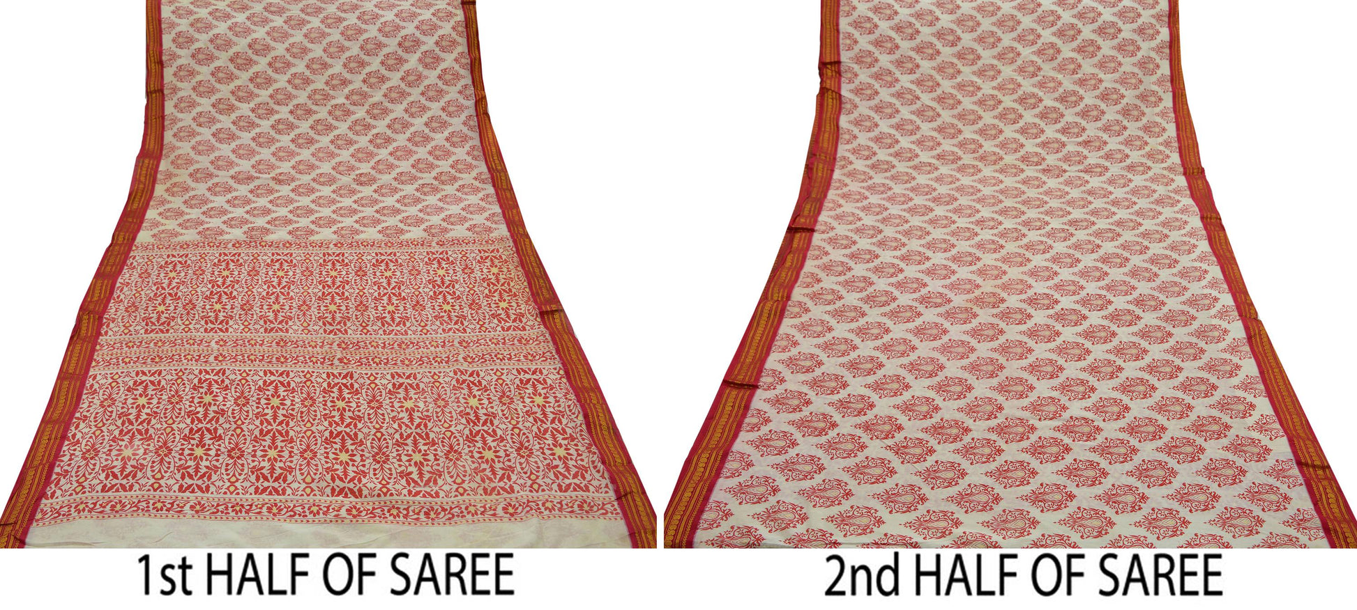 Indian Vintage Sari Red & White 100% Pure Silk Hand Woven Printed Sarees Craft Fabric 5yd Sewing Soft Dress Designing Crafting Zari Border