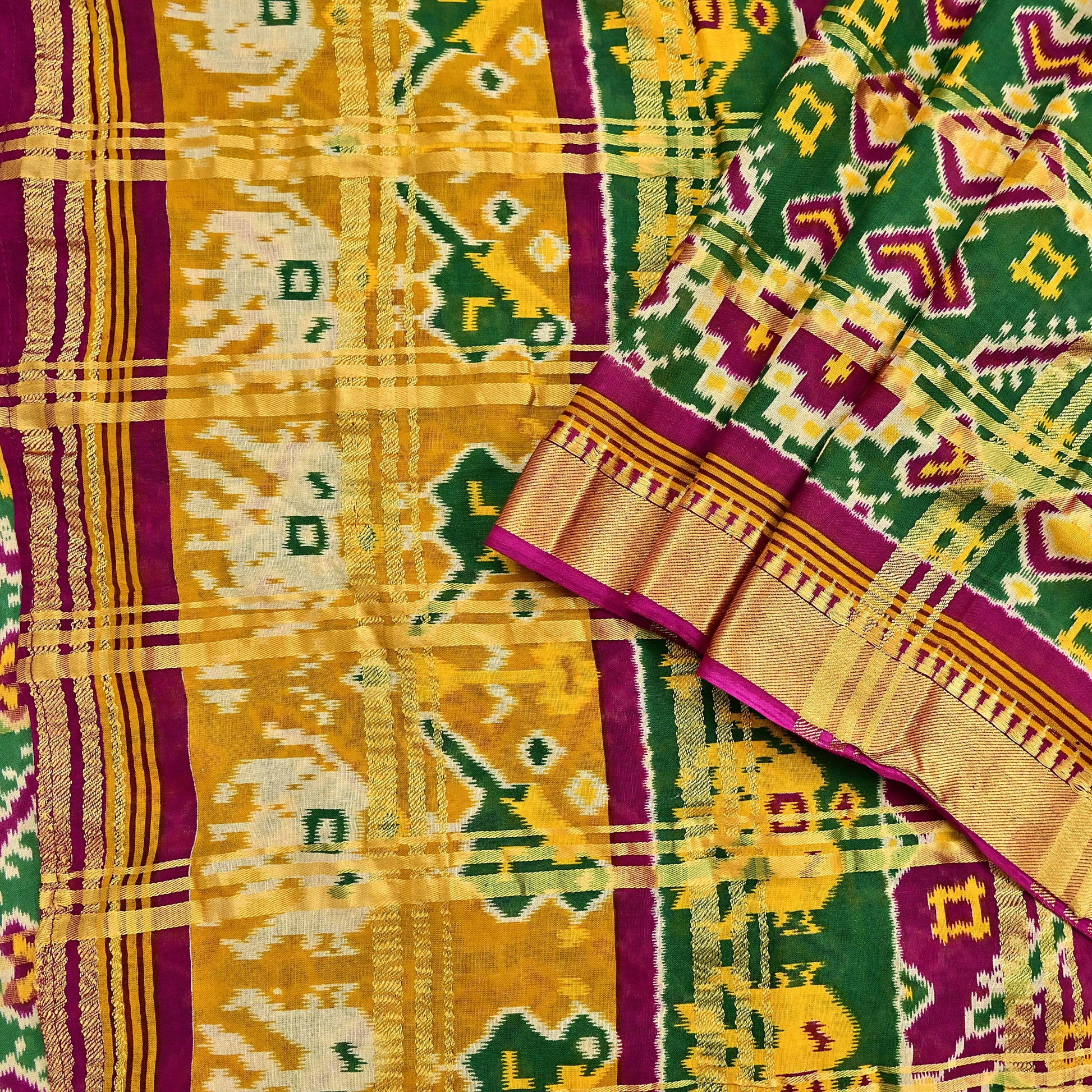 *Vintage Saffron & Green Colored Ikat Printed Pure Cotton Saree.