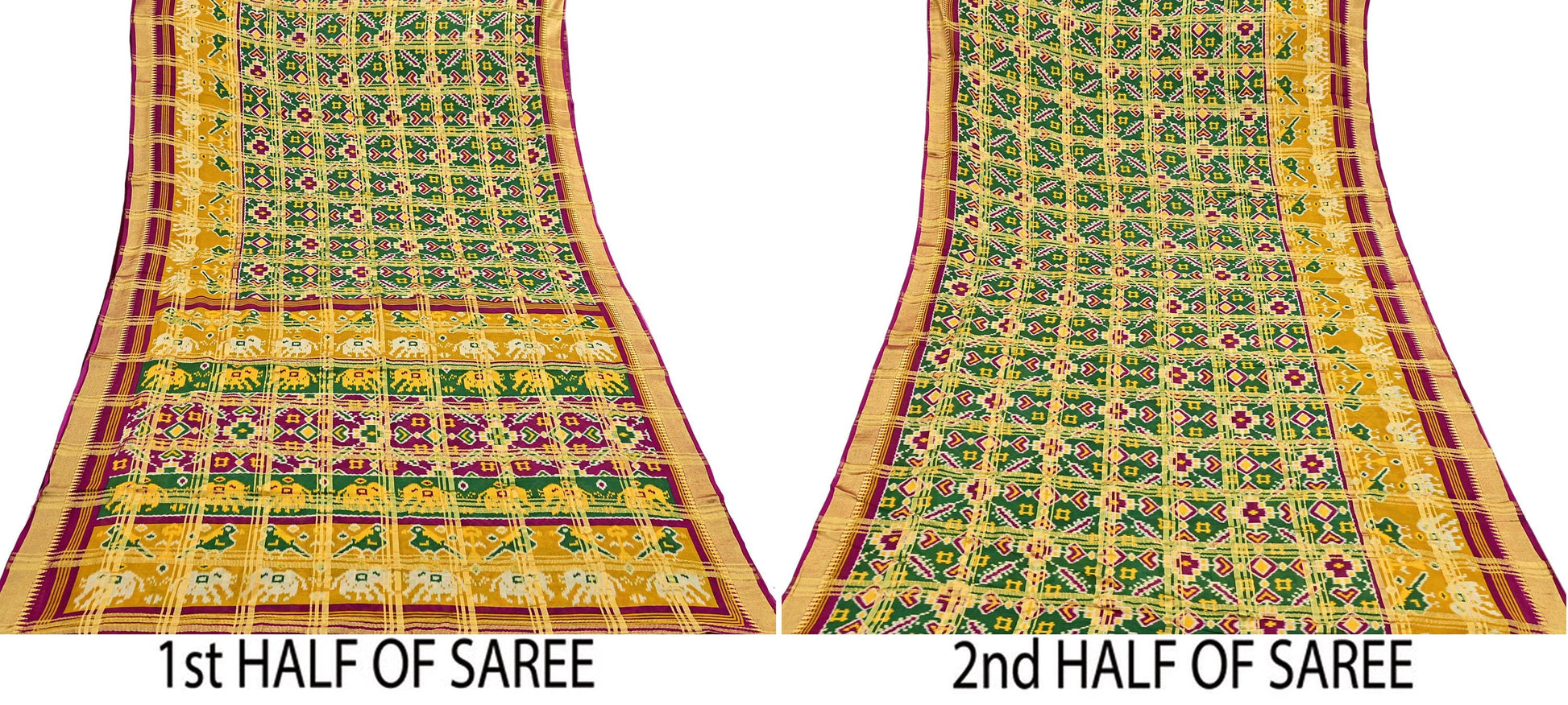 Indian Vintage Sari Saffron & Green Ikat Printed Pure Cotton Sarees Craft Fabric 5Yd Soft Sewing Sarong Wrap Boho Quilting Dress making