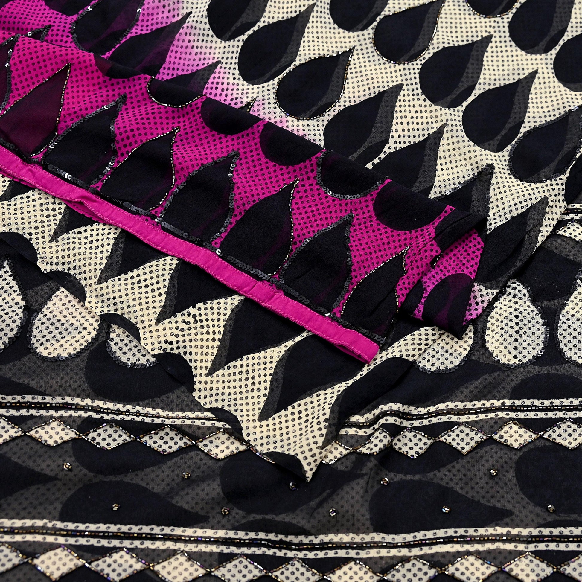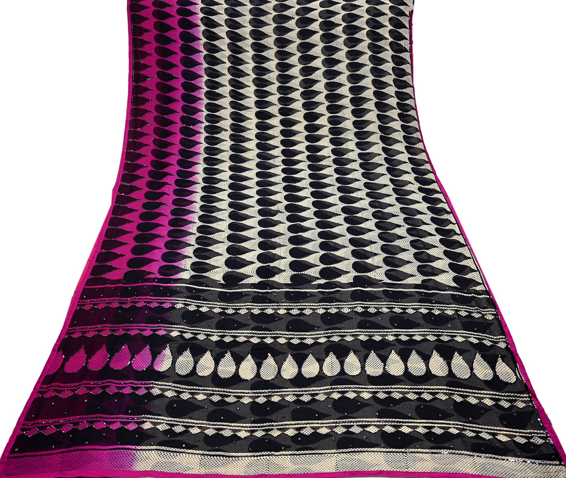 Indian Vintage Sari White & Black Hand Embroidered Printed Pure Georgette Silk Sari Saree Fabric 6Yd Sequins