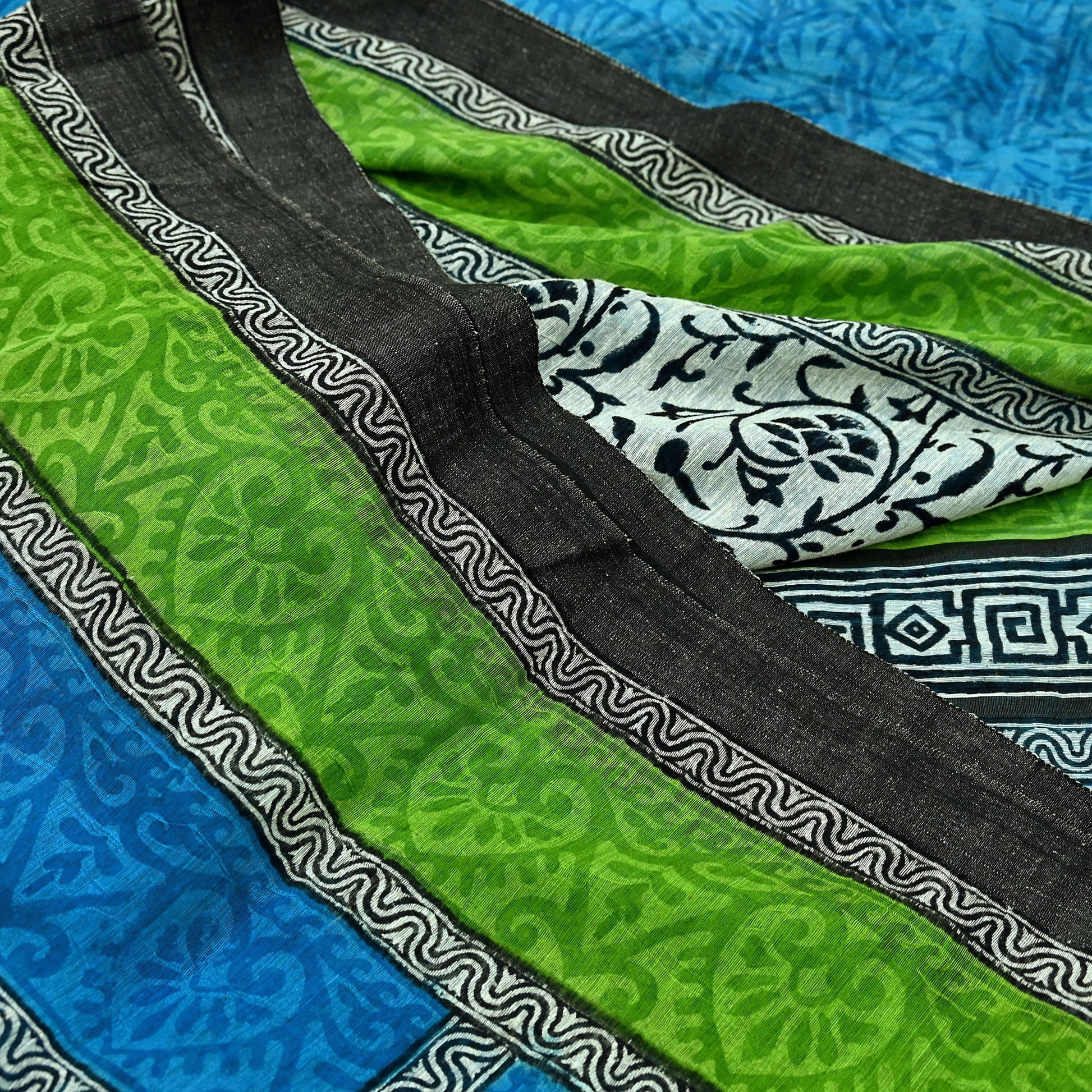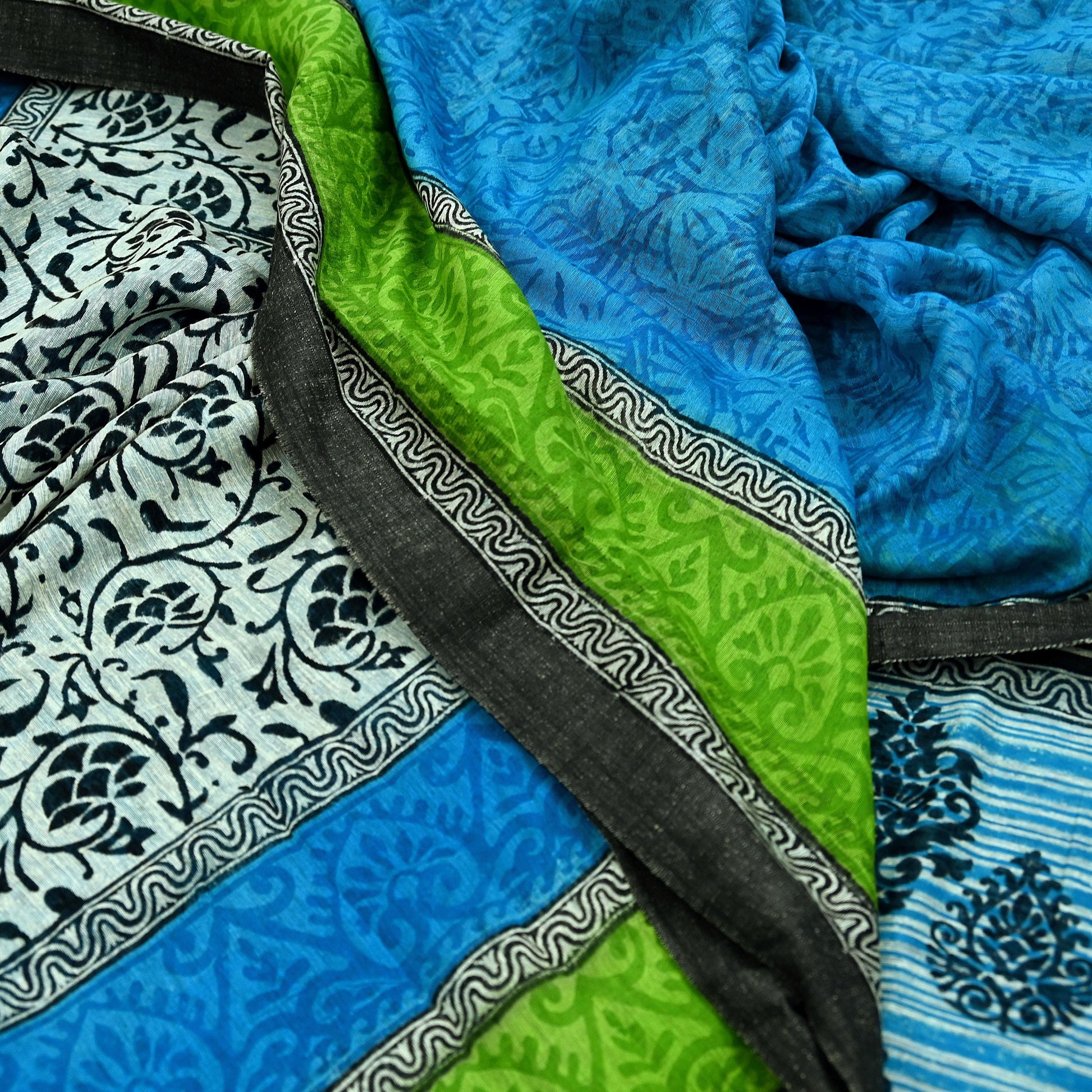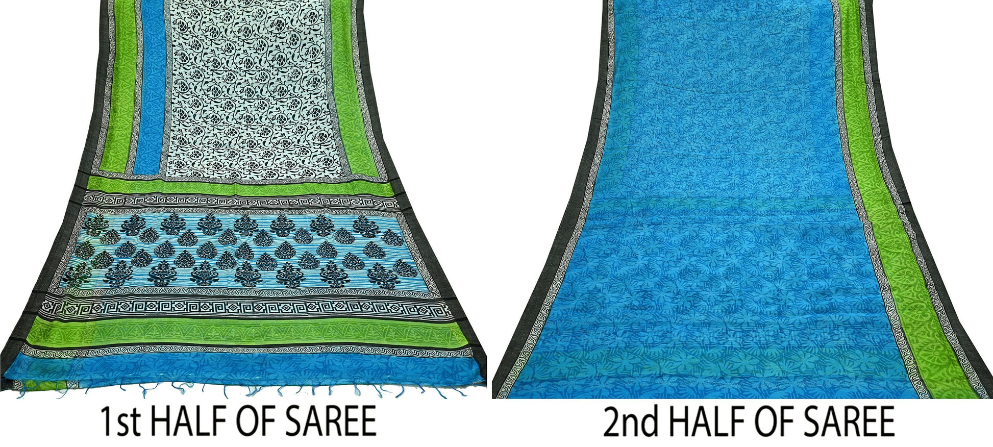 Indian Vintage Sari White & Blue Pure chanderi Silk Block Printed Sarees Craft Fabric 5Yd Fringes Floral Dress making bollywood sarees