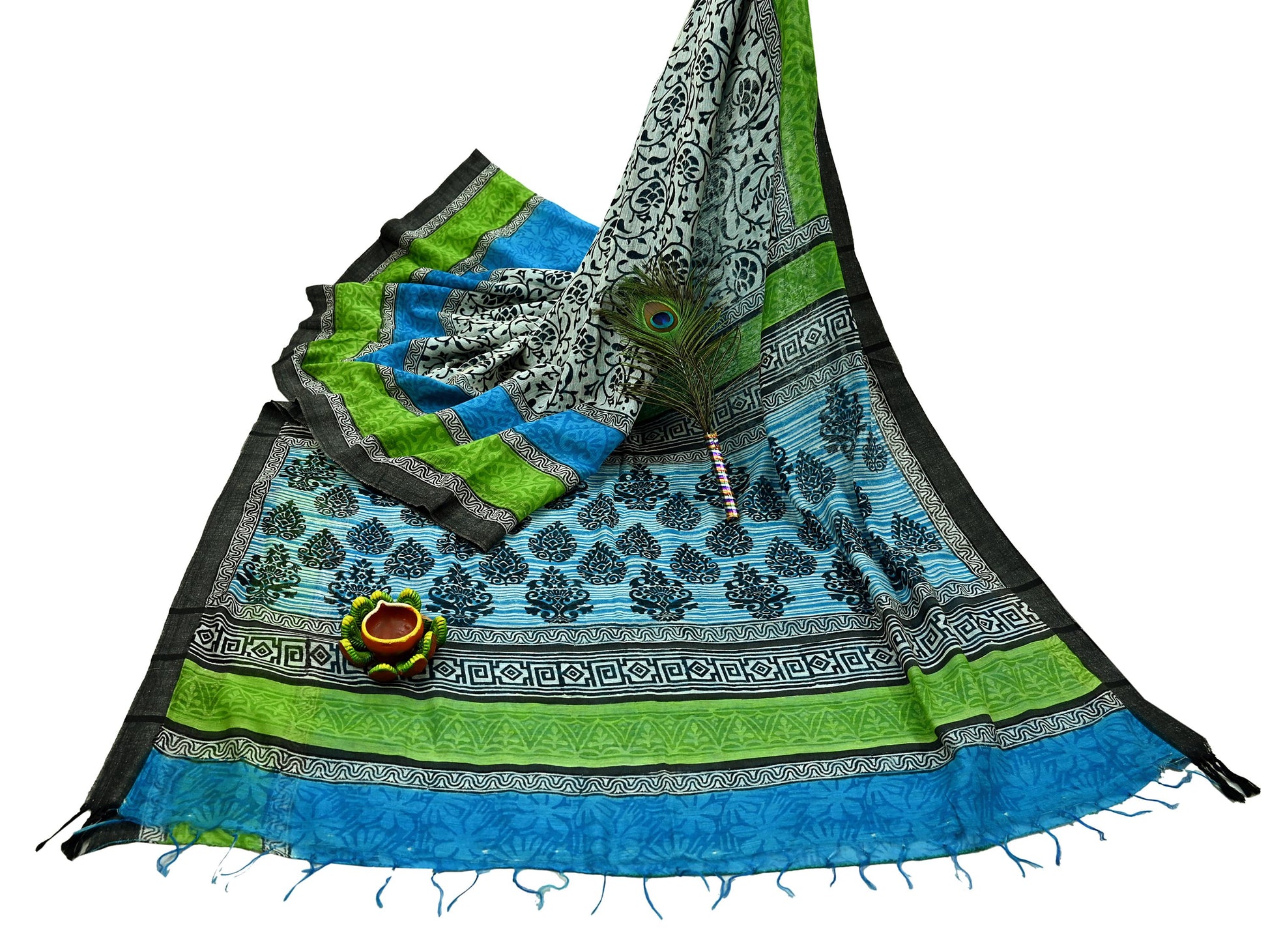 *We offers this vintage White & Blue colored block printed saree which is crafted with 100% Pure Chanderi Silk.