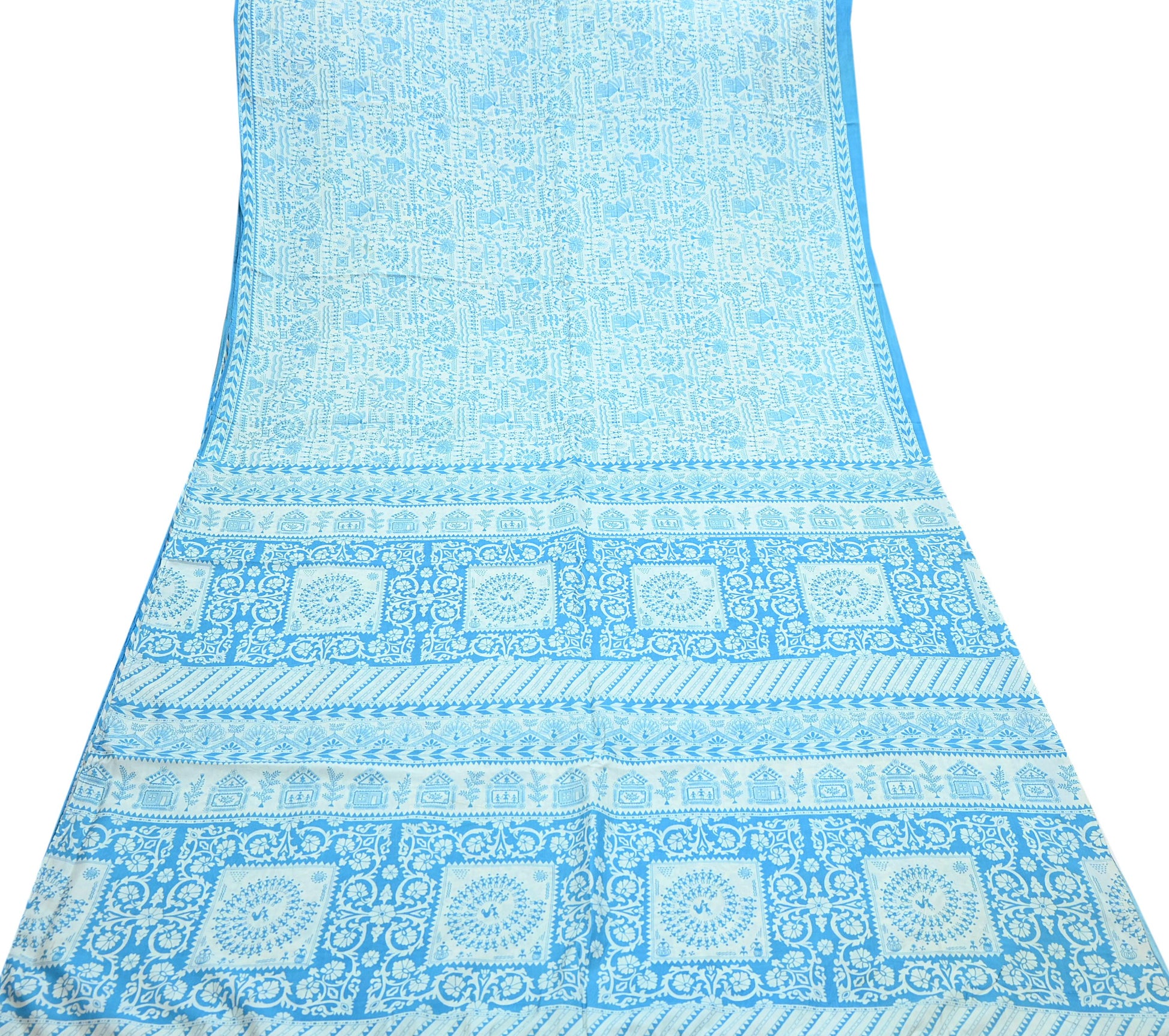 Indian Vintage Sari white & blue Pure Silk warli Printed Saree 5yd Sewing Paisley Craft Fabric DressMaking Soft Used Upcycled