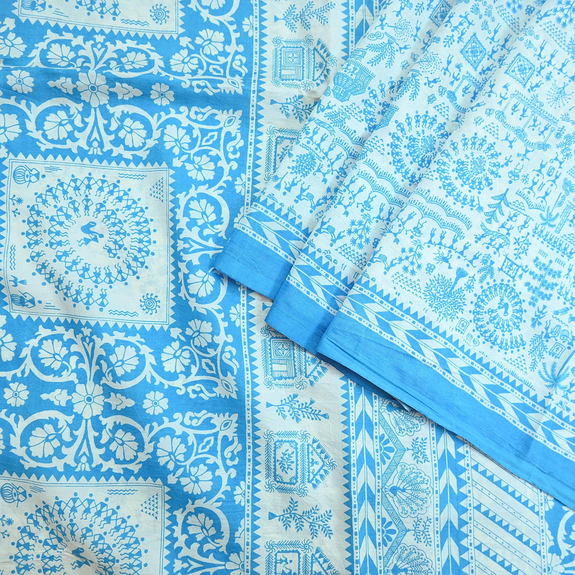 *Attractive white & blue Colored warli Printed Pure Silk Saree.