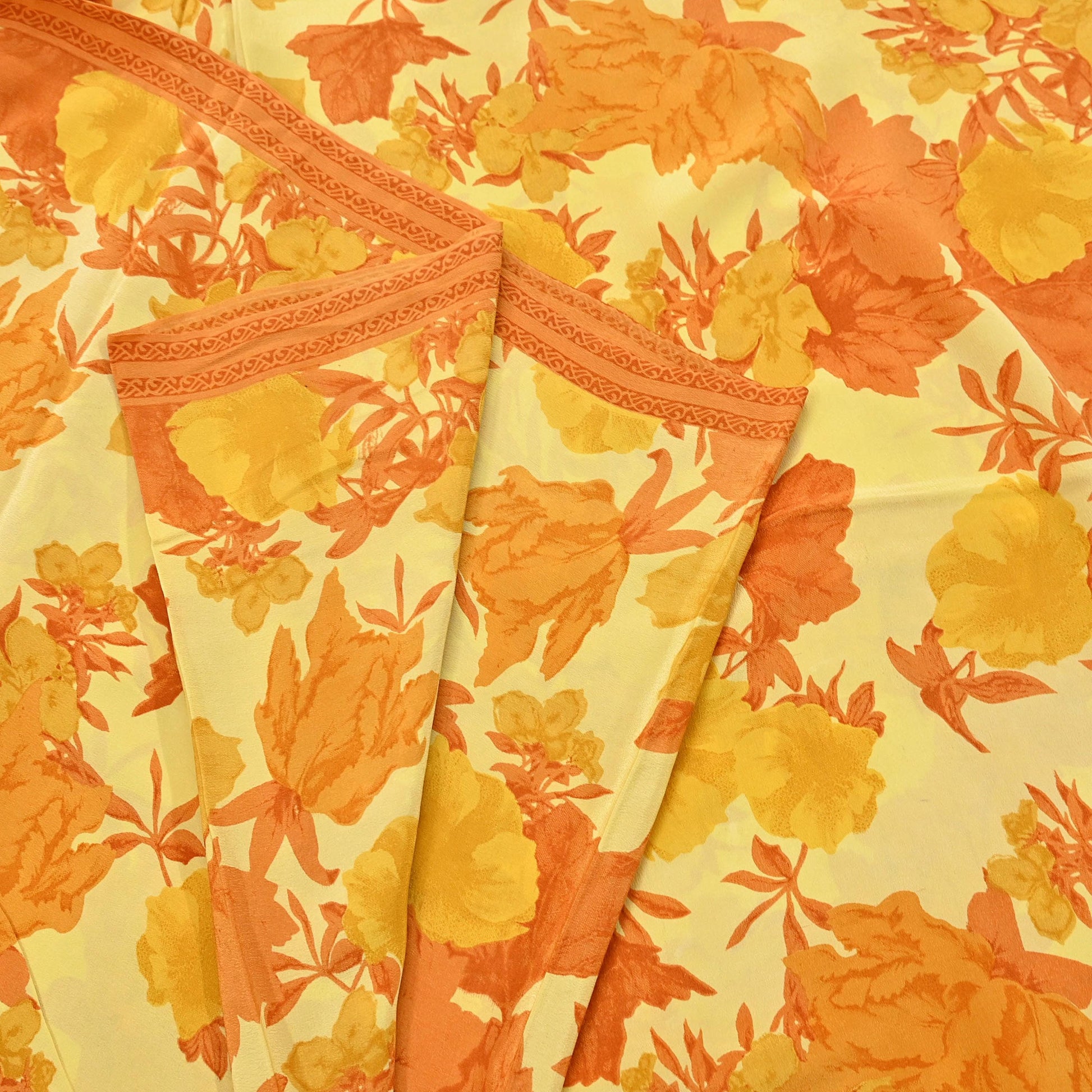 Indian Vintage Sari Yellow Pure Crepe Silk Printed Saree 5yard Sewing Quilting Floral Soft Craft Fabric Wrap