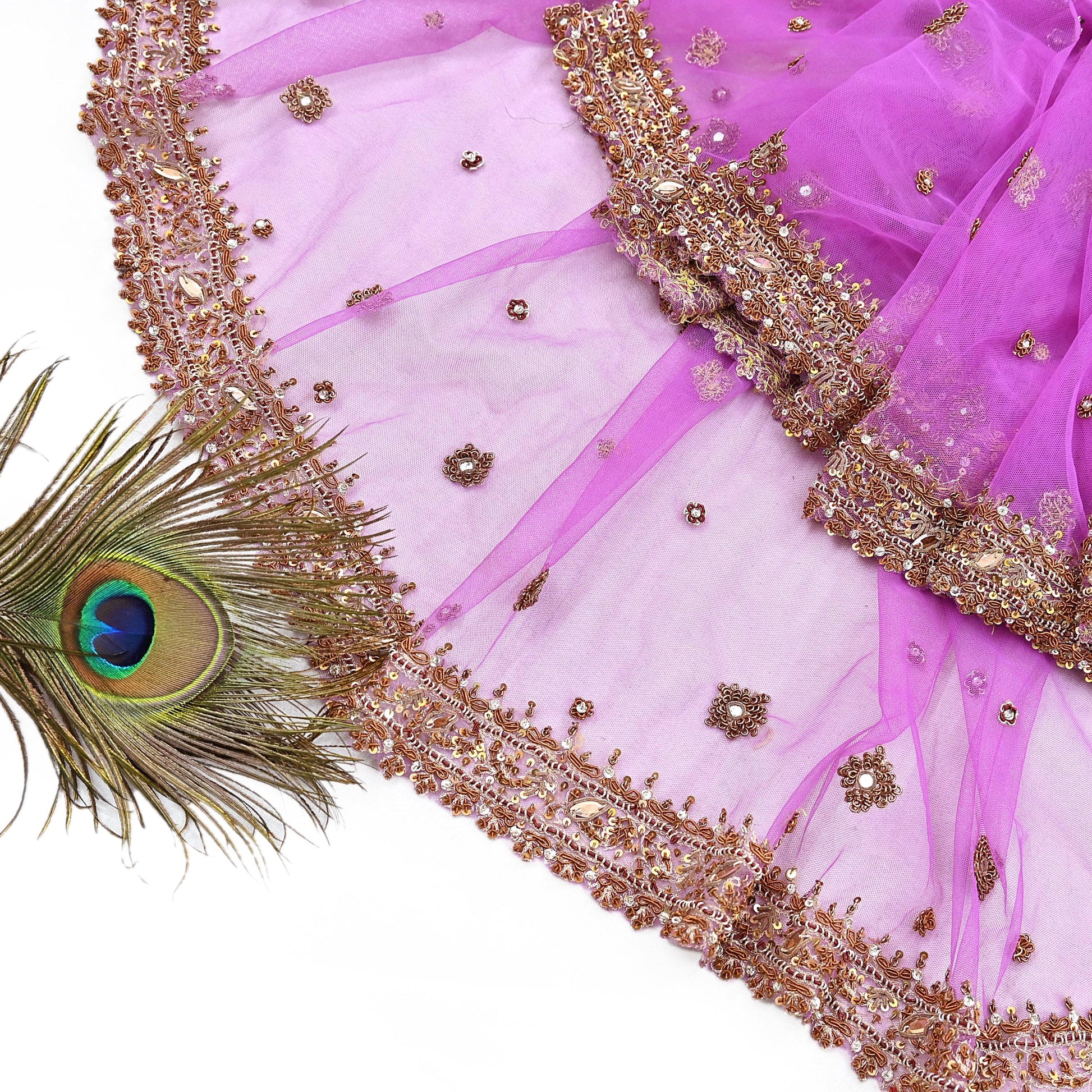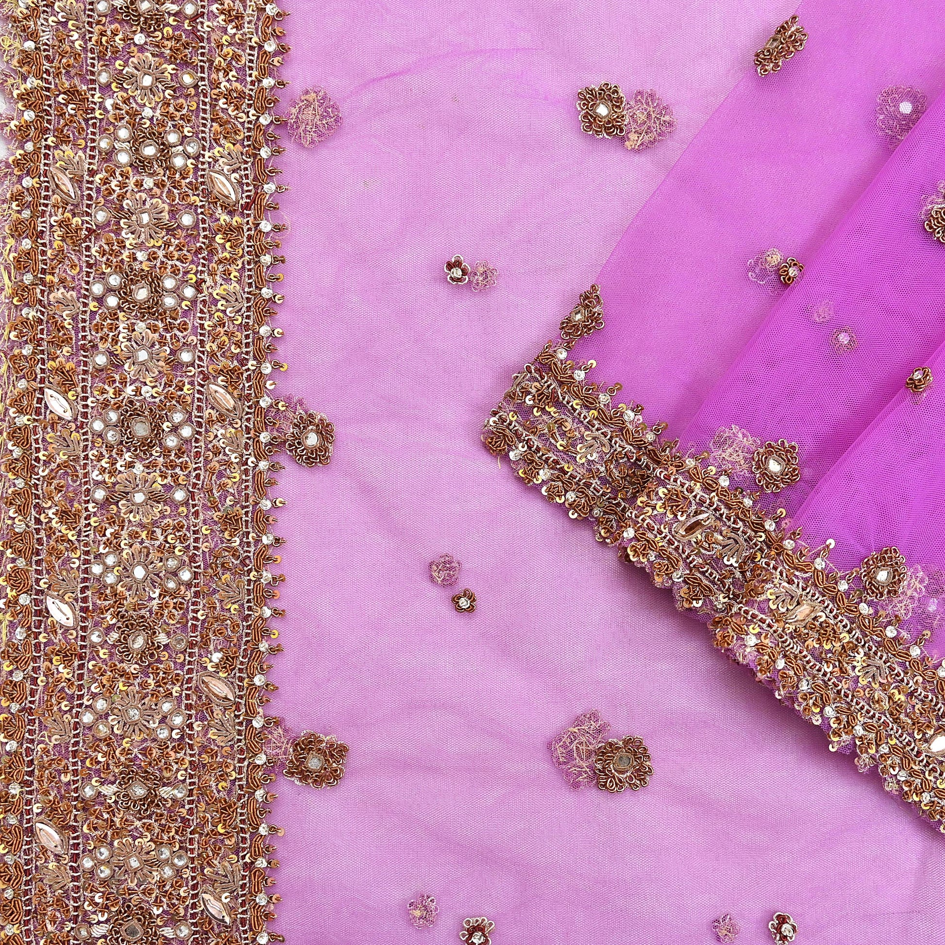 Stunning Beautiful Heavy Dupatta Hand Embroidered Net Dupatta/Stole In Purple Color Fabric. This one of a kind item is difficult to express in words. Border feature is floral & Paisley design embroidered pure metallic copper, maroon & golden zardozi/Zari And Golden & Copper sequins, white stones, mirror work embellished work is the highlight of the dupatta. Also you can see similar Zardozi, Beaded & Multi Sequins work with floral pattern in center part adds to its beauty. Beautiful Border work is giving a fabulous look to the dupatta. Awesome one !!!