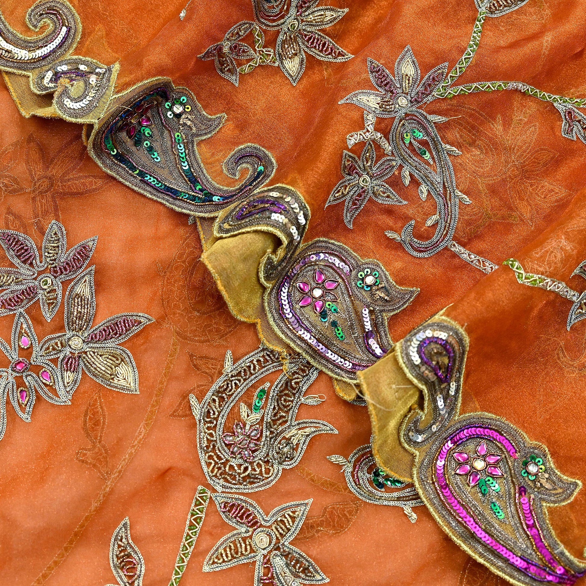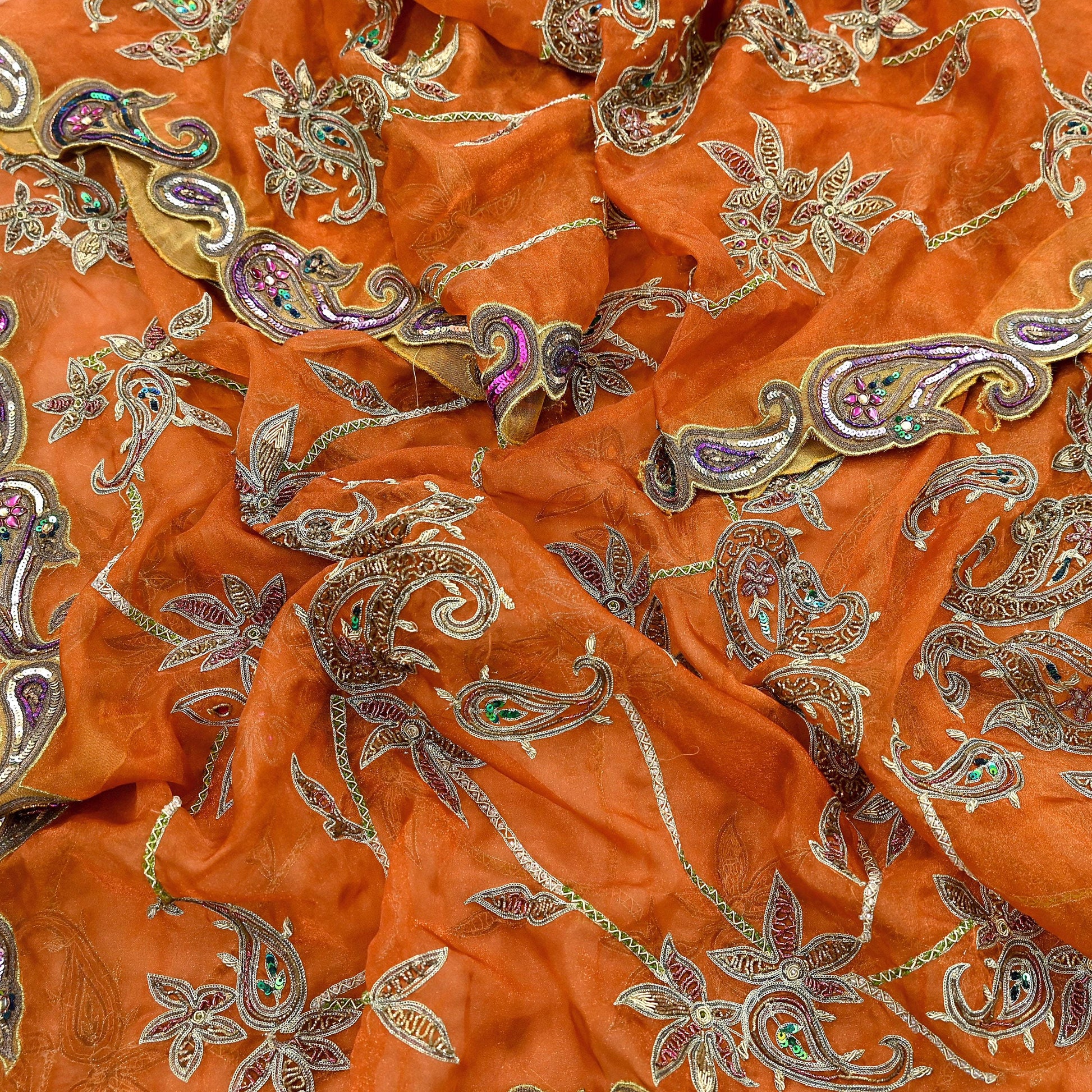 Stunning Very Heavy Dupatta Hand Embroidered Tissue Silk Dupatta/Stole In Orange Colored Fabric. This one of a kind item is difficult to express in words. Border feature is Paisley design embroidered Multi & Golden Zardozi/Dabka Zari, Golden,Green,Purple Sequins, Purple Kundan, Green & White work embellished work is the highlight of the dupatta. Also you can see similar work with Paisley pattern in center part adds to its beauty. Golden Border work is giving a fabulous look to the dupatta.